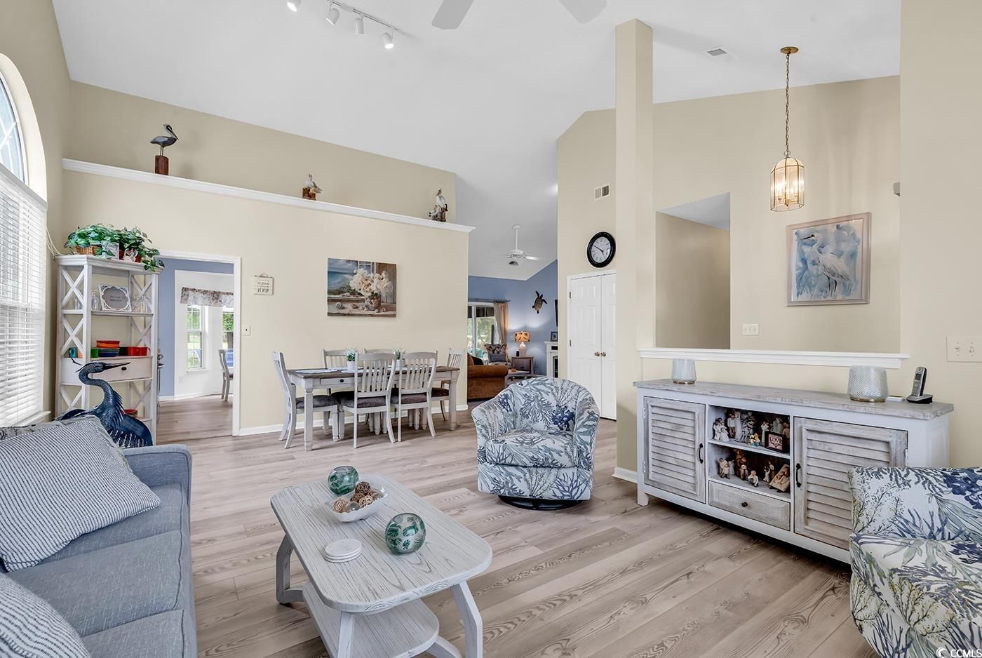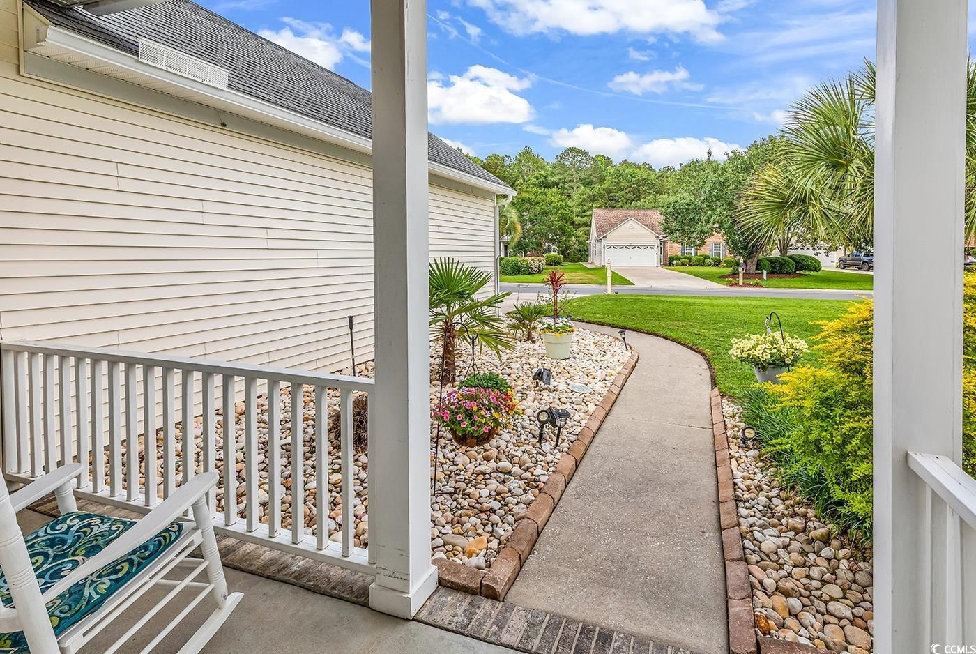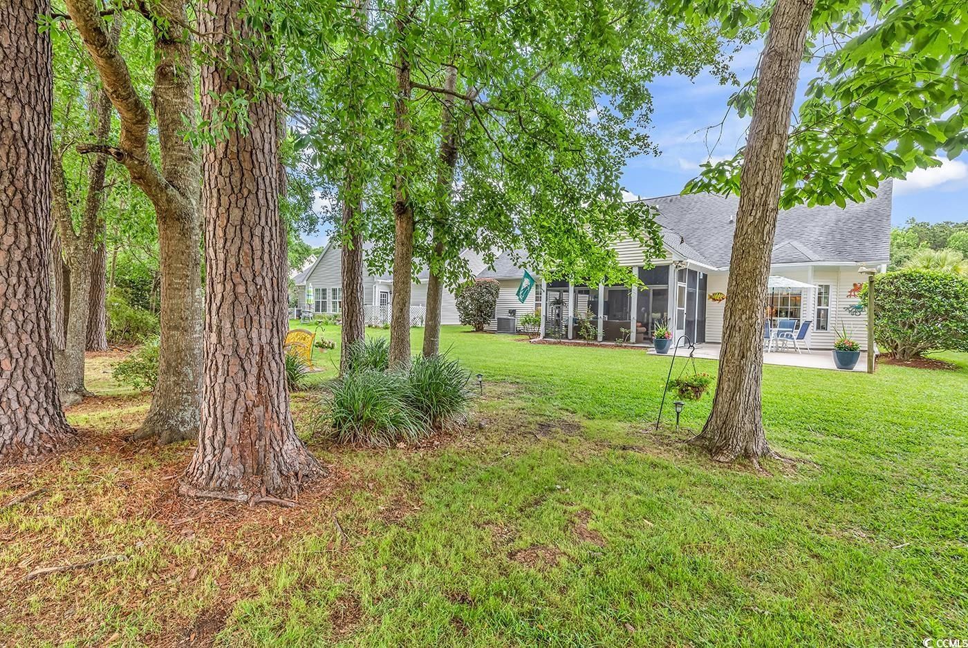 Welcome home to 1445 Winged Foot Court, overlooking the 16th fairway of Indigo Creek Golf Course! This 3 bedroom 2 bathroom home offers a peaceful retreat inside and outside the home, all while being perfectly situated in one of the areas most coveted neighborhoods. As you pull in the driveway, you'll appreciate the beautiful landscaping with palm trees and river rocks, easily maintained by the five zone sprinkler system. Entering the home, you'll love the vaulted ceilings that allow plenty of light to pour in. There is a family room that offers plenty of space for dining and gathering, that leads to the large kitchen and living room. The kitchen boasts newer stainless steel appliances, lovely tile backsplash, pantry and a breakfast nook situated at the bay window. The vaulted living room leads to the screened porch, outfitted with EZ Breeze windows and a ceiling fan, making it the ideal escape anytime of year. The large primary suite offers his and hers walk-in closets and double doors leading to the room and to the en suite bathroom. Vaulted ceilings continue in the primary bathroom with soaking tub, step in shower, water closets and dual sink vanities. A split bedroom floorplan offers two more bedrooms, a full bathroom, and laundry room that leads to the two car garage. The home boasts a 2025 HVAC, gutters on the back of the home, an extended patio, new comfort height toilets, a transferrable termite bond, and one of the best lots in the community. The backyard will truly be your peaceful escape, and you'll enjoy walking on the golf course in the evenings. This home is just minutes from some of the area's best dining, entertainment, beaches, and is part of the award winning St. James school district. Make sure you take the virtual 3D tour and schedule your showing today!