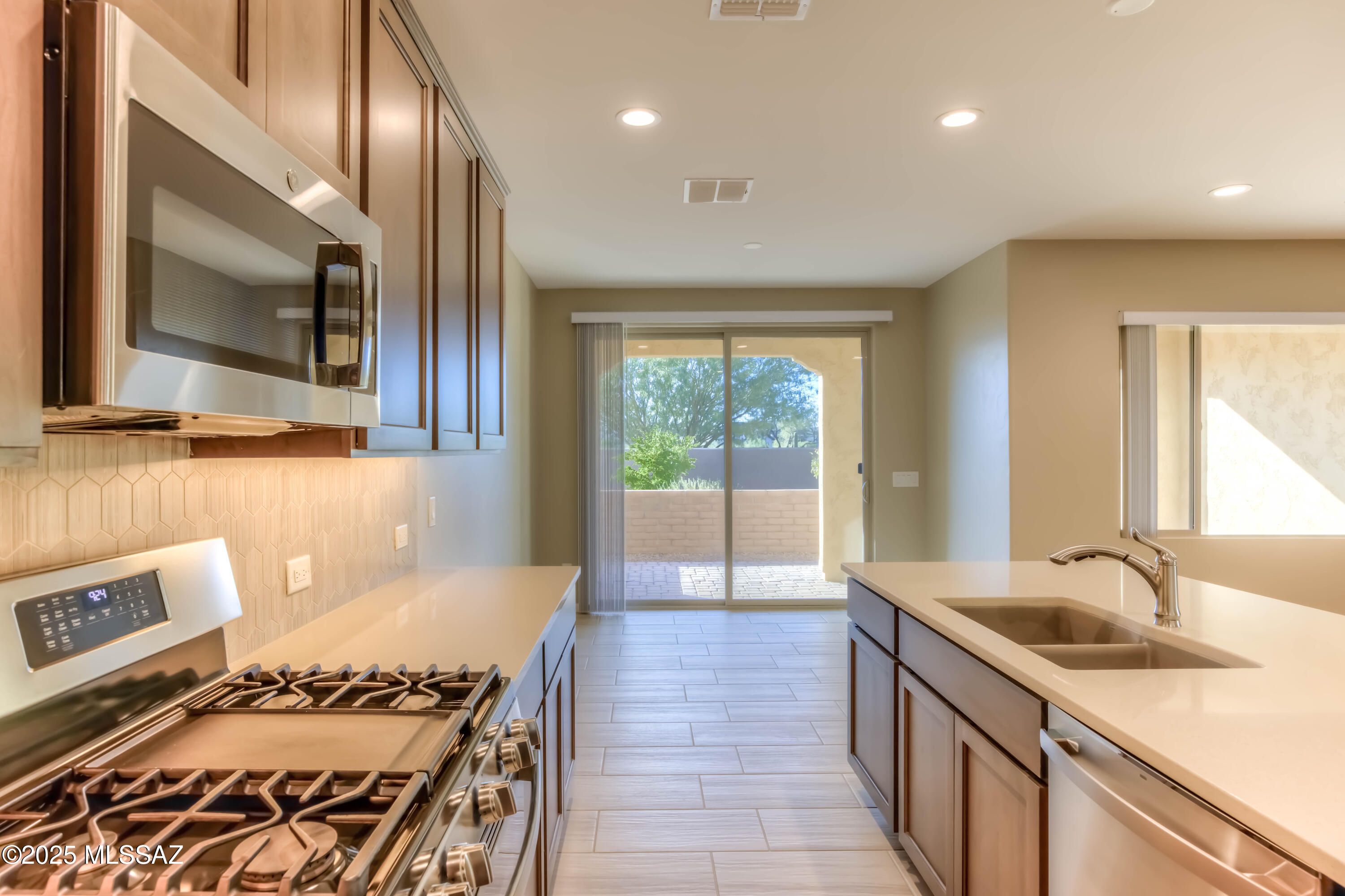 Stunning almost new villa in the luxury, gated, Quail Creek active adult community. Step inside to an open floor plan including 2 bedrooms, 2 full baths and a den. The kitchen is stunning with granite countertops, island, gas range, and recessed lighting. The owner's bedroom is spacious, and the ensuite bath features a beautiful walk-in shower and large closet. The back patio is perfect for grilling and drinking coffee while admiring the stunning mountain views. Low maintenance as the HOA covers landscaping and leaves time to enjoy all of the amenities the Quail Creek Golf community has to offer! Amenities include the new Canyon Club, The Grill, Madera Clubhouse, pickle ball, tennis, pools, spa, fitness center, Arts & tech center, dog park, golf & more! Welcome Home.