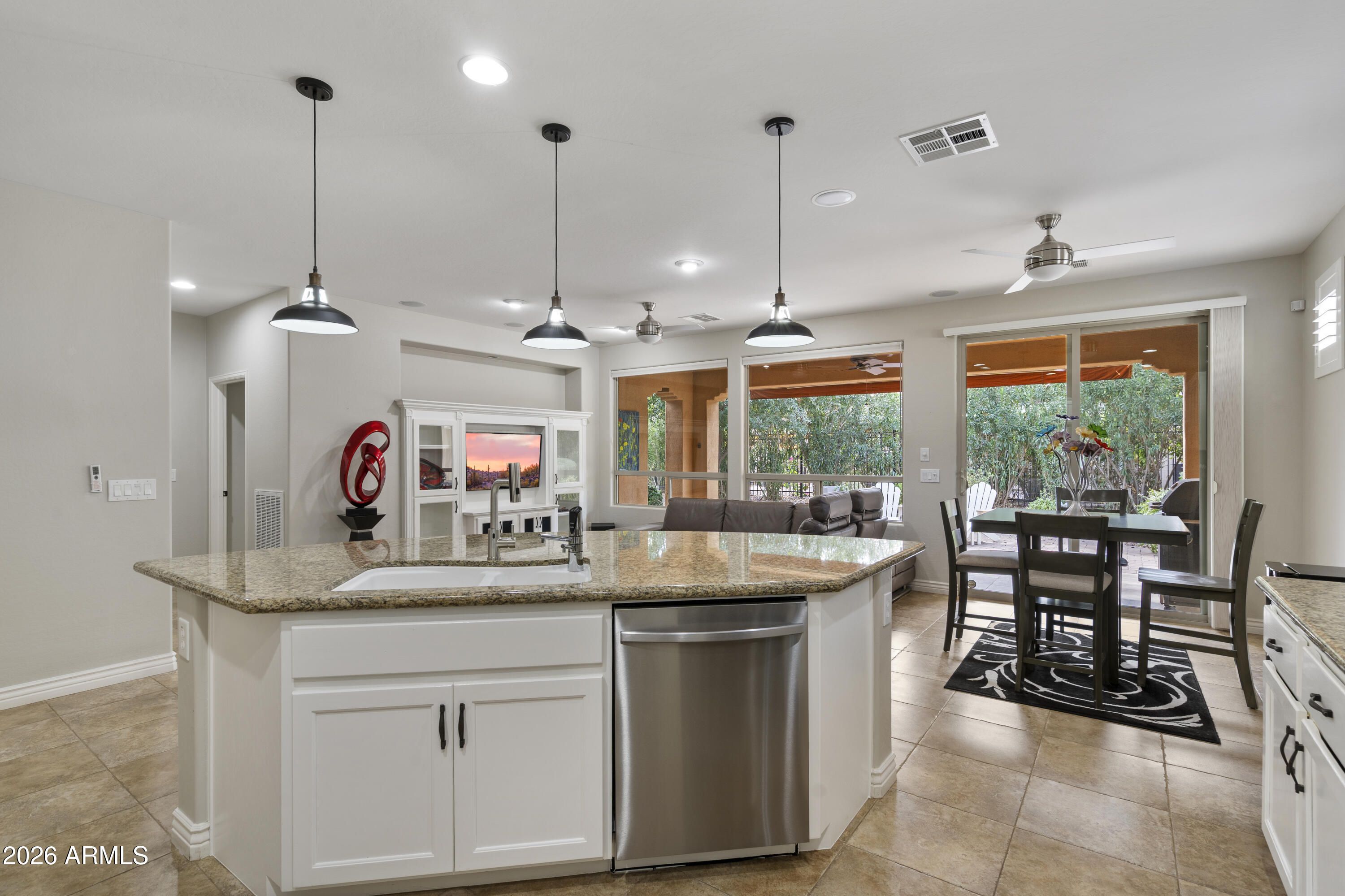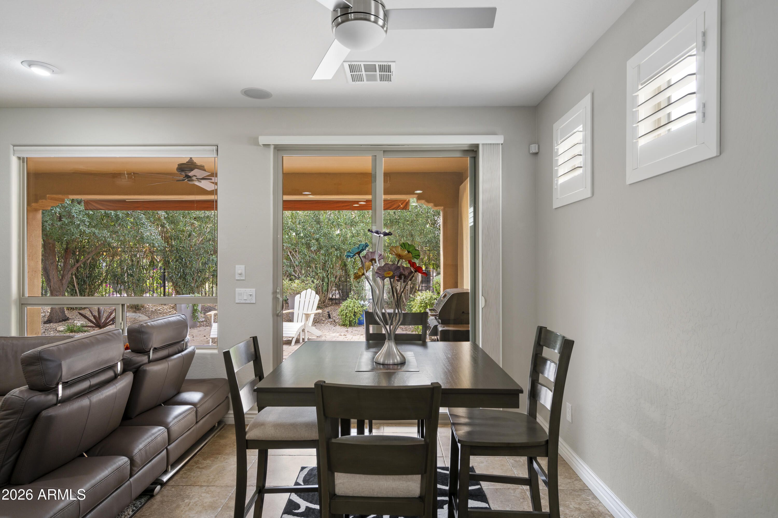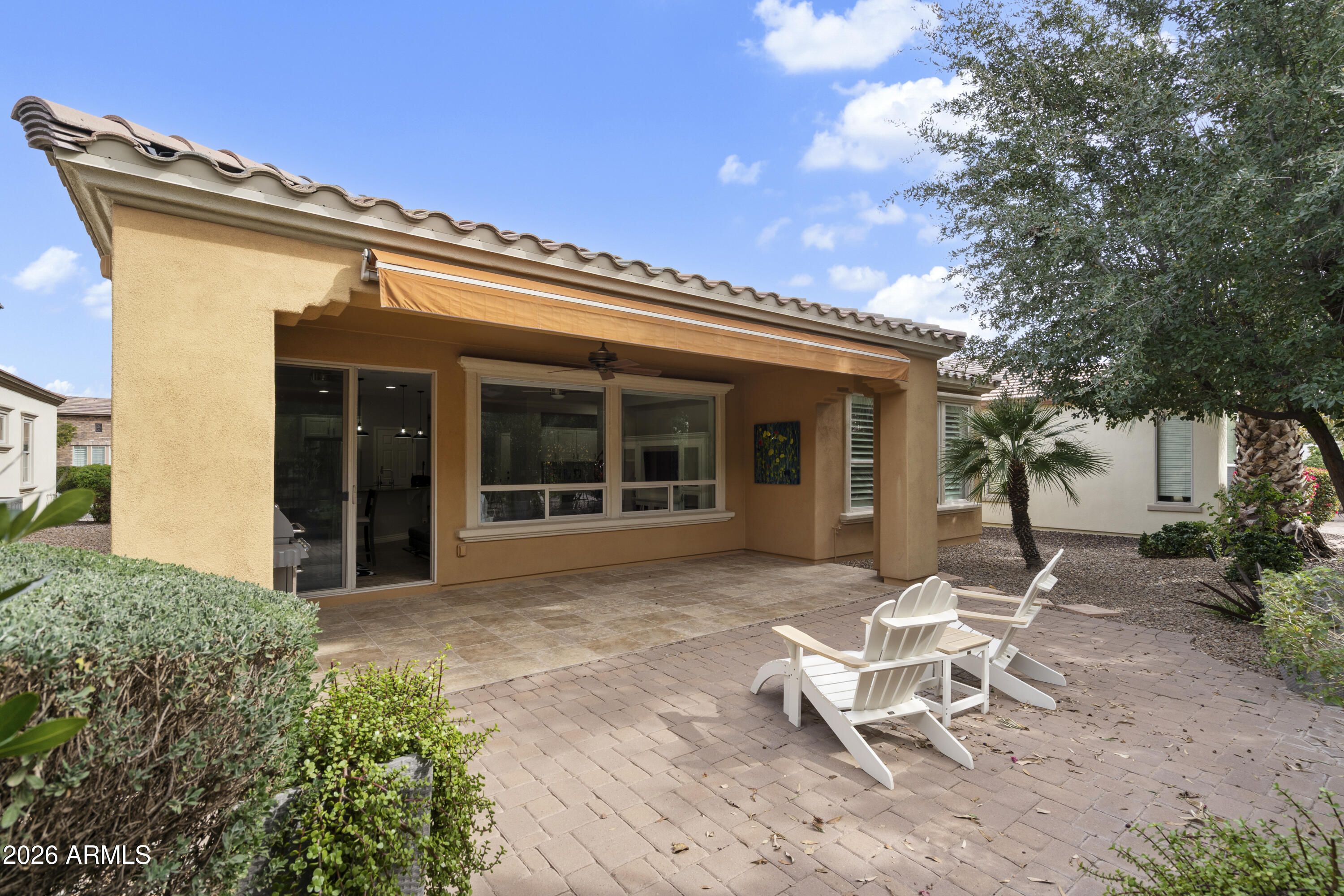 Encanterra Resort Style Gated Community, 2 bed, 2 bath split floor plan home offers comfort, privacy, Enjoy access to championship golf, pools, dining, fitness & endless community activities. Home features include plantation shutters, electric window coverings, built ins at the office area, Built-in Murphy Bed & wired home theater surround sound. Kitchen offers granite countertops, glass display cabinetry, newer stainless-steel appliances, and whole home water treatment system with reverse osmosis & custom filtration at the kitchen sink. The spacious mature backyard is ideal for entertaining and includes a gas stub for an outdoor BBQ. Extended garage provides an additional 4 feet of space, added insulation, epoxy flooring, & additional storage cabinets. Walking paths just steps away.