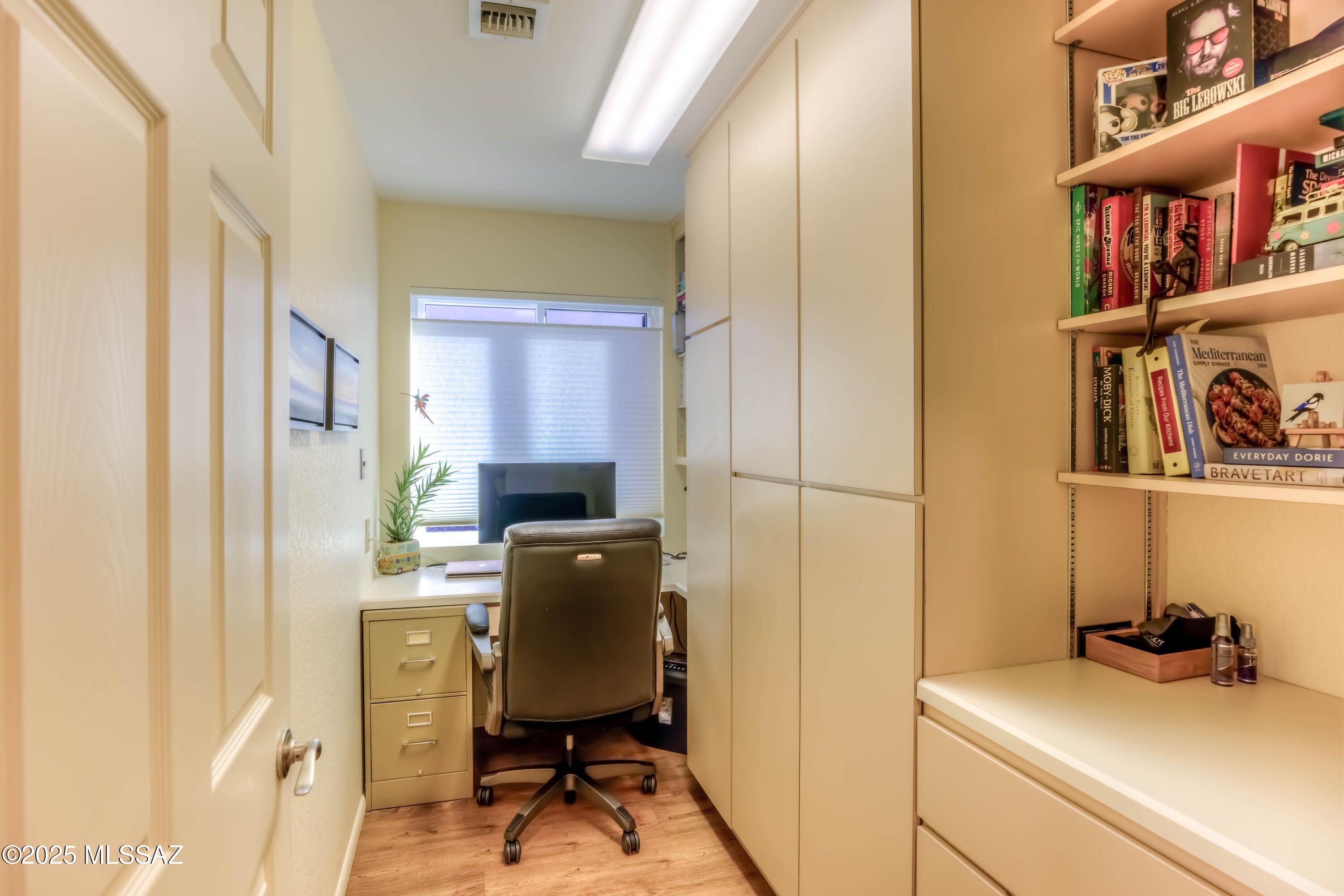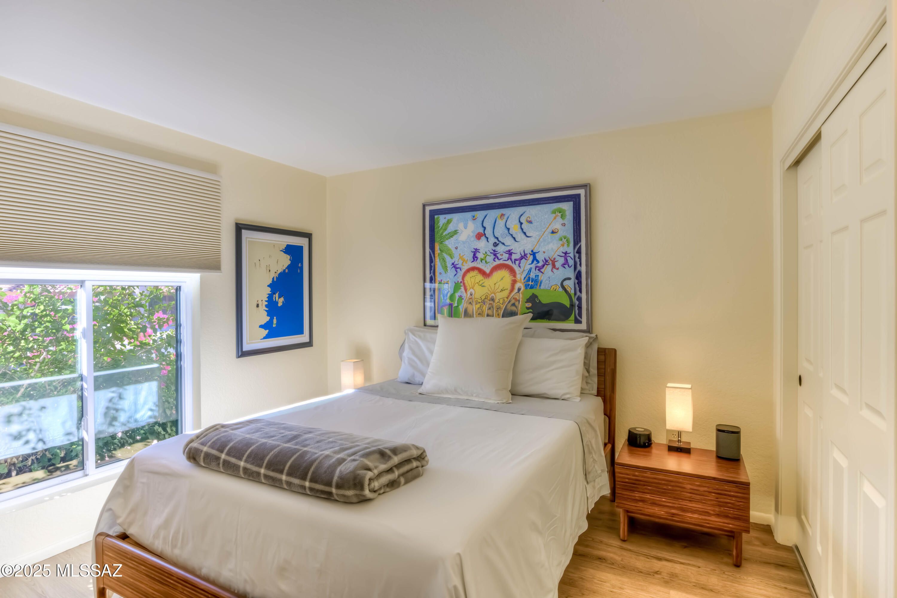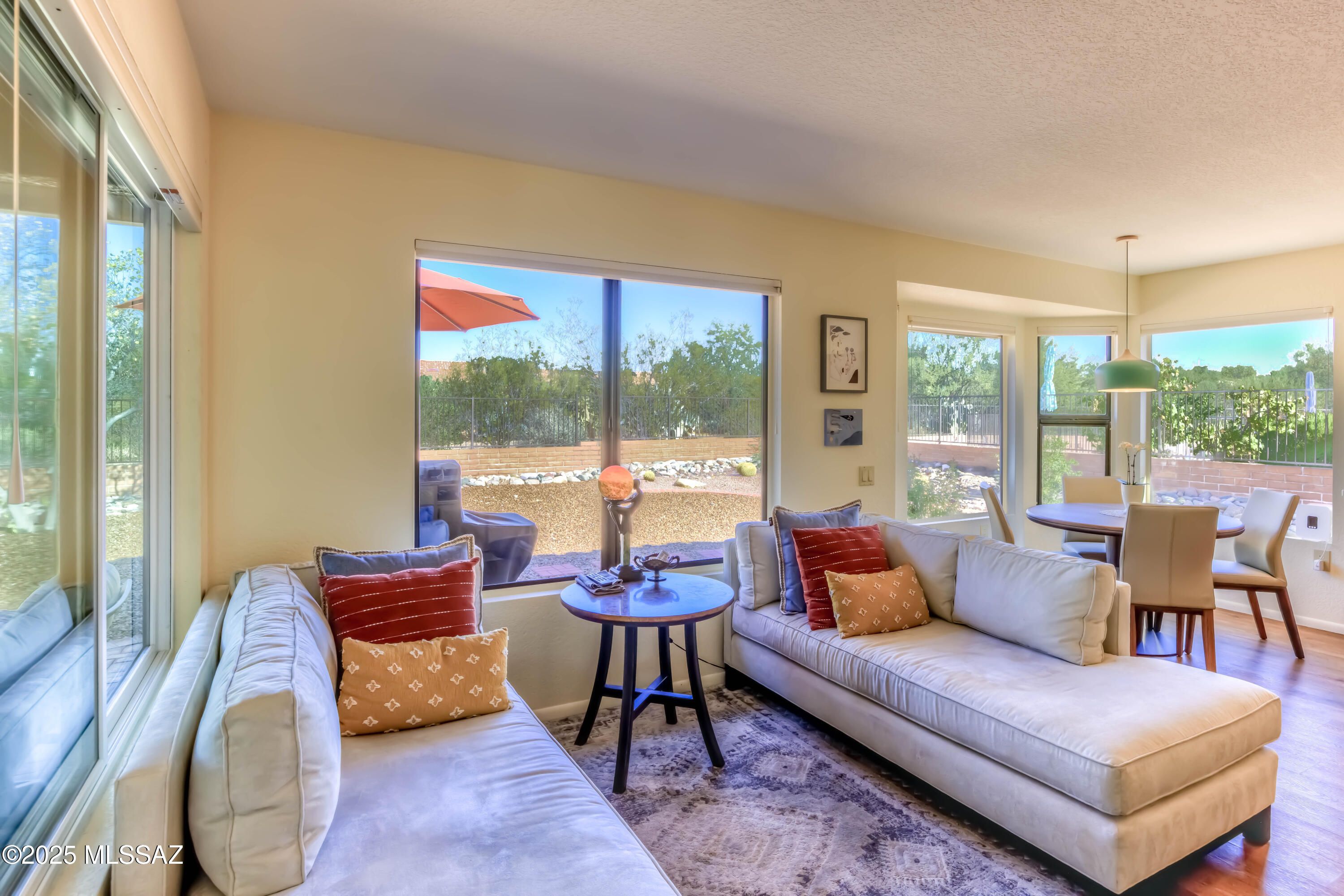 Brand new owned solar enhances this beautifully maintained Silvercreek model, offering a fully fenced backyard retreat with exceptional privacy and picturesque desert views. The primary suite is a serene escape with a bay window framing the lush yard, while new blinds throughout complement the bright, open spaces and updated LPV flooring. The chef's kitchen features ample cabinetry, updated stainless steel appliances, and a cozy nook overlooking the tranquil backyard. The living area provides space for dining and includes a new picture window showcasing Catalina Mountain views. A large sliding door opens to a paver patio, perfect for relaxing or entertaining. This home combines energy efficiency, thoughtful updates, and stunning views in a peaceful setting you'll love coming home to.
