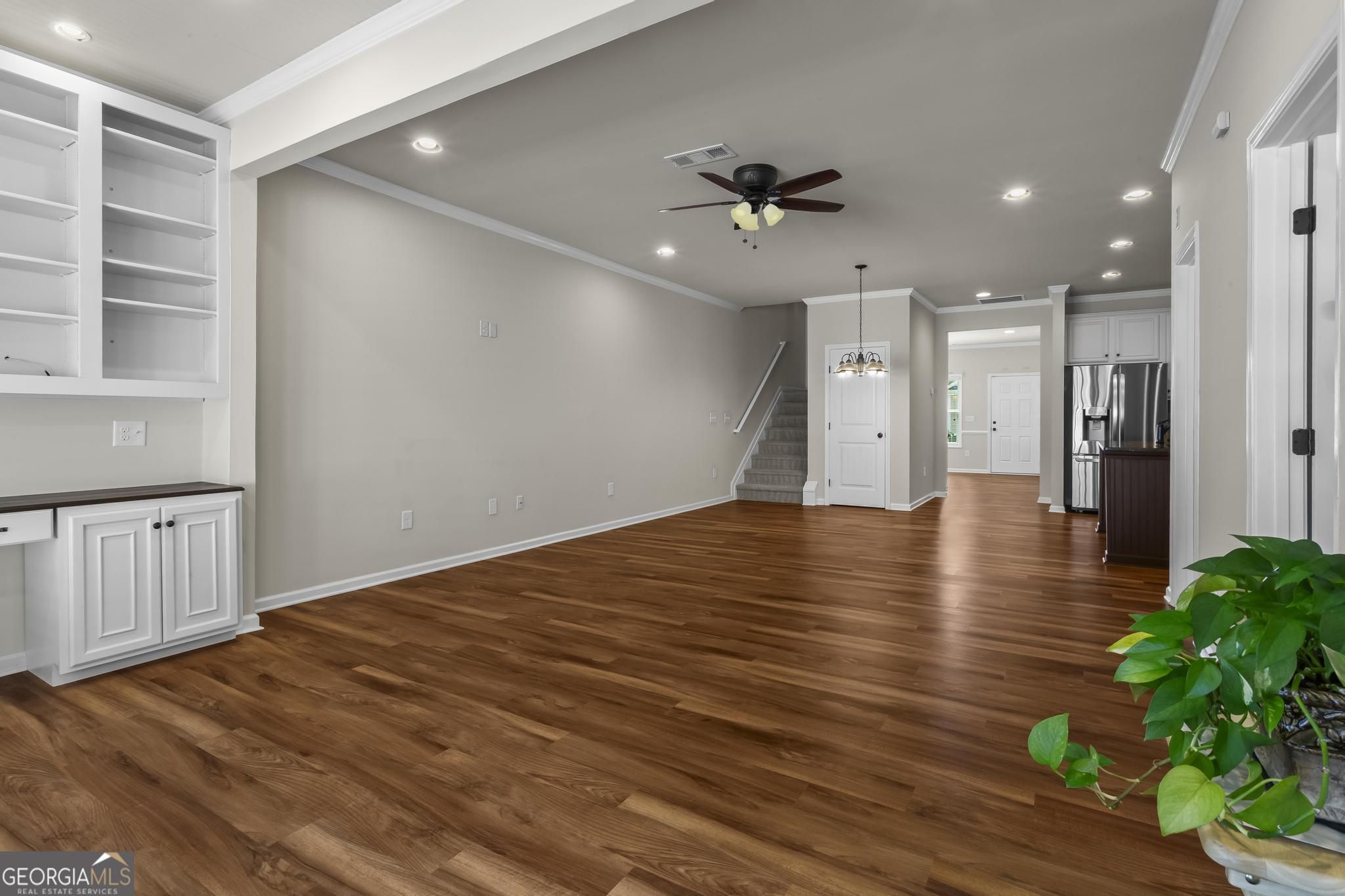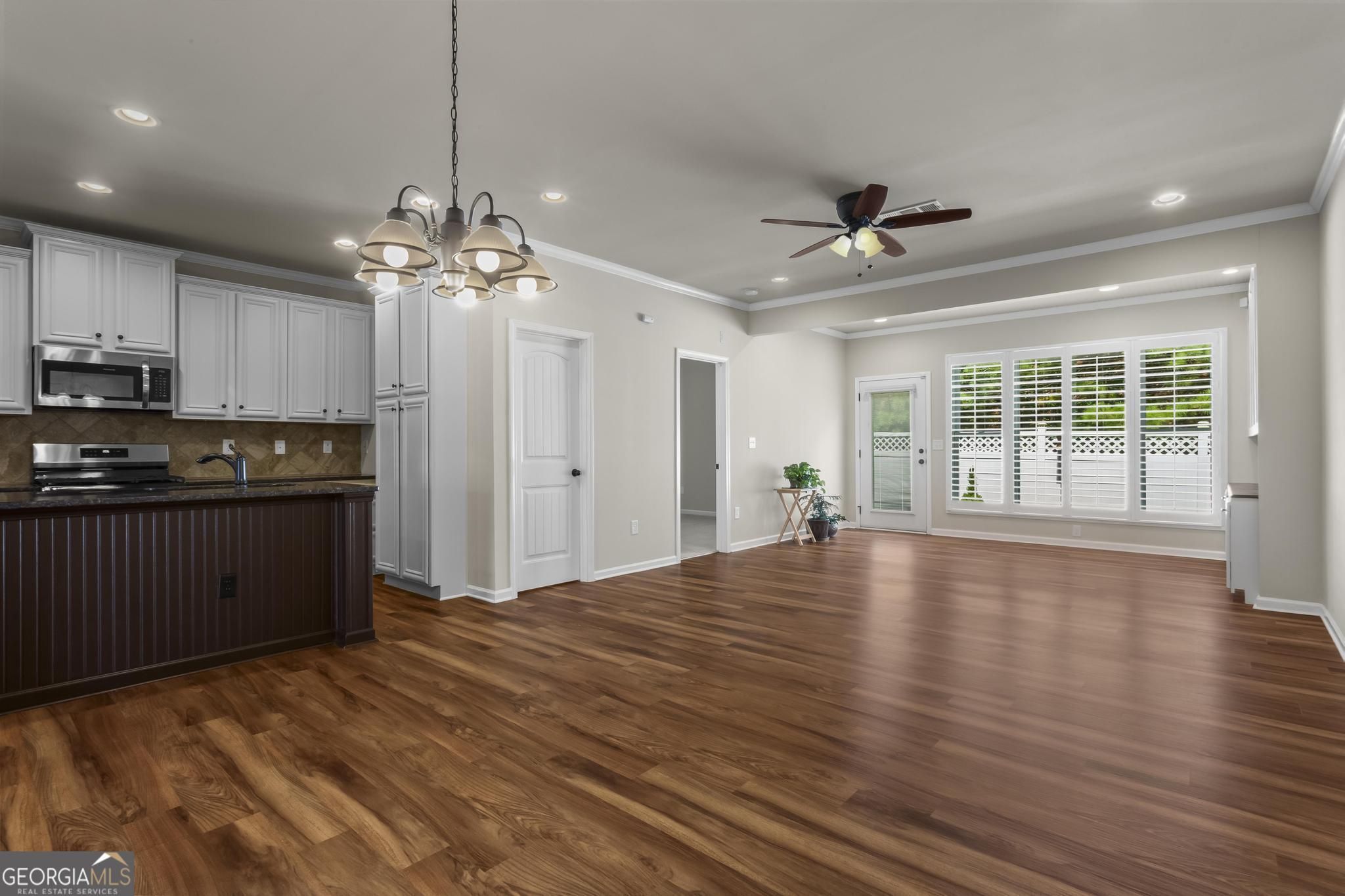 Welcome to the very best of The Villages at River Pointe-one of the area's most sought-after 55+ active adult communities! This beautifully maintained home blends comfort, style, and convenience. Step inside to an inviting open-concept design with gleaming hardwood floors throughout the main living area. A light-filled sunroom-style nook with custom built-ins is the perfect spot for morning coffee, overlooking the professionally landscaped patio, fully fenced backyard, and peaceful views. The chef's kitchen features timeless white cabinetry, granite countertops, recessed lighting, and a spacious island-all open to the living and dining areas for effortless entertaining and everyday ease. The main-level owner's suite is a true retreat with a tray ceiling, spa-like ensuite bath with walk-in shower, dual granite vanities, and generous walk-in and linen closets. Upstairs, two spacious bedrooms and a full bath offer flexible space for guests, an office, or hobbies. Beyond the home, you'll love the vibrant lifestyle The Villages at River Pointe offers-an active clubhouse, planned social events, and easy access to shopping, dining, and North Georgia's best attractions. Enjoy low-maintenance living in a welcoming community designed for connection, relaxation, and fun!