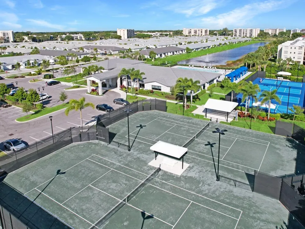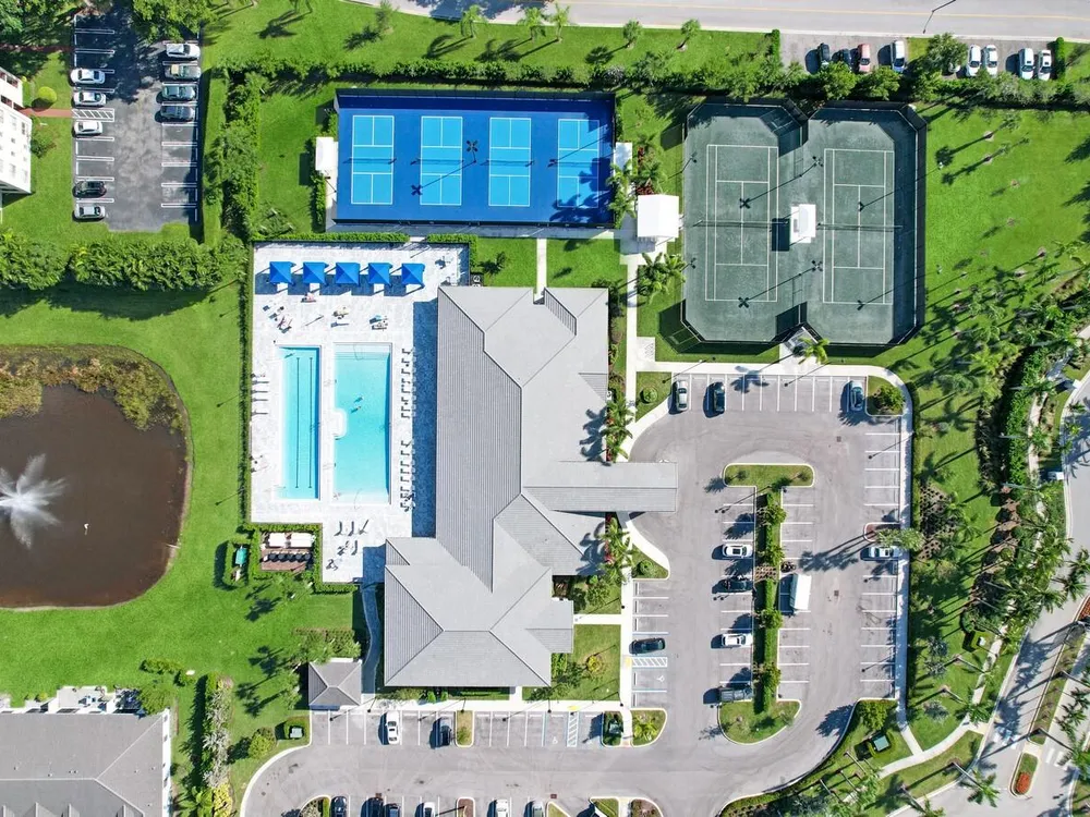 - Clubhouse, Community Room, Fitness Center, Pickleball, Pool, Tennis Court(s)