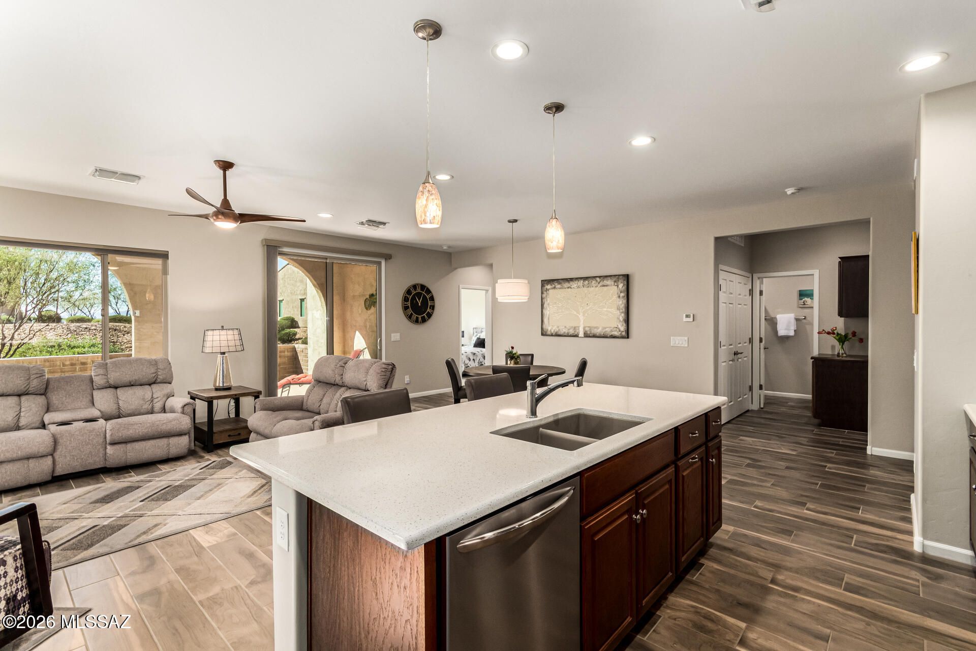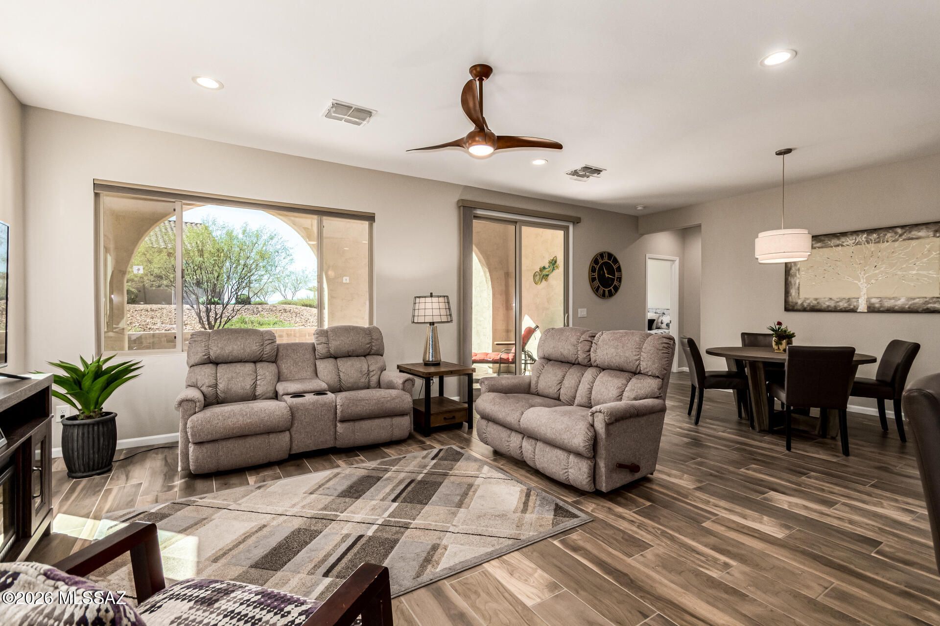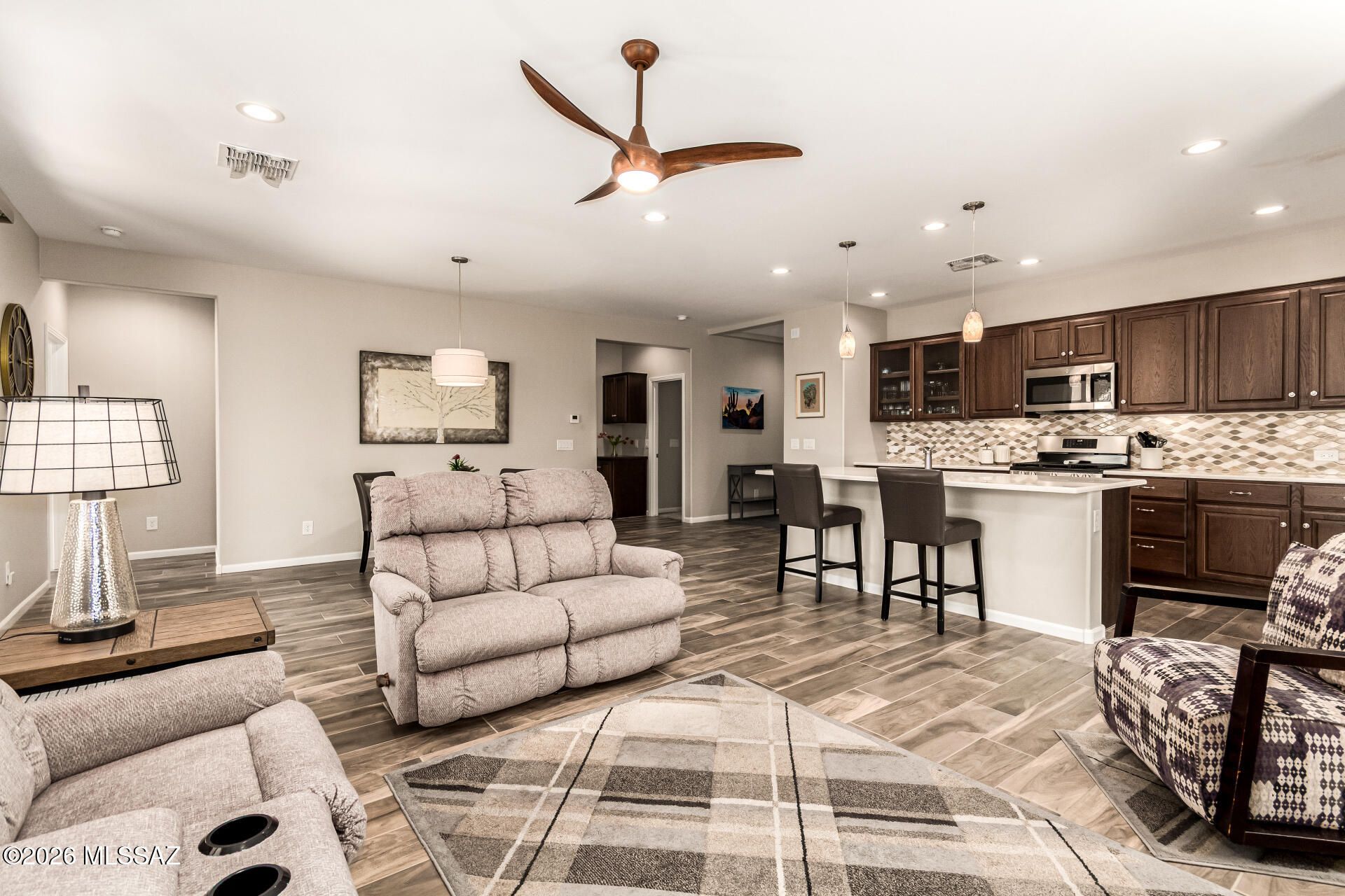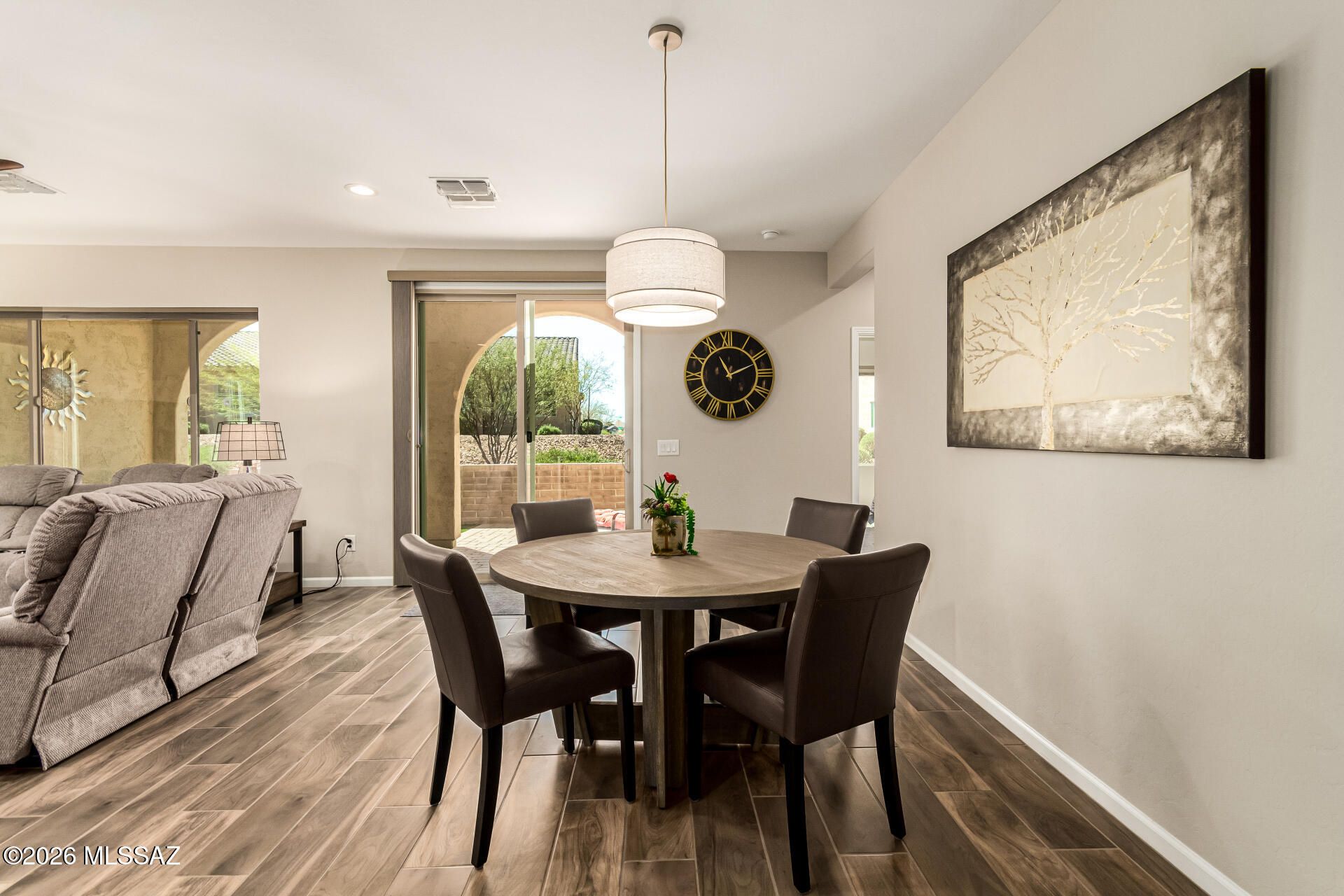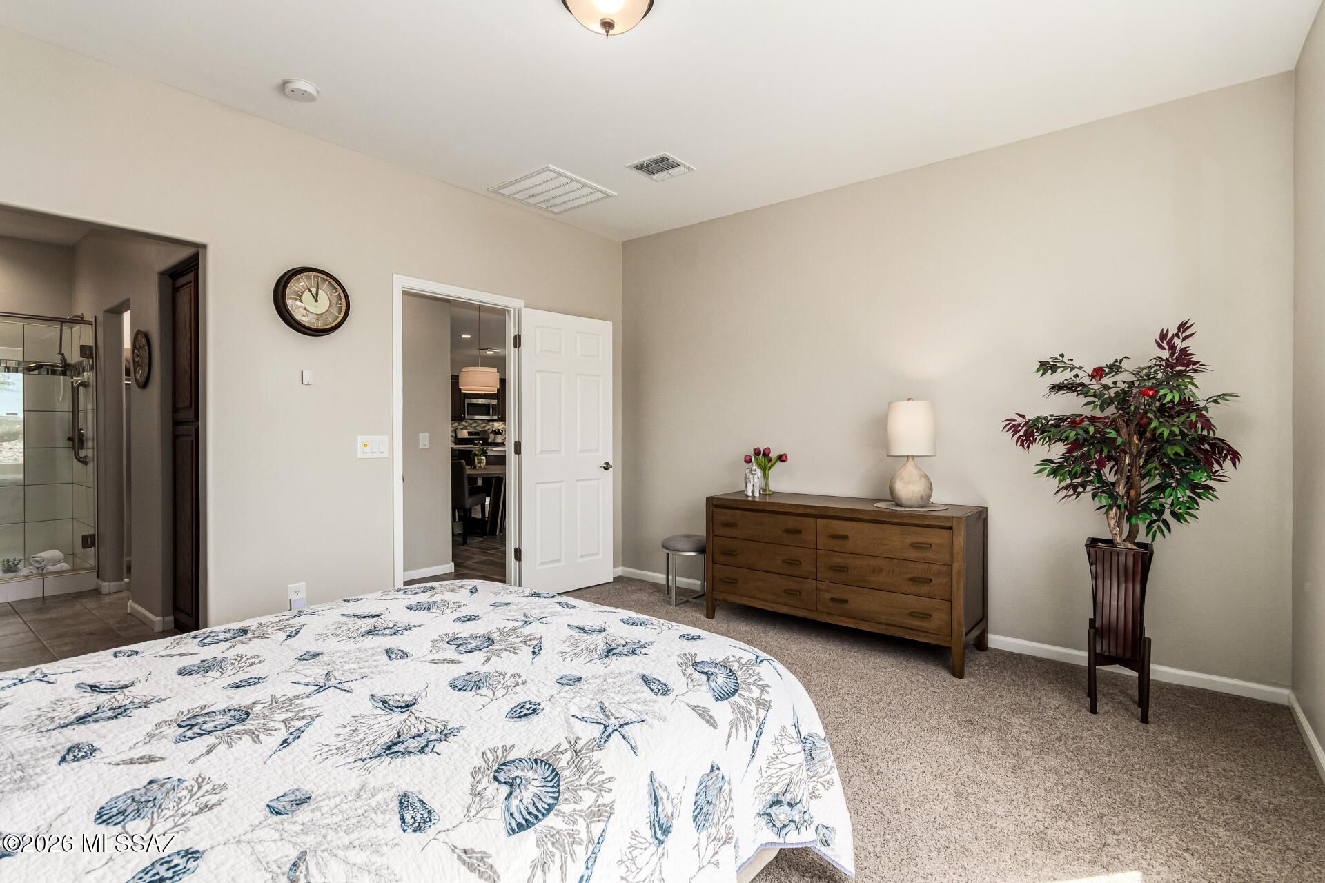 This beautifully designed home in 55+ Quail Creek offers comfortable desert living with modern style and convenience. The single-story Villa features approximately 1286 square feet of living space designed with an open-concept layout ideal for both everyday living and entertaining. The bright great room flows seamlessly into a well-appointed kitchen with an island, ample cabinetry, and modern appliances. The spacious primary suite includes a walk-in closet and an en-suite bath with dual vanities. A 2 car garage and low-maintenance landscaping add to the home's practicality. Residents enjoy access to resort-style amenities including golf, fitness facilities, pools, and a variety of social activities, all set against the scenic Santa Rita Mnts. Fully furnished. Roof/landscaping in HOA dues.
