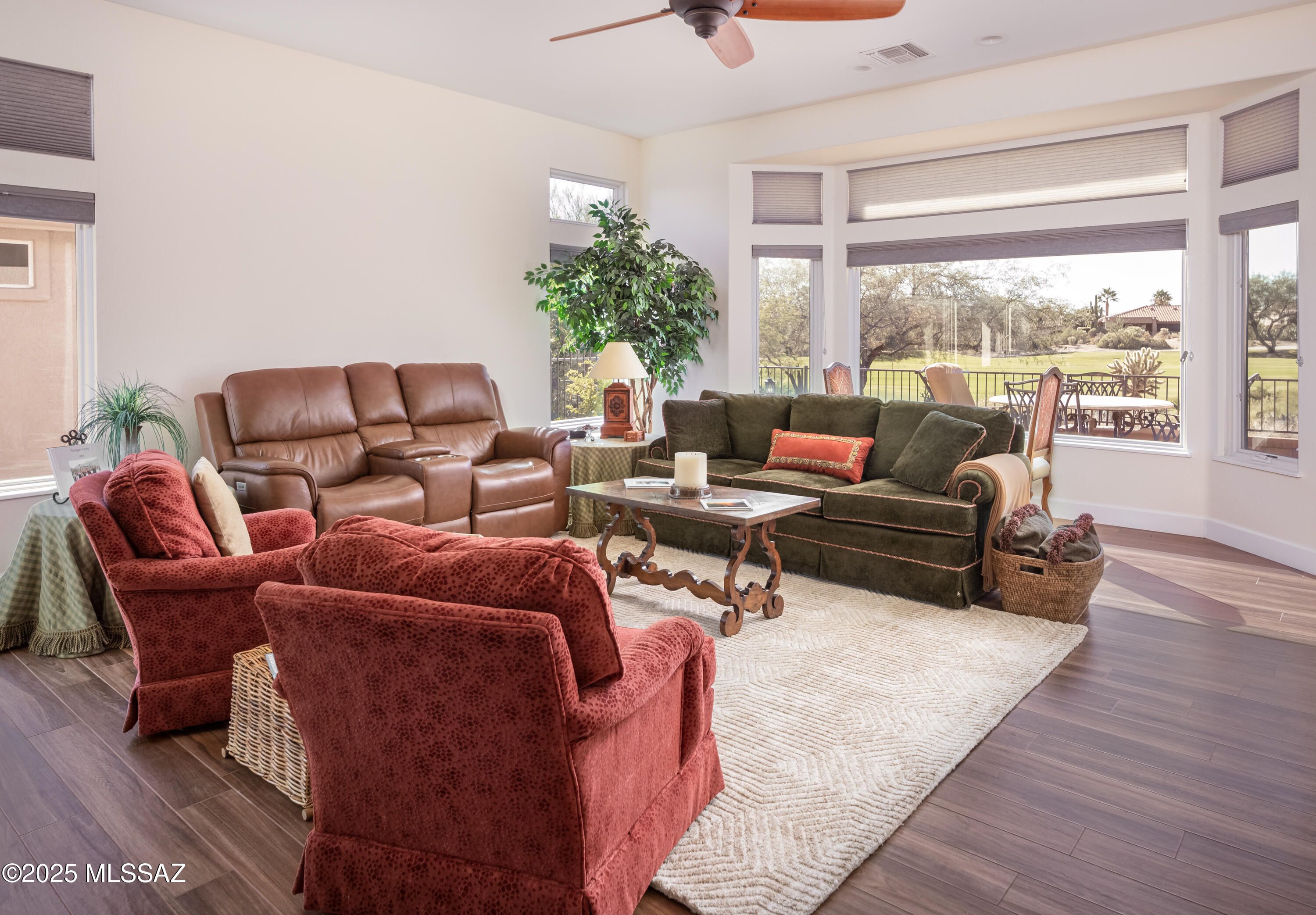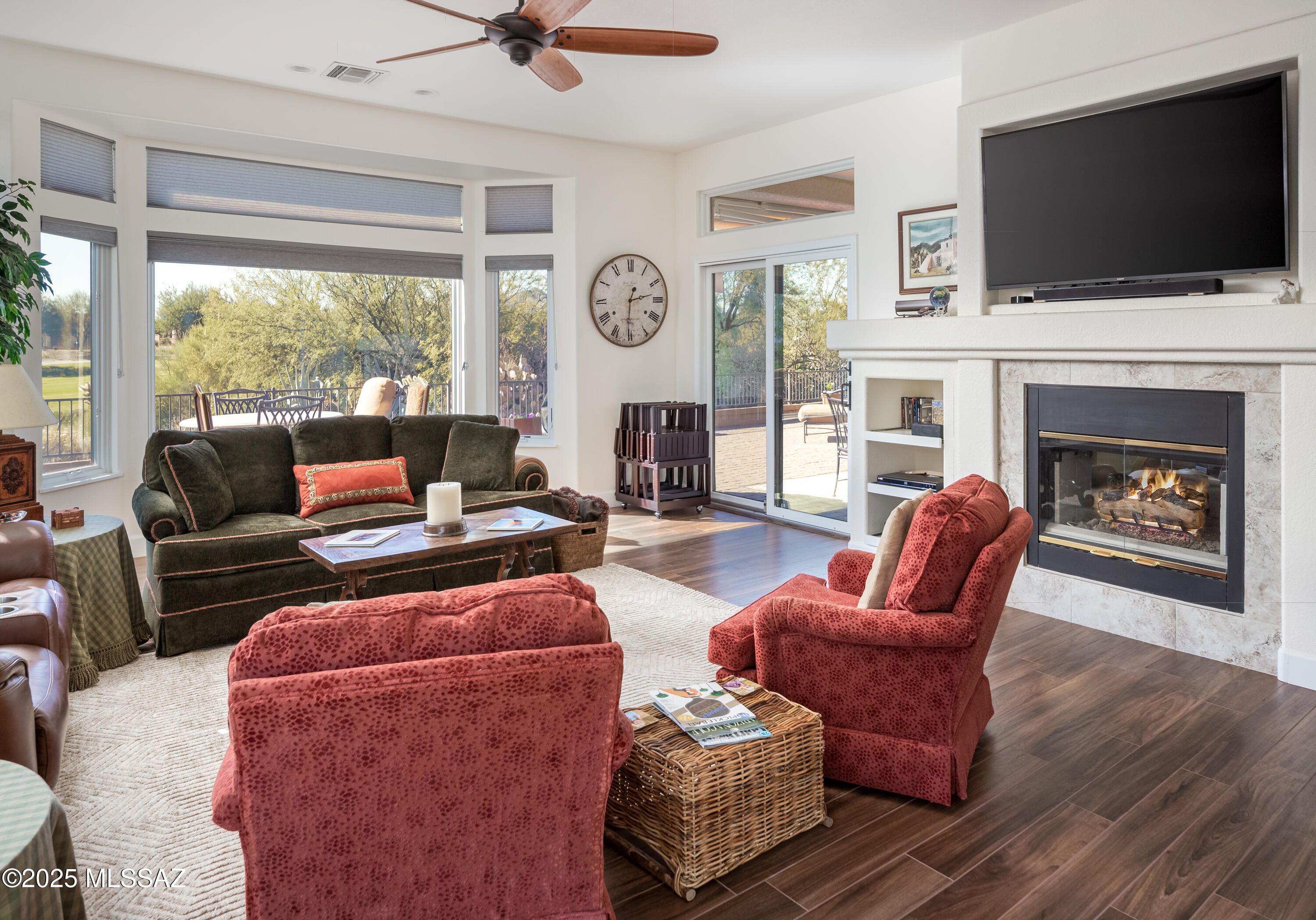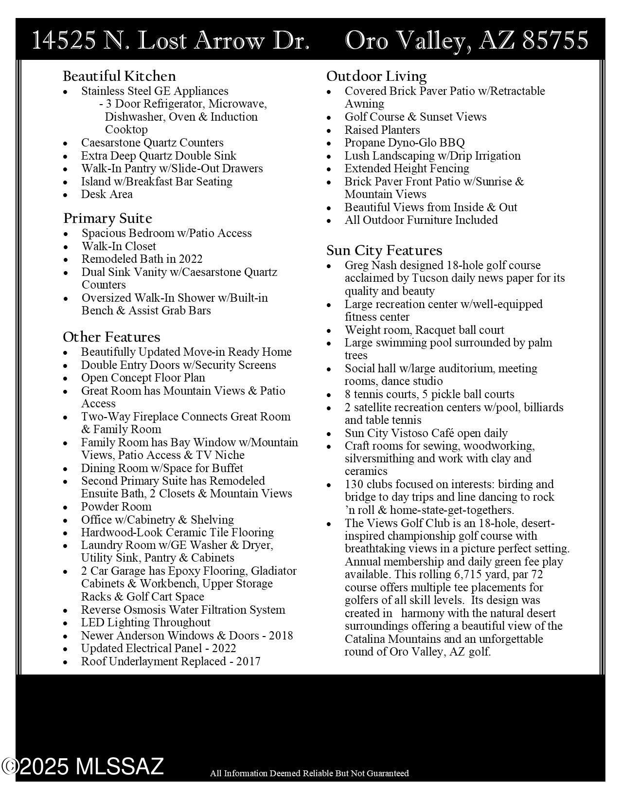 Beautifully Updated Golf Course Home with Sweeping Views Located on the 11th fairway, this 2,630SF Sun City home offers the perfect blend of elegance, function, & low-maintenance living. With 2 spacious bedrooms, an office/library, 2.5 baths, two living areas & 2-car garage (plus golf cart space), this property was designed for both relaxation & entertaining. Open, light-filled floor plan where the great room & family room showcase expansive golf course views & flow seamlessly to the oversized back patio. The remodeled kitchen features Caesarstone quartz counters, induction cooktop, walk-in pantry with slide-outs & bar seating making it a true chef's delight. The primary suite is a retreat with direct patio access, a spa-like bath remodeled in 2022 with double vanities,