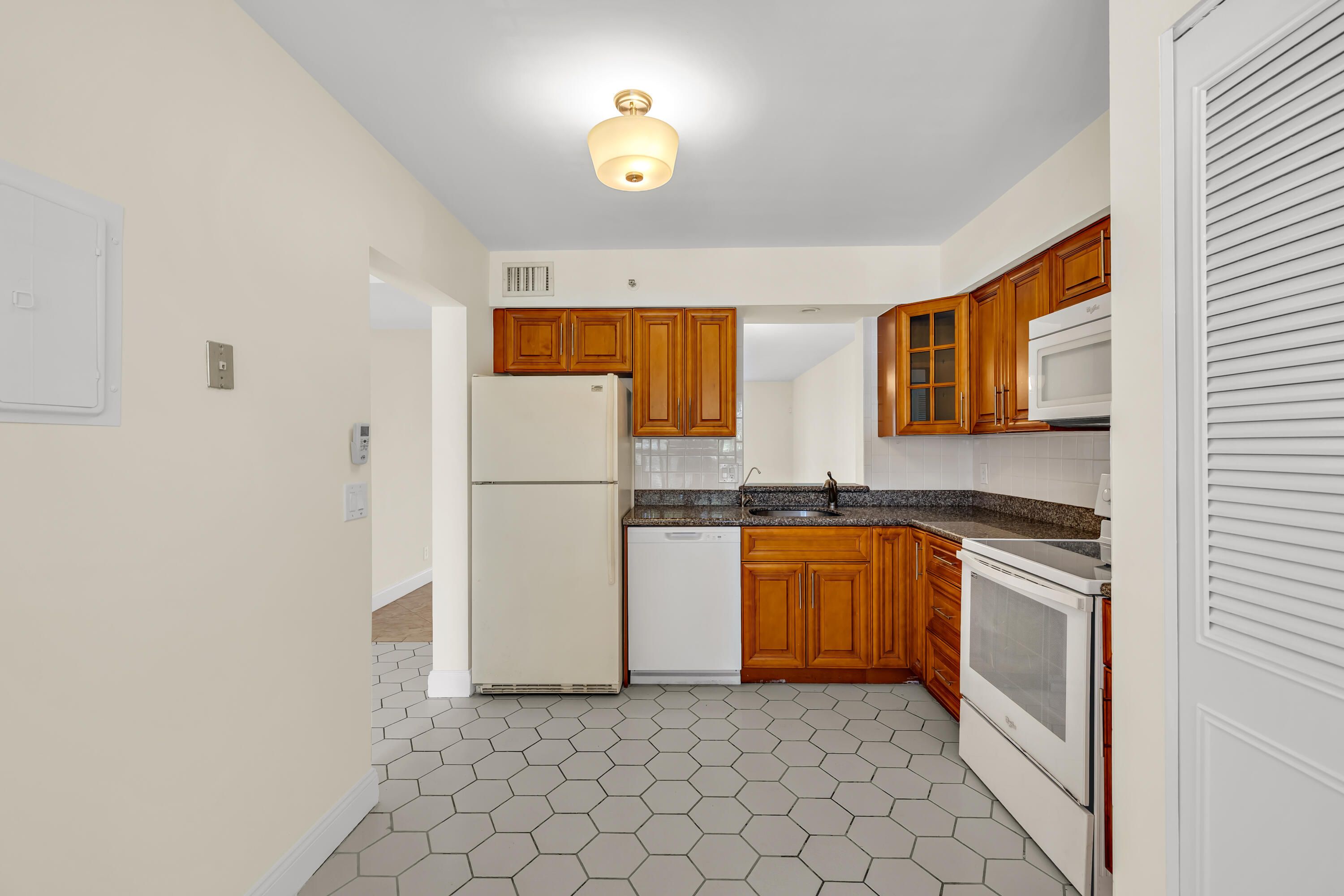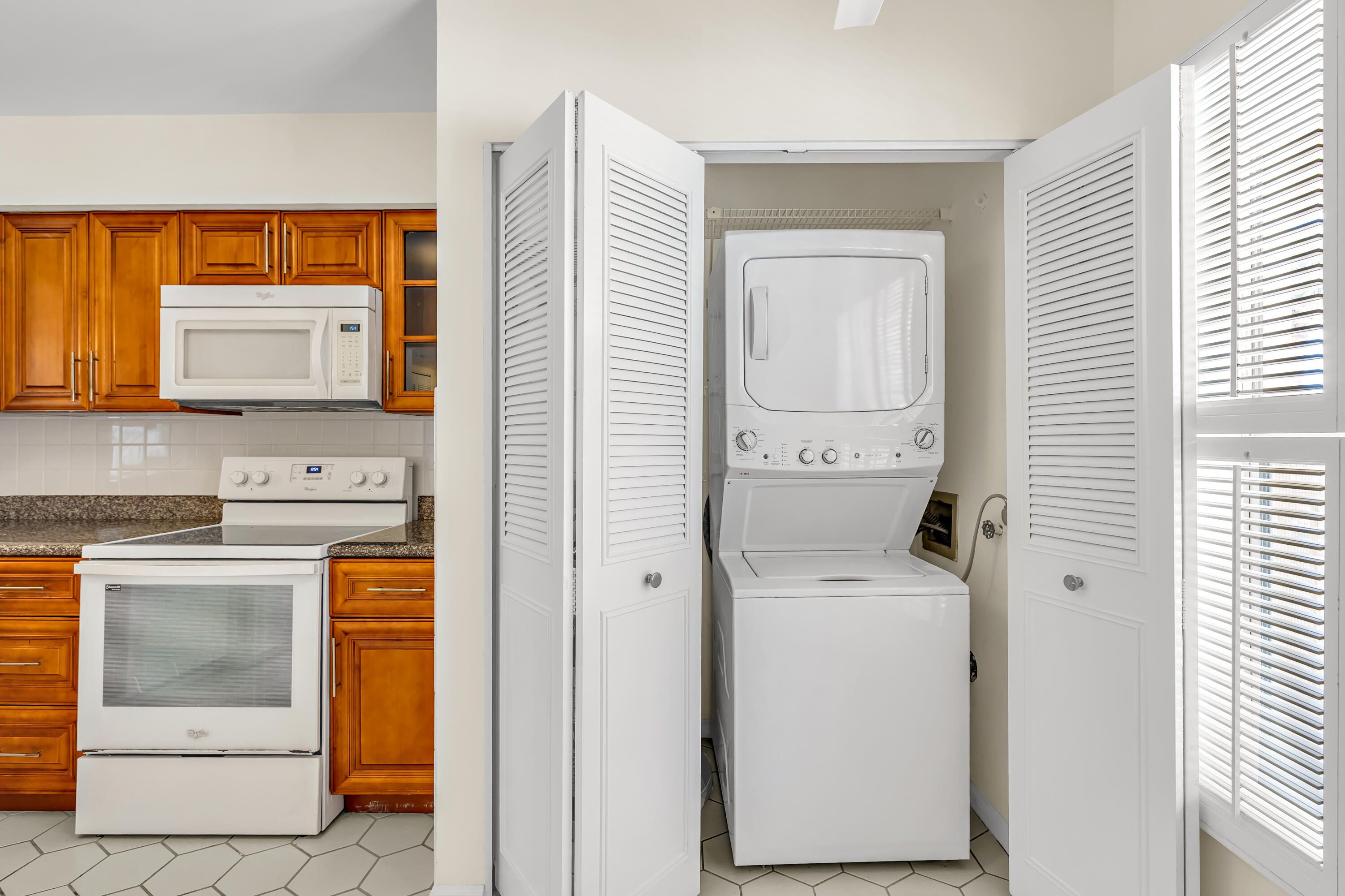 Freshly Painted and spacious 2/2 unit with tile floors, granite countertops and in-unit laundry. Plenty of closet space too. Unit is in 55+ community with great view from enclosed balcony and hurricane roll down shutters. Community pool steps away, excellent location in central Delray Beach, close to downtown and Atlantic Ave, plenty of shopping and restaurants in the area and conveniently located near 441 and I-95. HOA provides water and cable. Unit is unfurnished.