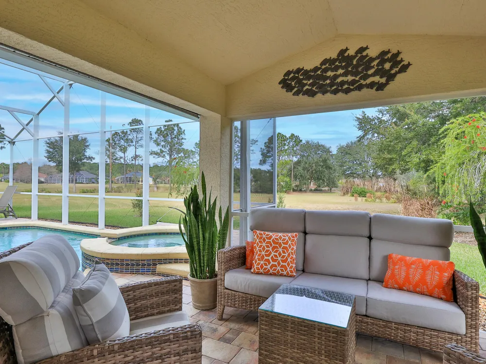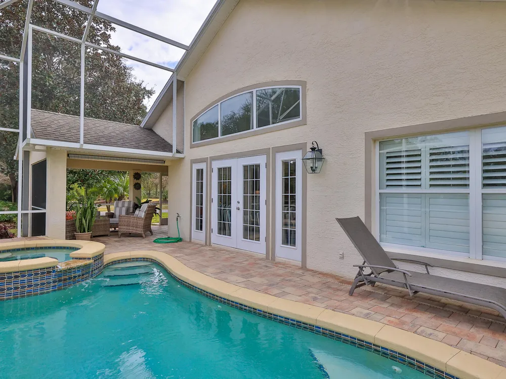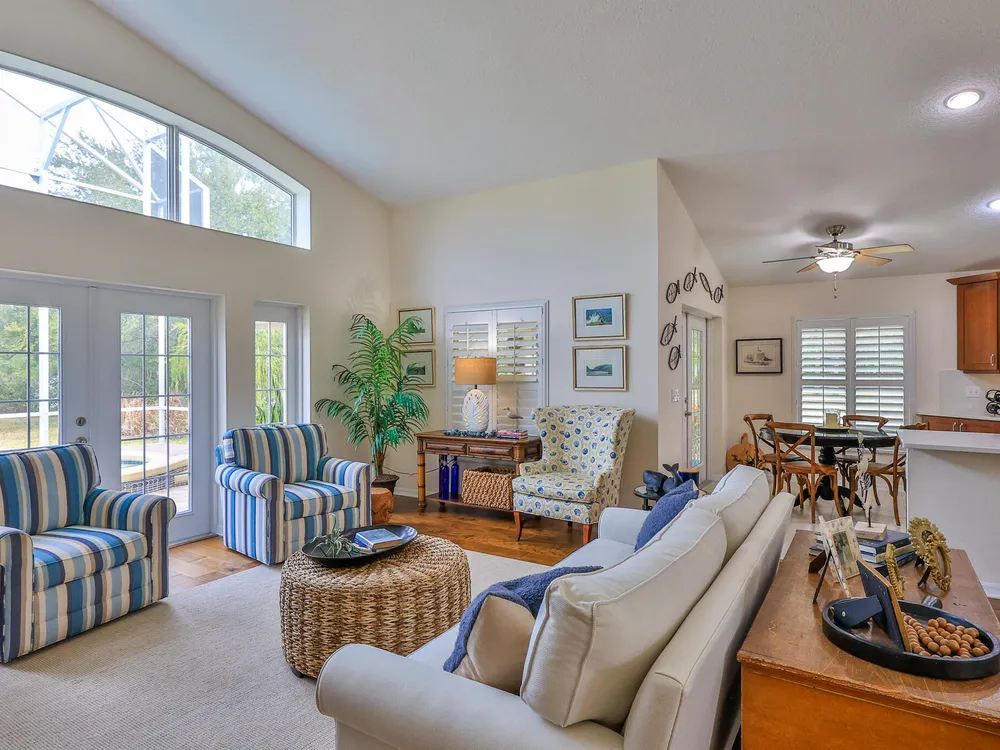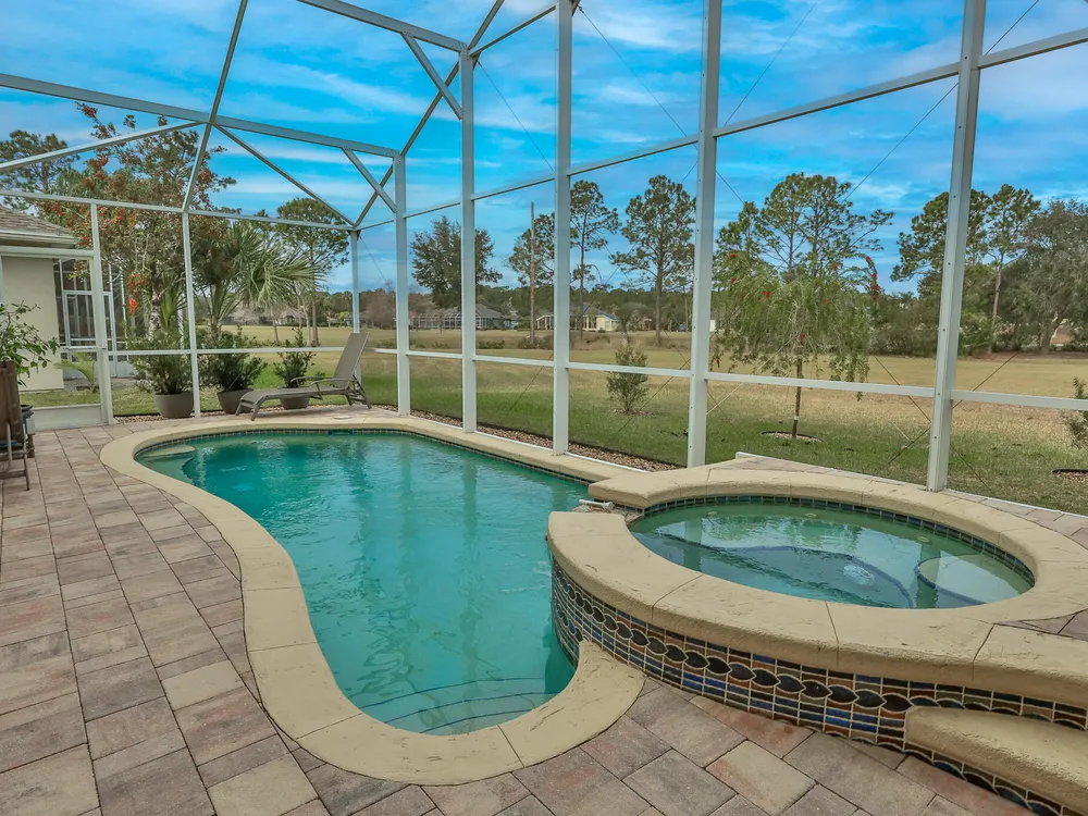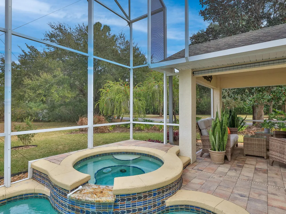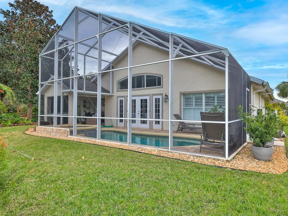 This meticulously renovated 3-bedroom, 2-bath pool home presents an exquisite opportunity for discerning buyers. Situated within the prestigious Plantation Bay Golf Community, the home offers remarkable views of Prestwick Park. Upon entering, one will observe a bright and airy move-in-ready property. Upgrades include elegant wood flooring throughout the primary living areas, plantation shutters, and a beautiful kitchen equipped with custom wood cabinetry, high-quality stainless steel appliances, and premium quartz countertops. The third bedroom provides versatile functionality, featuring a built-in desk, a closet, and a queen-sized wall bed, making it suitable for various uses, including a guest room or home office. The great room is flooded with natural light, thanks to French doors paired with transom windows that overlook the perfectly sized pool and spa. New roof in 2022, new A/C in 2024, water heater 2015. See more... Home is convenient to park, golf course, and US 1 Entrance to Plantation Bay. While membership is optional, Club features 45 holes of golf, fabulous new clubhouse with restaurants, indoor & outdoor dining, fitness center, tennis, pickleball.