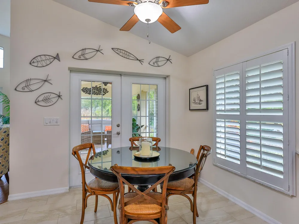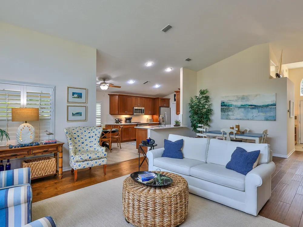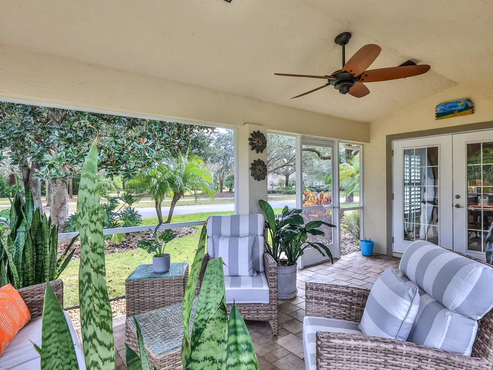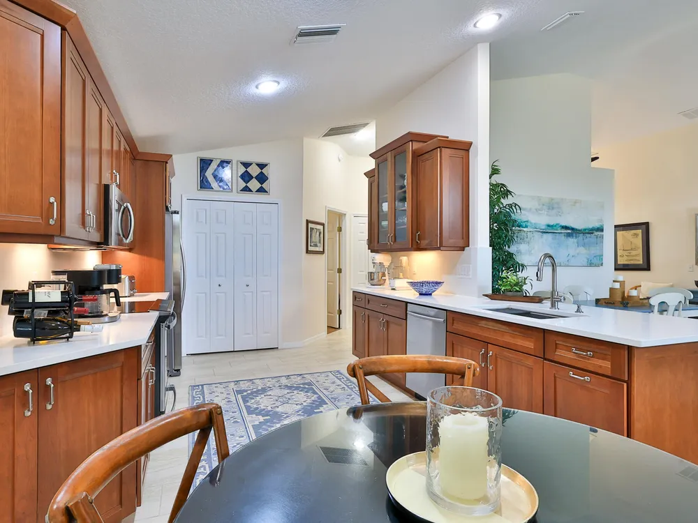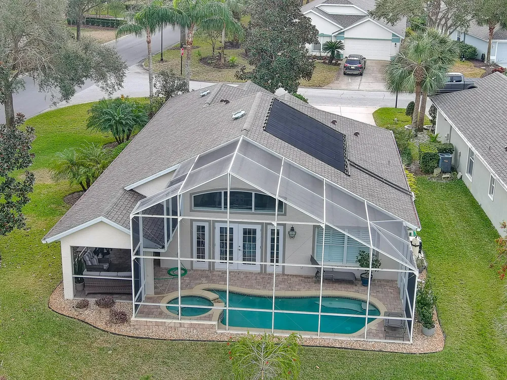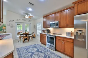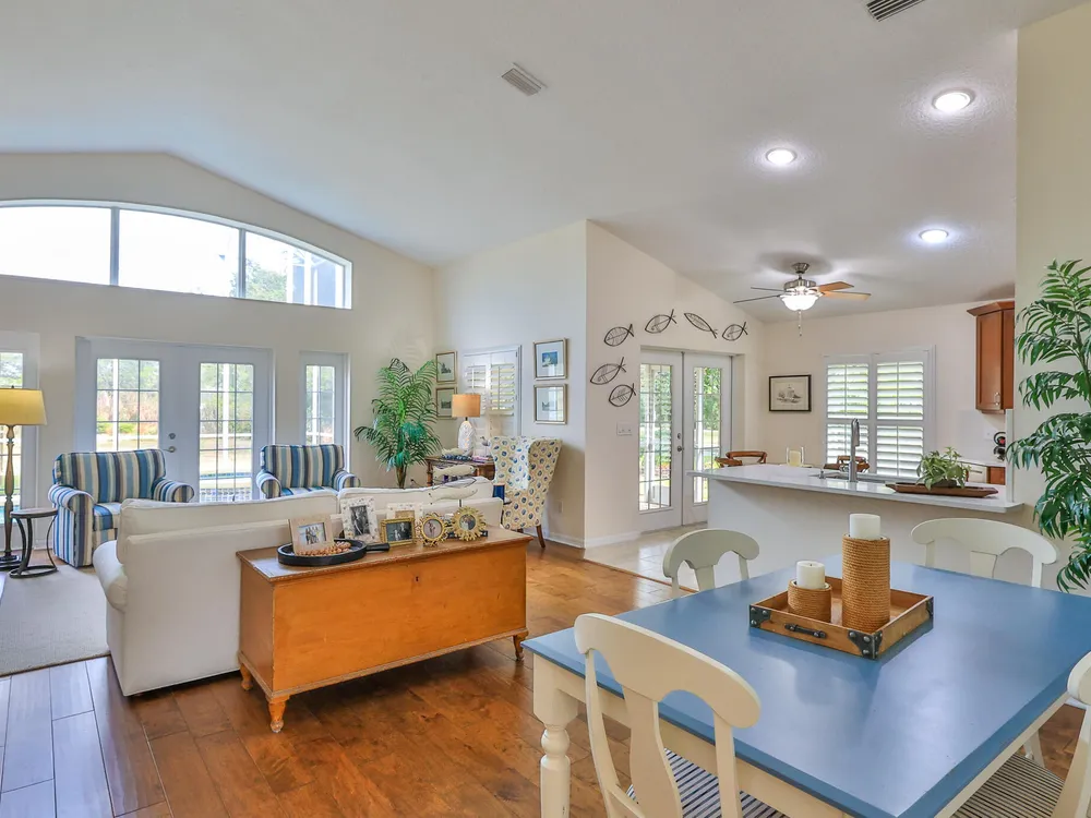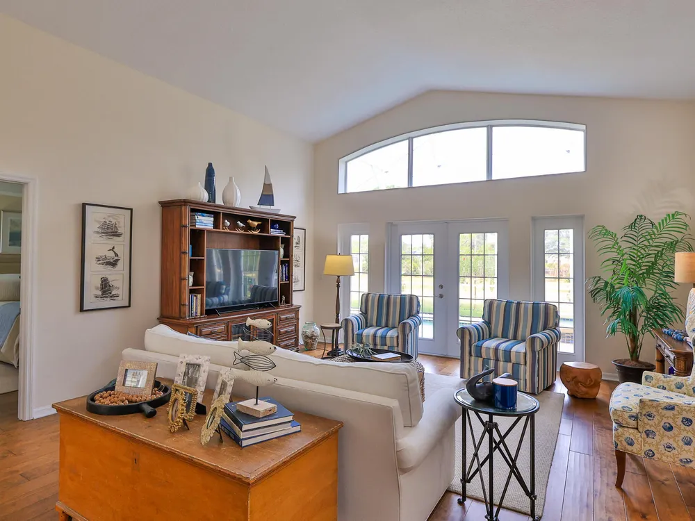This meticulously renovated 3-bedroom, 2-bath pool home presents an exquisite opportunity for discerning buyers. Situated within the prestigious Plantation Bay Golf Community, the home offers remarkable views of Prestwick Park. Upon entering, one will observe a bright and airy move-in-ready property. Upgrades include elegant wood flooring throughout the primary living areas, plantation shutters, and a beautiful kitchen equipped with custom wood cabinetry, high-quality stainless steel appliances, and premium quartz countertops. The third bedroom provides versatile functionality, featuring a built-in desk, a closet, and a queen-sized wall bed, making it suitable for various uses, including a guest room or home office. The great room is flooded with natural light, thanks to French doors paired with transom windows that overlook the perfectly sized pool and spa. New roof in 2022, new A/C in 2024, water heater 2015. See more... Home is convenient to park, golf course, and US 1 Entrance to Plantation Bay. While membership is optional, Club features 45 holes of golf, fabulous new clubhouse with restaurants, indoor & outdoor dining, fitness center, tennis, pickleball.