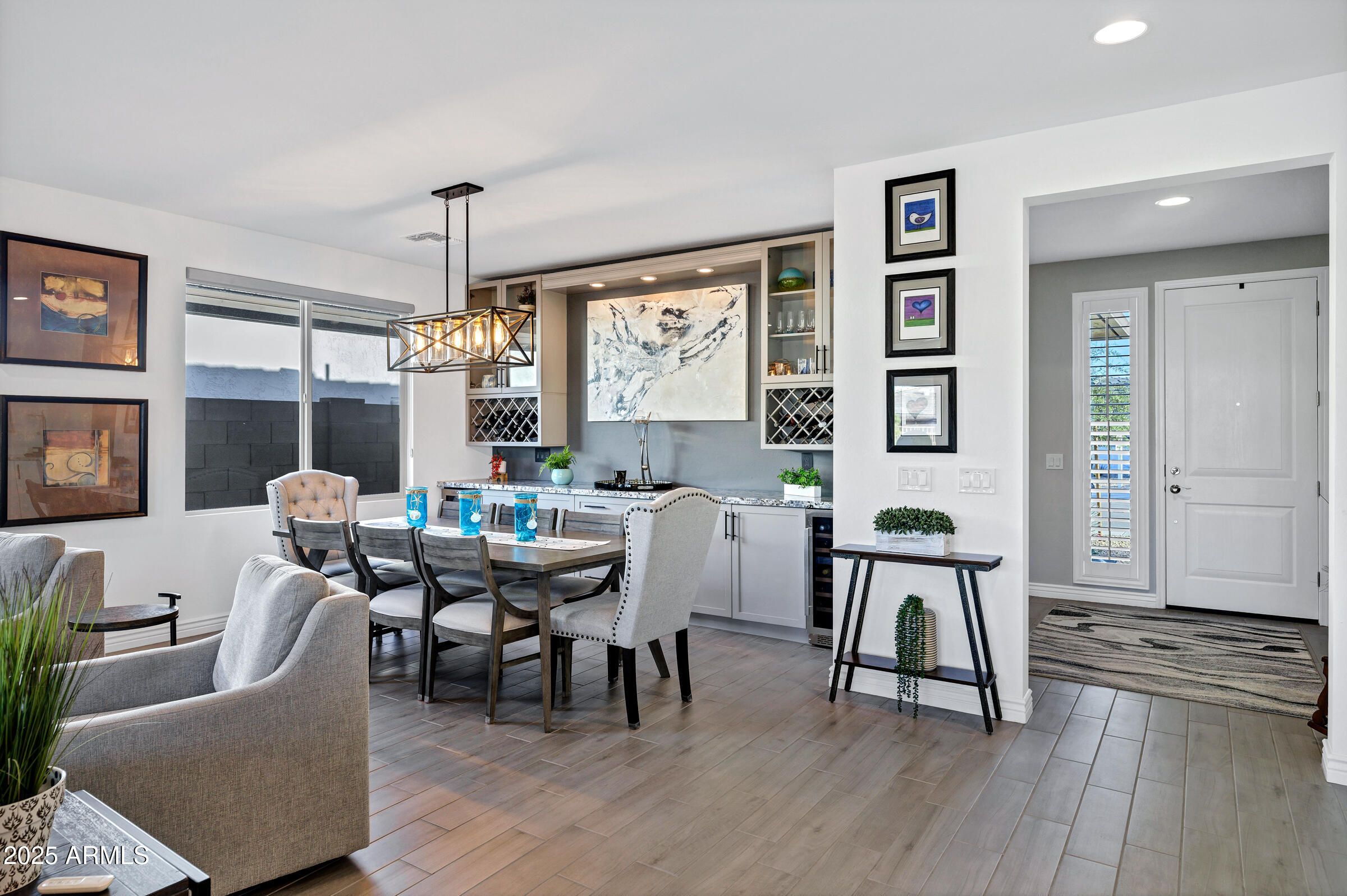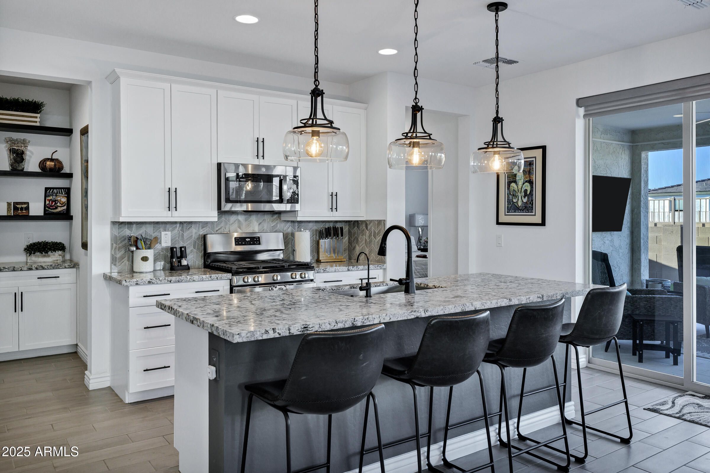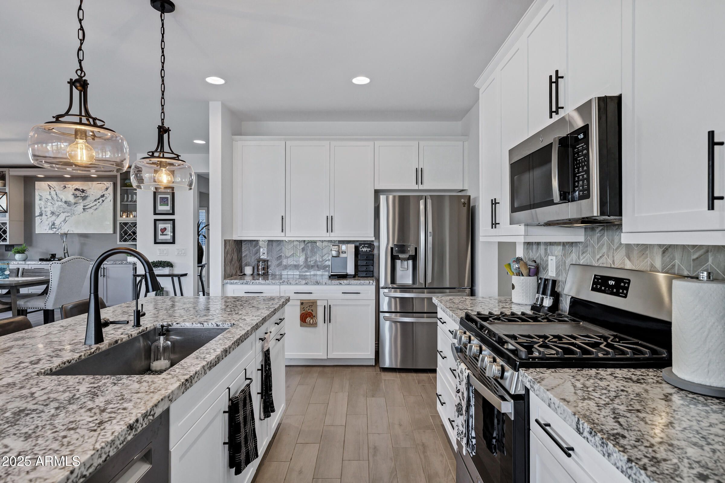 Beautiful Kaibab Model home! Shows like a model! Designer Cabinets complete with a beverage fridge and a humidor in the dining room. Custom lighting everywhere inside and out! The owner added the cabinet for the butlers pantry and additional storage built ins. Wide doorways. No steps for ease and safety. Gas stove , all stainless Appliances a true Cooks Kitchen. Custom window treatments, Plantation Shutters through home and Zebra Shades in the Great room to bring the outdoors in. Low maintenance turf and custom travertine tile on patio. Epoxy floors in Garage and water softener.