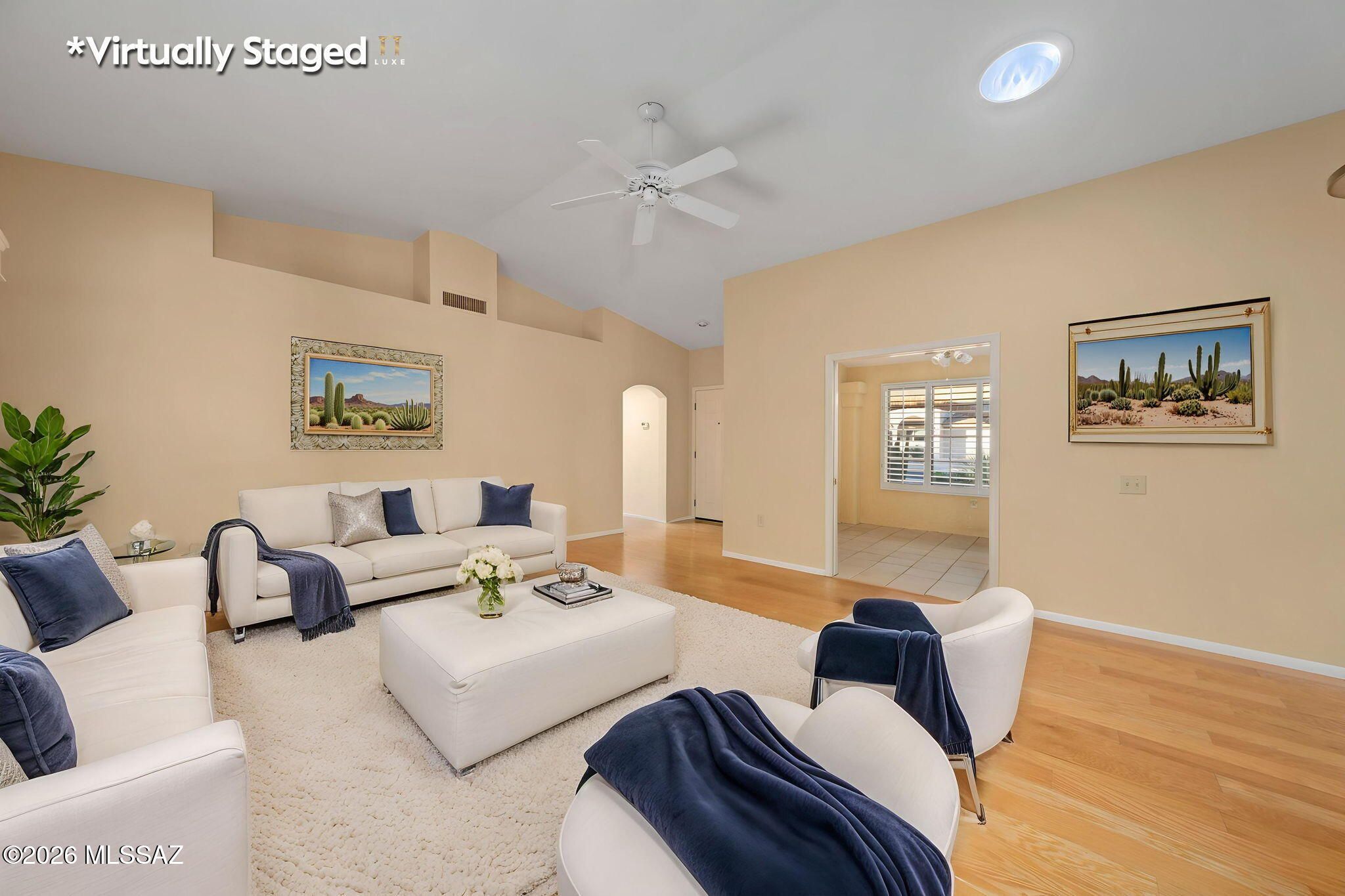 Experience active adult living at its finest in this 2-bedroom, 2-bath plus den home in Sun City's highly desirable 55+ community. The home offers 1,683 sqft and features an updated kitchen, remodeled bathrooms, and a master suite with a walk-in shower and closet. The guest bedroom includes a Murphy bed and desk, perfect for visitors or a home office. The living room is bright with skylights and flows into the Arizona room and extended back porch, perfect for relaxing or entertaining. Dual-side driveway pavers and a 2-car garage complete the exterior. Located on The Views Golf Club with a fitness center, pickleball courts, pools, restaurants, and close to hospitals and top-rated schools, this home is the perfect blend of comfort, lifestyle, and location.