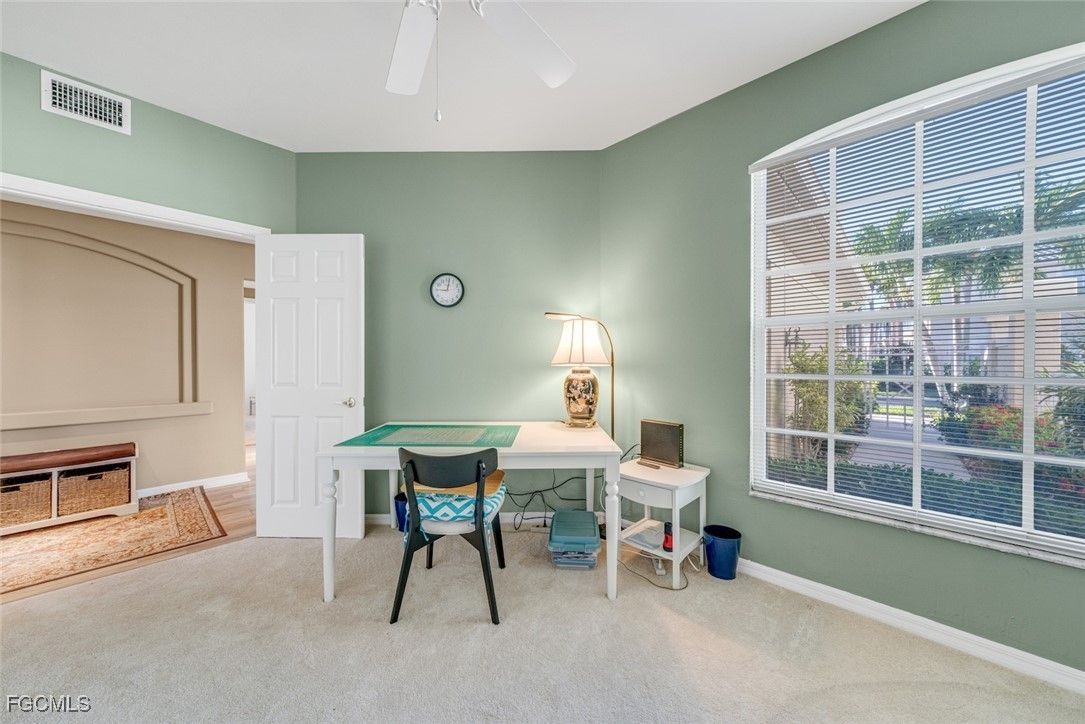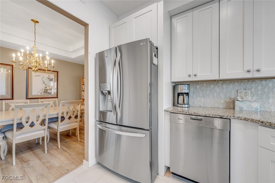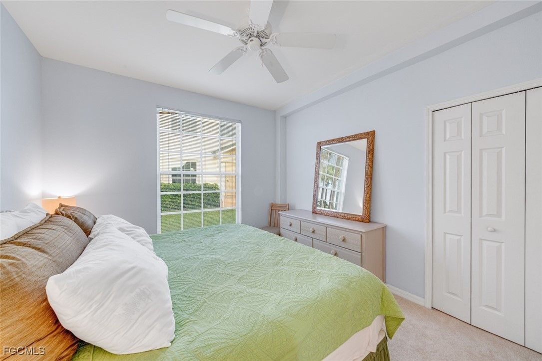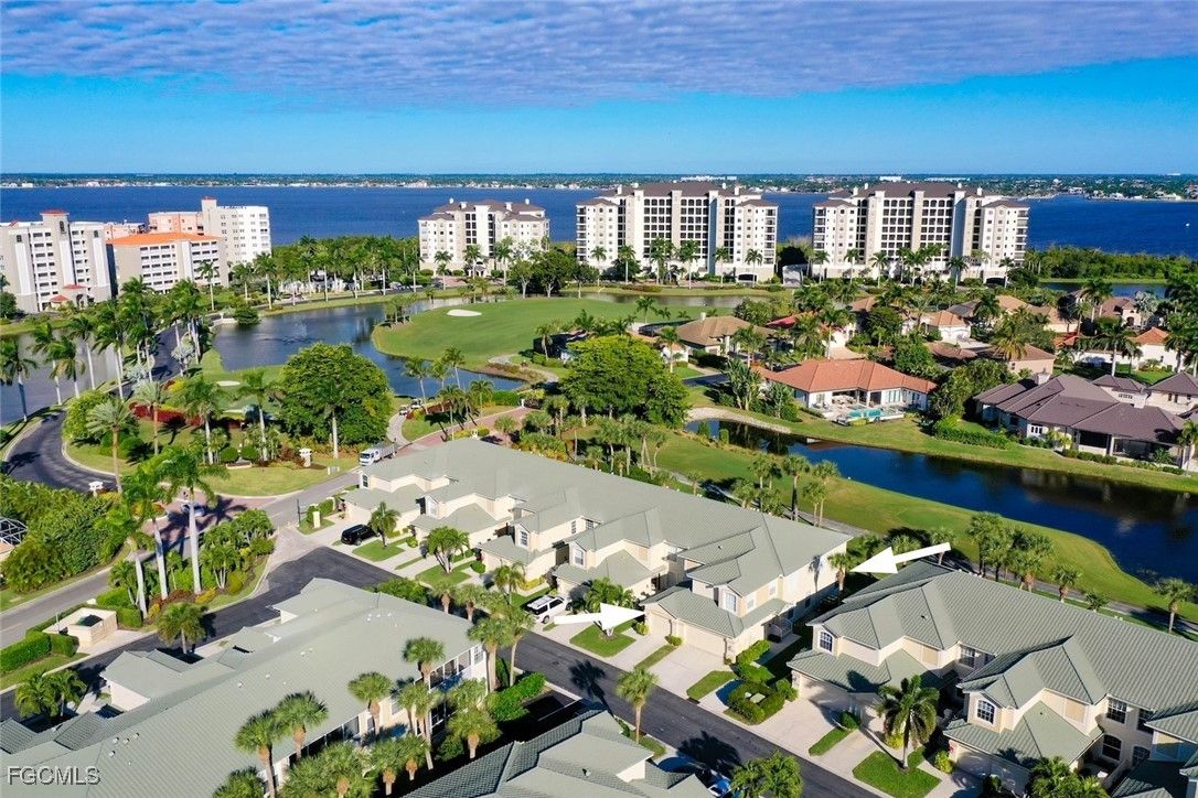 THE SUNSHINE POURS IN to this rare first floor end unit in the Grande Cay community, deep in a quiet corner of prestigious Gulf Harbour in Southwest Ft. Myers. Completely upgraded and immaculately decorated, at 1633 sq ft the unit is slightly larger than typical downstairs units. More importantly, as an end unit, three extra windows allow sunlight to stream into every corner. The wide screened lanai overlooks both the golf and lake views. Electric shutters provide protection. Tray ceiling highlights the entry foyer. Step into the large living room with neutral décor and absorb the beauty of the golf course and lake views. Comfortable furnishings invite relaxation. Plank-style vinyl thru the living area. Soft warm carpet in bedrooms and den. Bright kitchen features recessed lighting and tons of soft-close cabinets, all with granite countertops and 42” uppers. Plus a large pantry. Stainless appliances just 2 years old. Cozy breakfast nook offers the same spectacular golf and lake views for morning coffee or casual dining. Host more elaborate gatherings in the formal dining room with elegant tray ceiling and large sunshine-inviting window. Or just veg out on the lanai. The primary bedroom has two large walk-in closets plus a handy linen closet. The upgraded primary bath has twin sinks, granite countertops, an oversized shower and huge cabinets. Guest bedroom has large closet and there is an extra closet off the upgraded guest bath. Den configured as an office/craft room with desk, files and overhead cabinets. There is also a pull-down Murphy bed, tucked away until needed for extra guest sleeping. Sold completely turnkey with classic comfortable furnishings so it is move-in ready. A/C service plan will be transferred to buyer. Just a few steps to the refurbished community pool and spa, the social center of Grande Cay with an active event calendar. Miles of pathways inside the gate to enjoy bike rides, jogging or casual walks in the sunshine. Or simply stroll the private Gulf Harbour Eagle Perch Island along the Caloosahatchee River for gorgeous sunsets. Fees include water, internet and cable. Close to Ft. Myers Beach, Sanibel Beach and nearby Bunche Beach. Surrounded by shopping and restaurants. Easy access to SWFL International Airport, plus Twins and Red Sox baseball stadiums. Additional amenities of golf, tennis, fitness center and two restaurants require an optional membership. Seller offering full golf membership for an additional fee. Skip the waitlist and jump to the front of the line.
