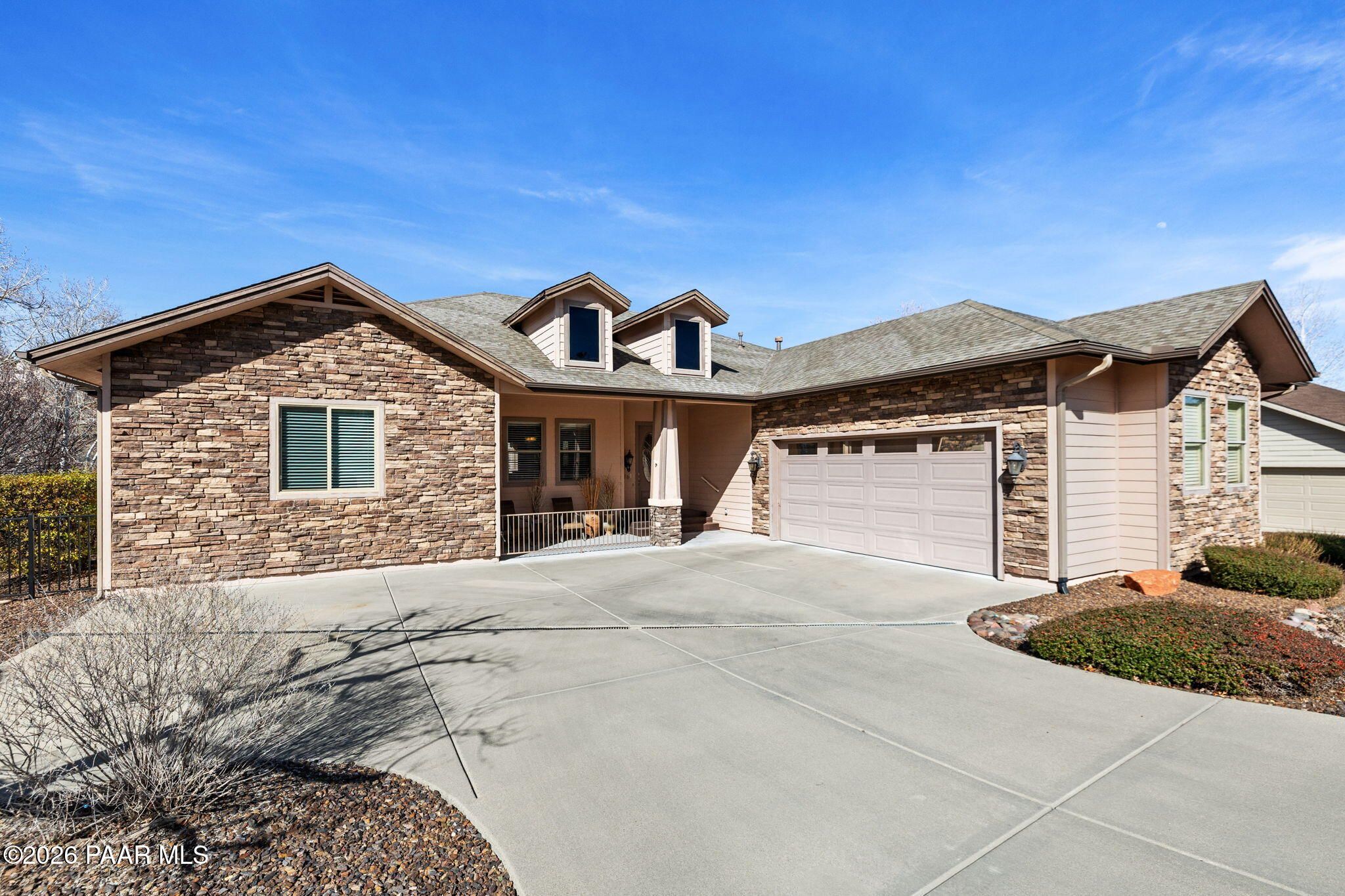Discover refined single-level living in the prestigious enclave of Stoney Creek within Prescott Lakes Community -- an executive residence offering privacy, elegance, and exceptional functionality.Build finished in 2007, this beautifully maintained 3-bedroom, 2-bathroom home features a thoughtful split floor plan with two spacious guest bedrooms and a luxurious primary suite designed for comfort and relaxation. The primary bath includes dual vanities, a garden soaking tub, a separate shower, and matching medicine cabinets, creating a spa-like retreat.At the heart of the home is a gourmet, chef's kitchen with new LG oven and microwave, perfect for entertaining and everyday living. The inviting living area is anchored by a cozy fireplace, while a versatile third bedroom currently serves as a home office. An additional sitting area can serve multiple uses perhaps a piano room, reading area or office space. Step outside to enjoy a large private deck with a gas outlet for grilling, mature landscaping, and a partially fenced yard with a spacious dog run and convenient doggie door -- ideal for pet lovers. Additional upgrades include a new irrigation system and a second bedroom with direct access to the backyard.The oversized two-car garage (width of a 3 car but only 2 entry) offers ample space for two vehicles plus a golf cart, and storage adding to the home's exceptional practicality.Located just up the street from the Prescott Lakes Golf Club, residents also enjoy scenic walking paths that circle the community, along with close proximity to top schools, healthcare, shopping, and outdoor hiking trails in Prescott. As a resident of the prestigious Prescott Lakes community, you'll enjoy access to an outstanding array of amenities. The Athletic Club offers pickle ball and tennis courts, a full fitness center, indoor and outdoor pools, and a large hot tub. The Club at Prescott Lakes features a restaurant, bar, banquet facilities, and a vibrant calendar of social events. Recently added 2 new Bocce courts added near the pickle ball courts in 2026 and the Club is undergoing a remodel in Spring 2026. Golf enthusiasts may opt to join the Hale Irwin-designed 18-hole championship golf course through a separate membership. A rare blend of privacy, and convenience in one of Prescott's most sought-after neighborhoods -- this home is truly move-in ready and designed for elevated living.