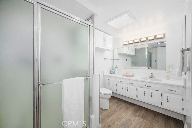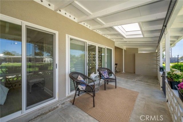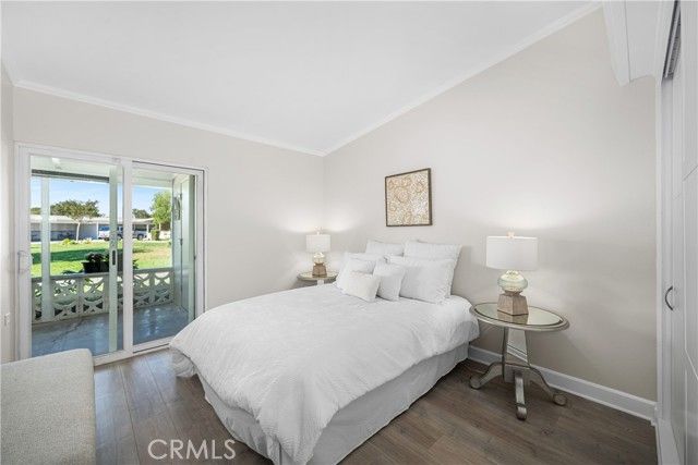 Charming two bedroom one bath, laminate flooring throughout, double paned windows, french entry doors, slider to front patio, slider in Master bedroom, 3 skylights, washer dryer, dishwasher, L-shaped patio on lovely expansive greenbelt Mutual 2 28E Carport 30#2