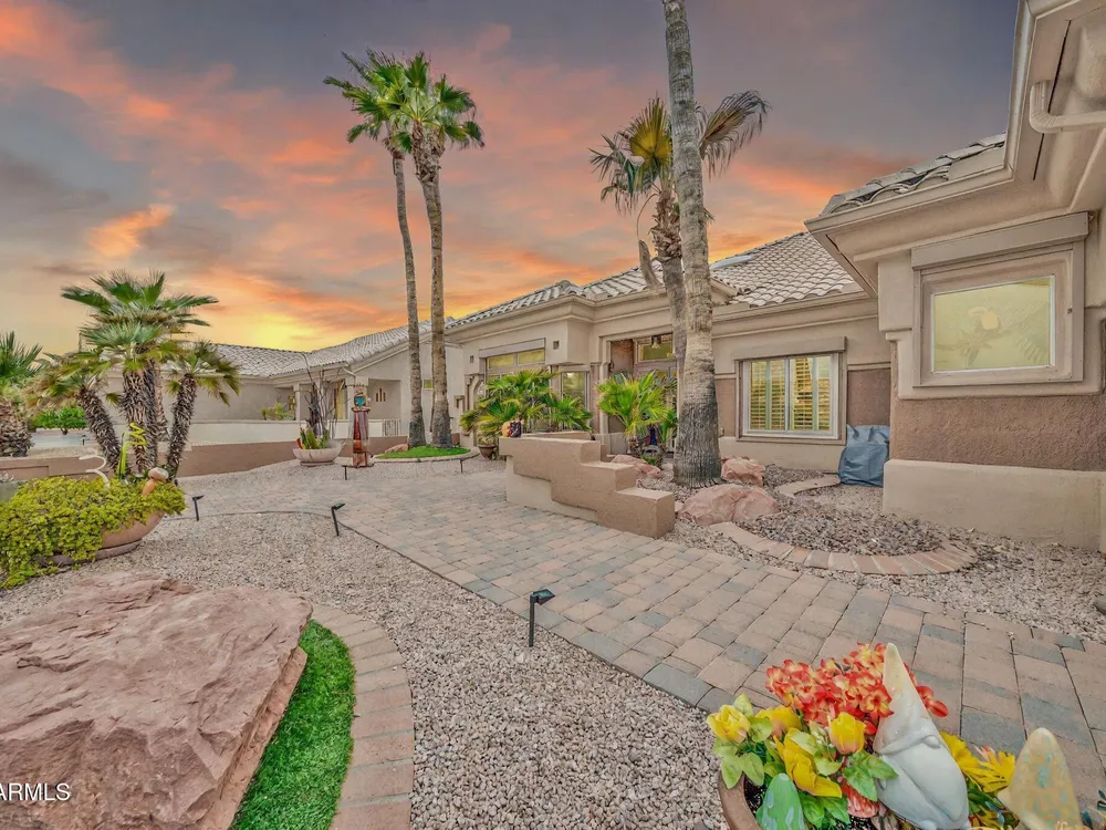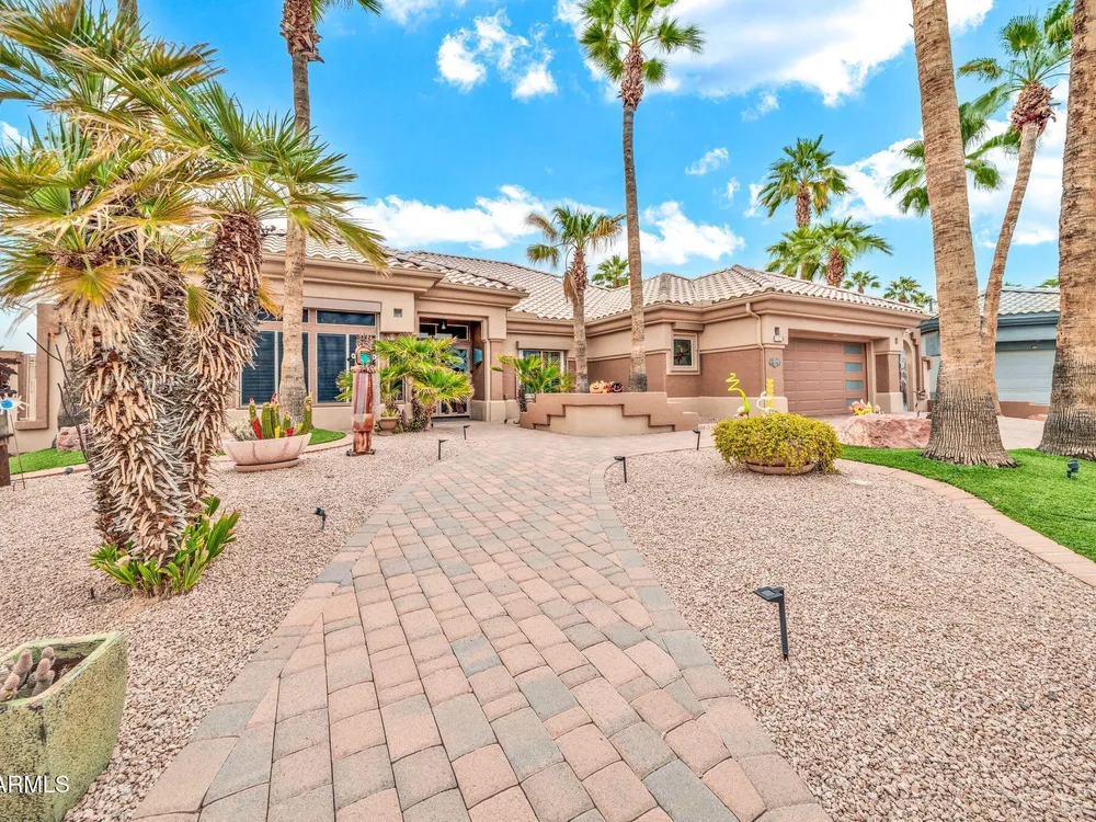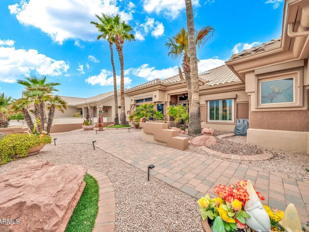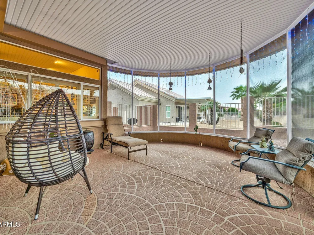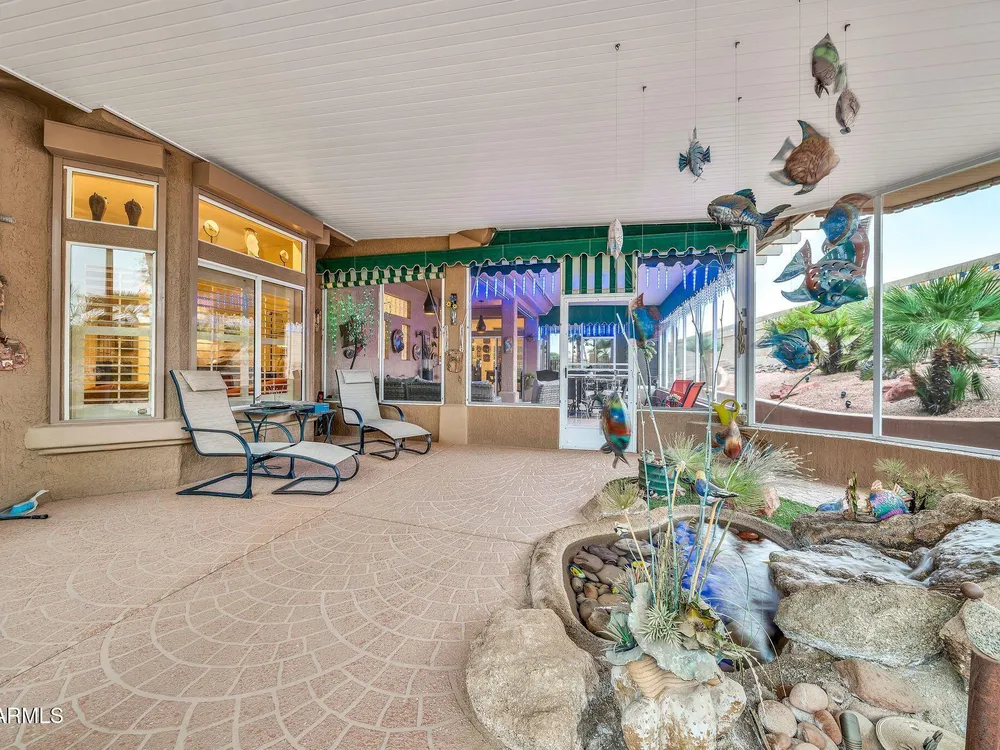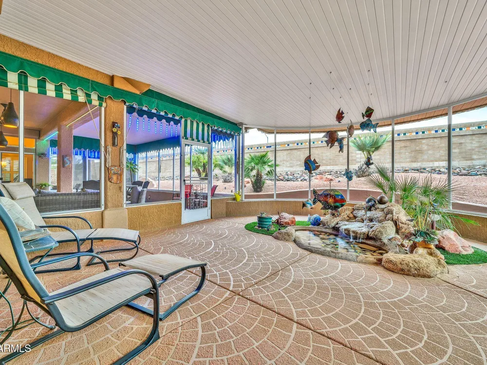 Situated on an oversized 11,847 SF lot, this expanded 2 bdrm, 2.5 bath custom Cottonwood (P-2607) offers 2,846 SF of versatile living with a media room (new Epson projector 2024), office, and Arizona room. Major updates include roof (2018), HVAC (2015), garage door (2020), opener (2021), irrigation (2020 & 2024), and fresh exterior paint (2024). Highlights: all-tile flooring, some new windows with plantation shutters, granite island kitchen with gas cooktop, subway backsplash, and stainless appliances. Primary bath remodeled 2015. Outdoors: pavers, three screened patios, water feature (new pump 2021), electric fireplace (2022), low-maintenance landscaping, roller shields, warranties, and full Sun City West amenities.