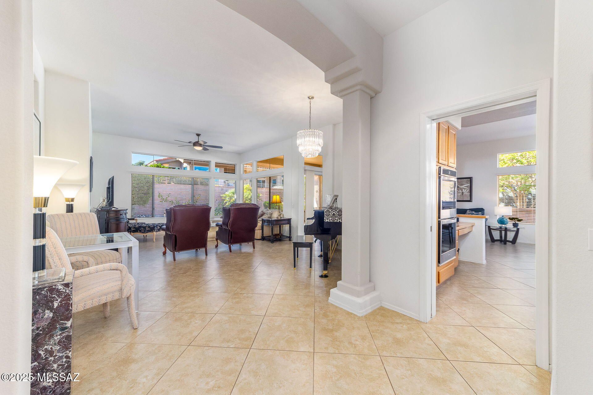 Sun City Crestview Model. Immaculate 1,923 sq. ft. 2BR / 2BA home. Lovely Enclosed Front Patio w/ Magnificent Catalina Mountain Views & a Rose Garden. Welcome into your Bright Open Kitchen w/ Island, New Stainless Appliances including Double Oven & Gas Cooktop that Flows into the Dining Area and the Family Room w/ Gas Fireplace. Enjoy your Spacious Living Room w/ views of the Private Back Yard Oasis. An Elegant Hallway leads to the Owner's Suite w/ Walk-in Closet, Walk-in Shower & Tub. BR 2 Features beautiful Built-in's w/ a Murphy Bed. Your Private, Enclosed Back Yard has a Covered Patio & Lush Landscaping. Home also features a Laundry Room w/ Cabinetry & 2 Car + Golf Cart Garage. New Exterior Paint + New Epoxy Driveway & Walkway. Sun City Amenities: Golf, Pools, Pickleball & more!