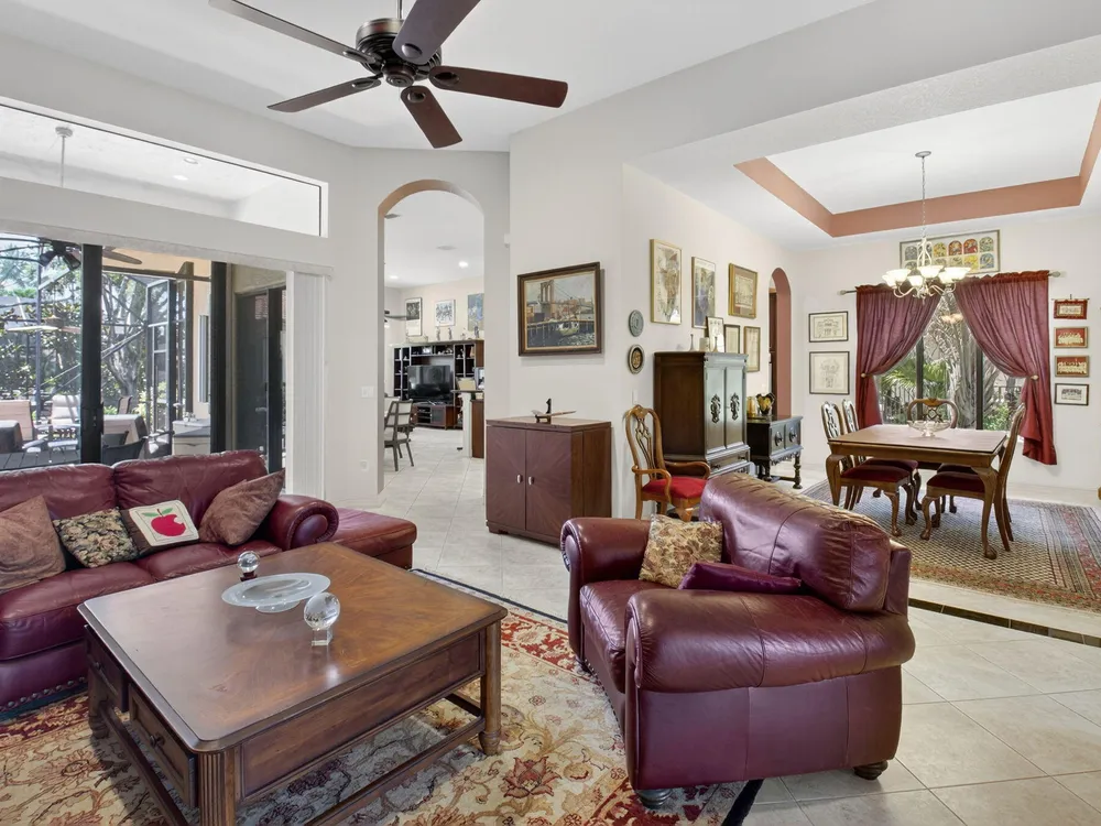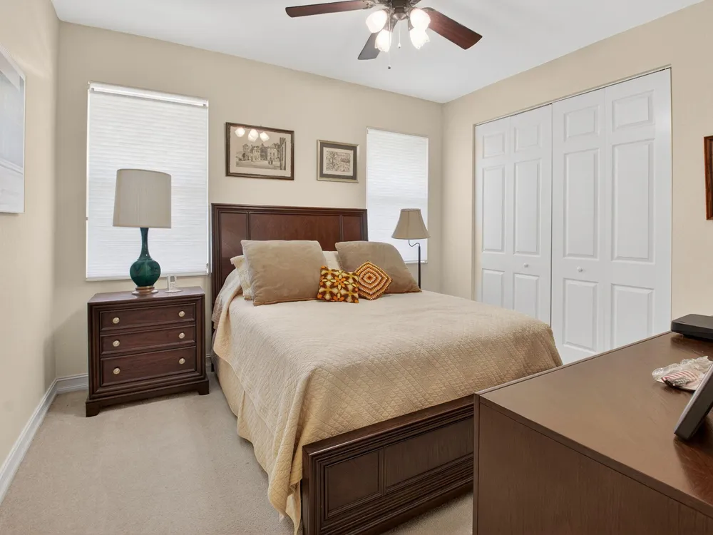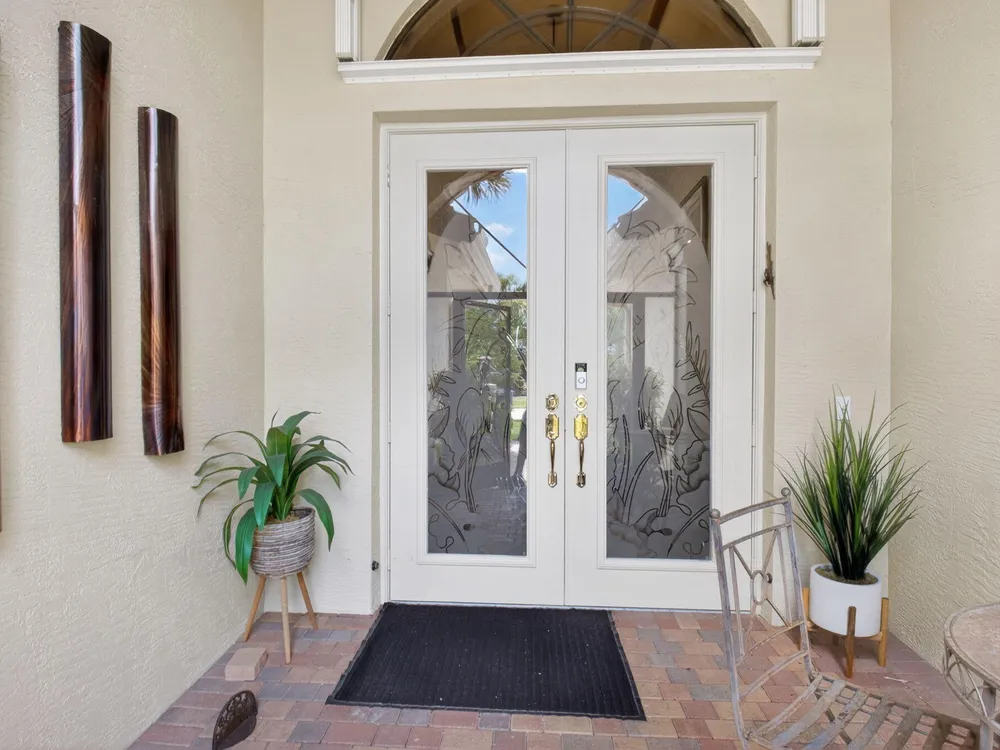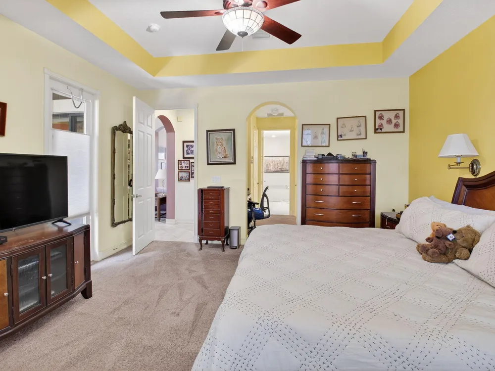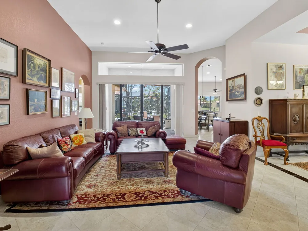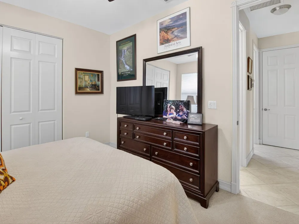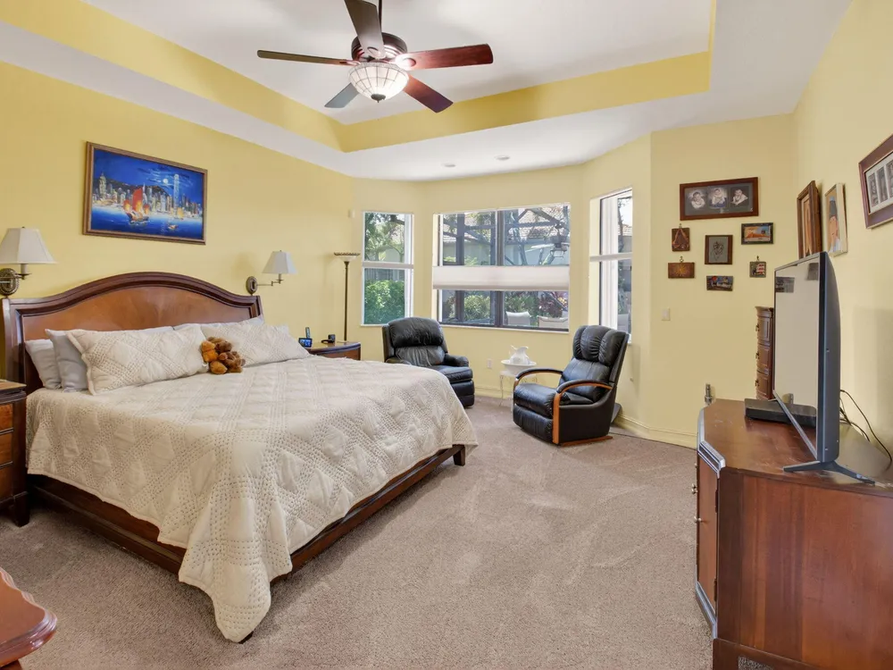 NOTE: Sellers to provide buyers with a credit at closing to pay for one year of HOA fees ($8,400). Rarely available Merlot model has hit the market and is ready to welcome its' new owners. This 4 bedroom, 3 full bath home has been well maintained and has many features you will not find in other homes. The fourth bedroom is set up as a den/office, but can be easily converted back to a bedroom by adding a closet. The home features solar panels, which keeps the current electric bill under $30 a month. This lovely home features dual zone air conditioners, a newer washer/dryer, hurricane glass double front doors, a screened in entry way and a large screened lanai overlooking a beautiful long lake view.