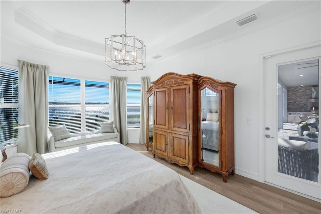Elegant simplicity meets refined lakefront luxury; this impeccably crafted three-bedroom residence with a private study, three baths, and a three-car garage is gracefully set along a rare, boatable 220+ acre-sized lake, offering opportunities for boating and fishing, right from your own backyard. The eastern exposure bathes the home in soft morning light, delivering stunning sunrises and creating the ideal backdrop for entertaining in the expansive outdoor living area, where a resort-style pool, spa, and fully appointed outdoor kitchen invite year-round enjoyment.Inside, sophisticated design meets thoughtful detail. Custom wood beams and designer lighting accentuate the home’s soaring volume ceilings, while wood-look tile flooring flows seamlessly throughout, providing both elegance and continuity. The chef’s kitchen is a statement in both form and function, featuring Monogram appliances, a gas cooktop, quartz countertops and backsplash, a beautifully integrated butler’s pantry plus wine and beverage bar, ensuring effortless entertaining and everyday ease.Every space reflects a commitment to quality and timeless style. Beyond the home, residents enjoy exceptional resort-caliber amenities, including a lakefront beach, waterfront dining, state-of-the-art fitness center, marina, pickleball and tennis courts, and more. Perfectly located minutes from premier shopping, fine dining, FGCU, and Southwest Florida International Airport, this residence offers both privacy and convenience in equal measure. An exceptional offering for the discerning buyer—experience it in person.