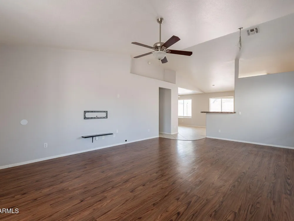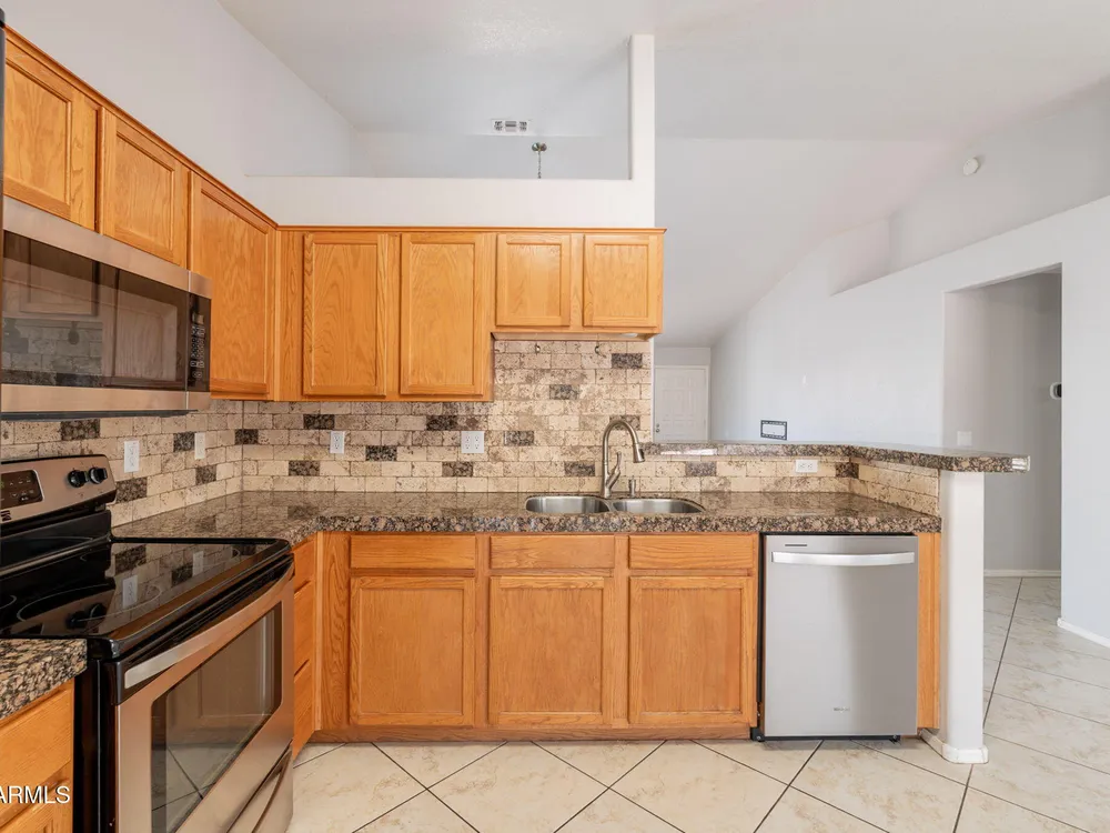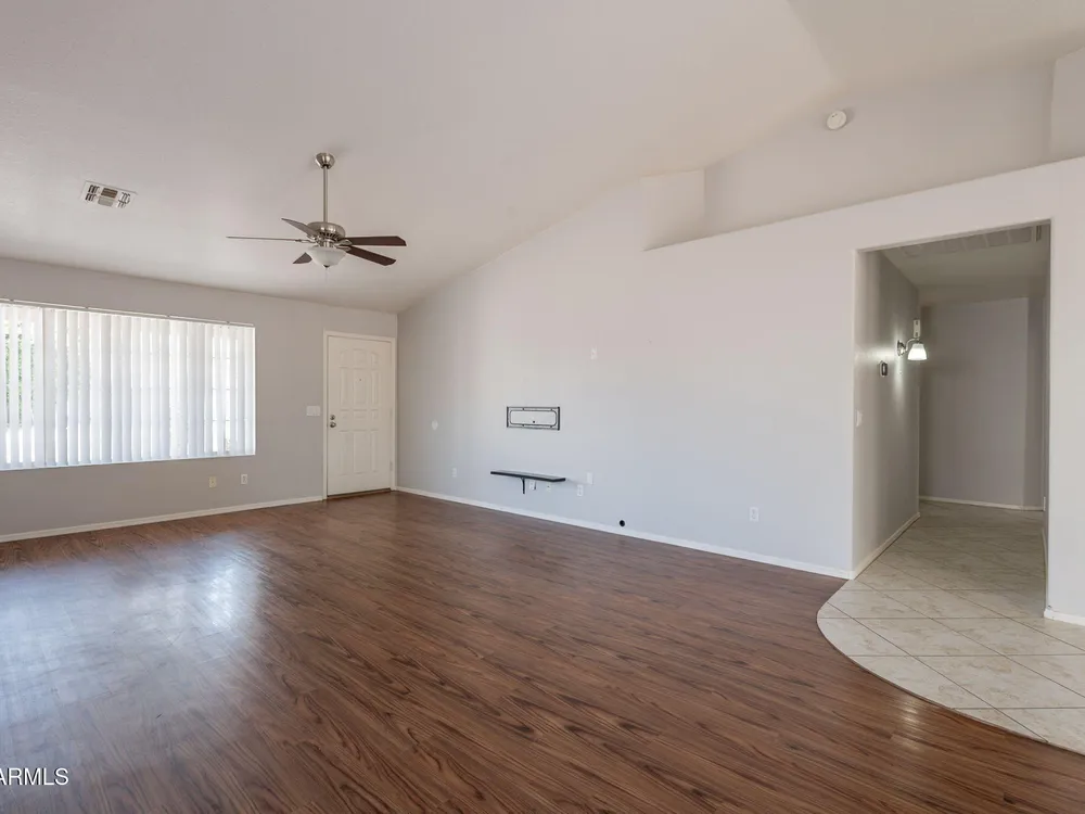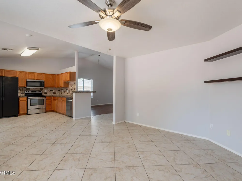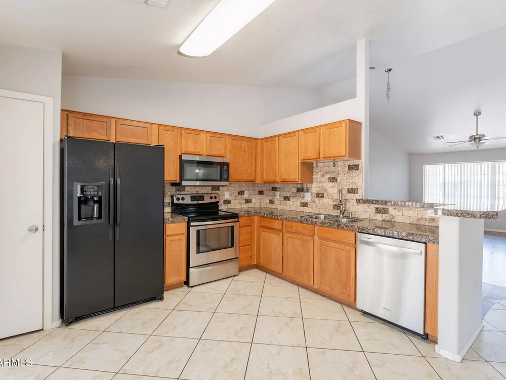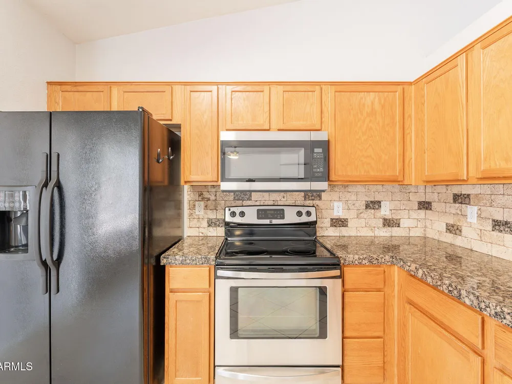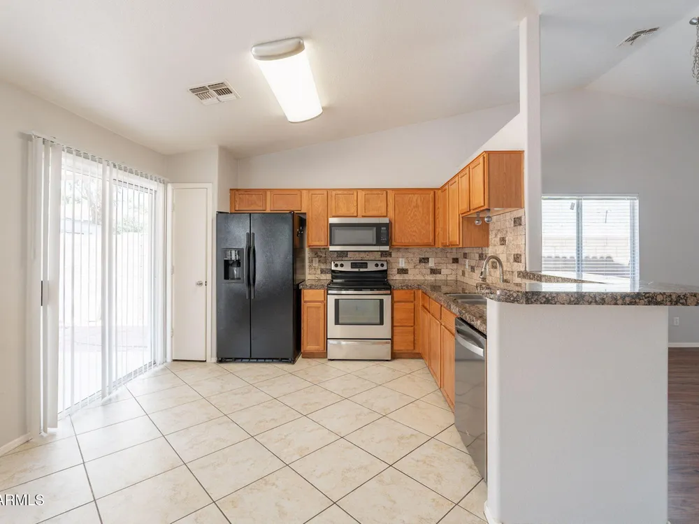 Welcome to the City of Surprise, MOVE-IN READY, 1440 sq.ft of interior living space, 3 BED + 2 BATH + 2 CAR Garage, plus OWNED SOLAR! Conveniently located by Rt 60 and within minutes of 303 freeway access, shopping, dining, and entertainment at your fingertips. 15 minutes to Costco and Prasada shopping/dining area, 20 minutes to White Tank Mountain Regional Park, 35 min from beautiful Lake Pleasant Regional Park. And 40 minutes to Sky Harbor International Airport. Open concept main living area with vaulted ceilings and a neutral color palette, light and bright with wood vinyl plank flooring, and white trim and doors throughout. Kitchen features granite countertops, breakfast bar, marble tile backsplash, ceramic tile floors, a convenient breakfast nook or dining area, and a pantry for all your storage needs. Master bedroom features vinyl plank flooring, a ceiling fan, a full bath, and a spacious walk-in closet. 2 additional bedrooms with ceiling fans and a full bathroom plus a laundry room with a washer and dryer. Bring your decorating ideas to your backyard space, or enjoy the low maintenance and relax under the covered patio. Spacious yard, with additional storage available on the side, features a newer AC Unit and Owned Solar, clean and move-in-ready.