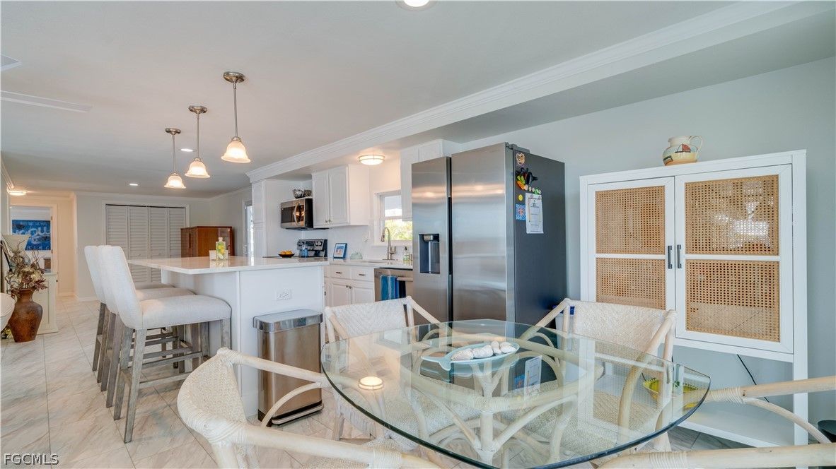 Beautifully furnished waterfront home situated on a corner lot with desirable southern rear exposure and direct Gulf access with no bridges. Boaters will love the new private dock and lift (2023/2024), making days on the water effortless. This light-filled home features impact windows and sliders, French doors, crown molding in main living areas, recessed lighting, custom blinds, stainless steel appliances, and indoor washer/dryer. Major updates include a new roof (2022) and new A/C (2022). Watch the boats go by on your private deck area. Large shed/workshop offers excellent storage or hobby space and includes additional washer/dryer hookups and electrical. Ideal for those seeking low-maintenance waterfront living with outstanding boating access and lots of amenities including community pools, spa, boat ramp, docks, pickleball, shuffleboard, community room, and so much more!