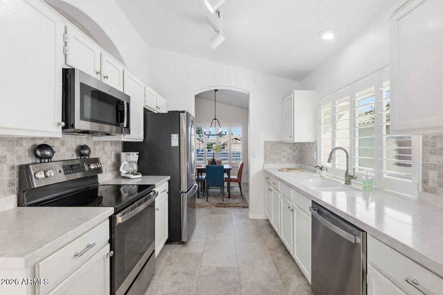 Welcome to this beautifully upgraded Monterrey floorplan in the gated 55+community of Sun Village! $5500 Buyer Bonus! Soaring vaulted ceilings and a functional layout create an inviting feel from the moment you step inside. Enjoy a formal dining space just off the kitchen and a bright breakfast nook with sliding doors to the NEWLY LANDSCAPED backyard, perfect for evening relaxation. The spacious primary suite features a NEW quartz vanity, updated shower door and frame and a custom California Closet organizer. The hall bath has also been refreshed with a NEW vanity and counter. Thoughtful upgrades include NEW SS APPLIANCES, FRESH interior paint, plantation shutters, UPDATED lighting and plumbing fixtures, epoxy garage floors, NEW security door. HVAC 2016. Roof underlayment 2015 Sun Village is a 55+ Gated, Resort Style Community. Enjoy the 18 hole par 3 golf course, gigantic heated pool & spa, pickleball, tennis, fitness gym, woodshop, billiards, onsite entertainment in our ball room and onsite restaurant!Sun Village, is a gated, security guarded, age 55+, community, in the city of Surprise, Arizona. This small community is made up of just under 1400 homes and condominiums. The Sun Village Community has an 18 hole, par three "no-"riding" golf course, an heated swimming pool and spa, tennis, pickle ball and shuffleboard courts, horseshoe pits, an exercise room, a billiards room, sewing and crafts rooms, and a ballroom where national and international entertainment can be enjoyed! Close by you will find the spring training home of the Texas Rangers and the Kansas City Royals. Across the street from Surprises' baseball complex, is a 25 court tennis complex that is home to national and international tennis tournaments. A Regional Library, a park, and a fishing lake are also part of this fantastic recreational area.