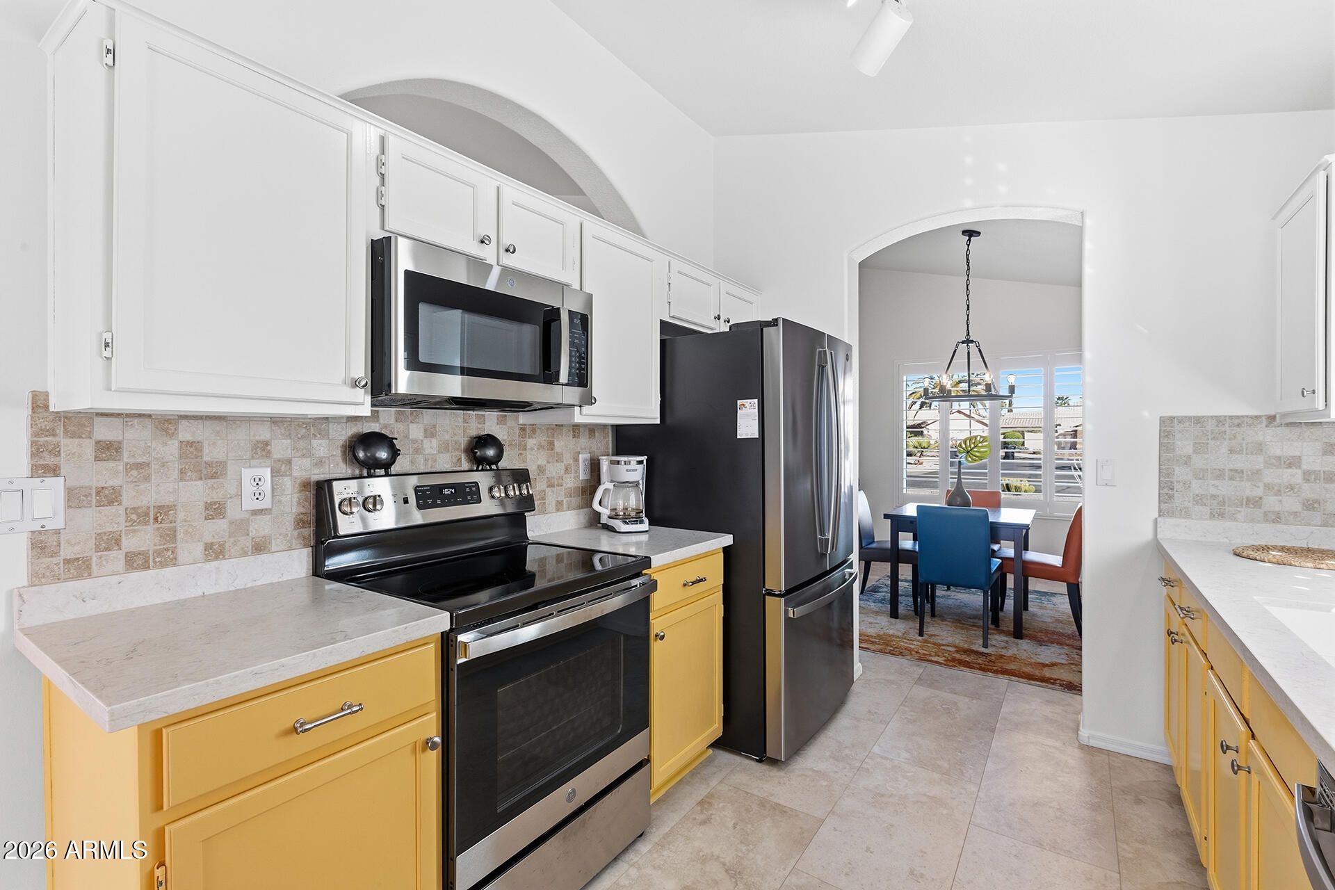 Welcome to this beautifully upgraded Monterrey floorplan in the gated community of Sun Village! Soaring vaulted ceilings and a functional layout create an inviting feel from the moment you step inside. Enjoy a formal dining space just off the kitchen and a bright breakfast nook with sliding doors to the NEWLY LANDSCAPED backyard, perfect for evening relaxation. The spacious primary suite features a NEW quartz vanity, updated shower door and frame and a custom California Closet organizer. The hall bath has also been refreshed with a NEW vanity and counter. Thoughtful upgrades include NEW SS APPLIANCES, FRESH interior paint, plantation shutters, UPDATED lighting and plumbing fixtures, epoxy garage floors, NEW security door and the comfort of a NEW AC. Move in ready and waiting for you! Sun Village is a 55+ Gated, Resort Style Community. Enjoy the 18 hole par 3 golf course, gigantic heated pool & spa, pickleball, tennis, fitness gym, woodshop, billiards, onsite entertainment in our ball room and onsite restaurant!Sun Village, is a gated, security guarded, age 55+, community, in the city of Surprise, Arizona. This small community is made up of just under 1400 homes and condominiums. The Sun Village Community has an 18 hole, par three "no-"riding" golf course, an heated swimming pool and spa, tennis, pickle ball and shuffleboard courts, horseshoe pits, an exercise room, a billiards room, sewing and crafts rooms, and a ballroom where national and international entertainment can be enjoyed! Close by you will find the spring training home of the Texas Rangers and the Kansas City Royals. Across the street from Surprises' baseball complex, is a 25 court tennis complex that is home to national and international tennis tournaments. A Regional Library, a park, and a fishing lake are also part of this fantastic recreational area.