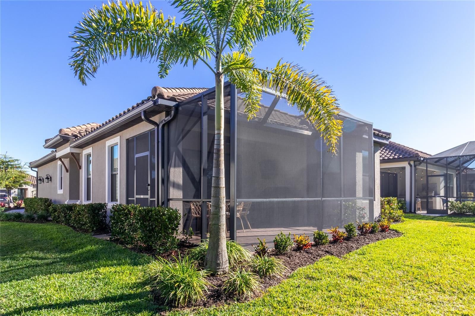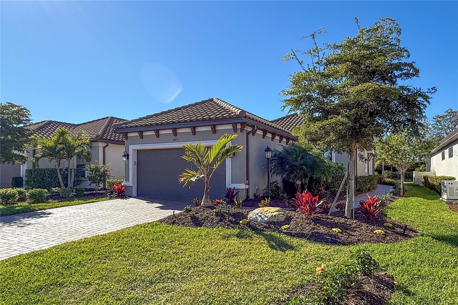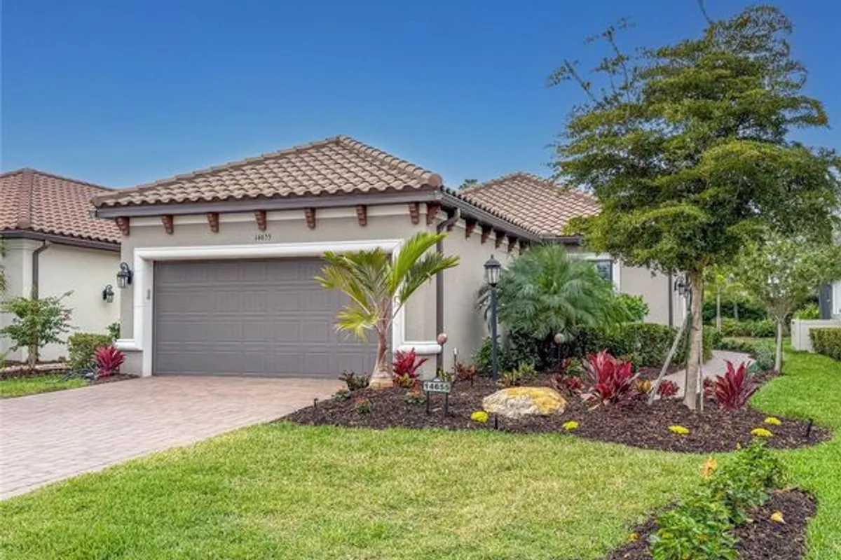 Welcome to 14655 Derna Terrace, a thoughtfully designed Roma floor plan residence offering refined upgrades, privacy, and effortless indoor-outdoor living. This two-bedroom home with a dedicated study, two baths, and an extended two-car garage is set on a desirable western-exposure lot, capturing beautiful Florida sunsets. A private side entry opens to a bright, open layout where the designer kitchen anchors the home. The kitchen features upgraded Café appliances, an expanded flat island for additional prep and gathering space, soft-close cabinetry, an Italian marble backsplash, and a motion-sense kitchen faucet. It flows seamlessly into the great room and out through sliding glass doors to a covered and extended screened lanai, equipped with a natural gas line for grilling, creating an inviting indoor-outdoor living experience. The primary bedroom is privately positioned off the great room and includes a two-sided walk-in closet with custom, solid storage by Closets by Design. The primary bathroom is a spacious retreat with a walk-in shower and dual sinks. The second bathroom features dual access from both the secondary bedroom and the main hall, providing flexibility and convenience. A dedicated study offers the ideal space for a home office or quiet retreat. This home is enhanced by a long list of upgrades, including hurricane-impact windows with a transferable lifetime warranty, custom window treatments with 2" faux wood blinds and powered sun shades, anti-mold grout treatment in both bathrooms, remote-controlled ceiling fans throughout, a custom dining room light fixture, and new professionally designed landscaping by Bella Scapes. The garage is four feet deeper than standard and includes custom storage, while a five-filter reverse osmosis water system and softener adds everyday comfort and quality. Located within Esplanade at Azario, a 600-acre bundled golf community by Taylor Morrison, residents enjoy deeded golf with no equity buy-in, an 18-hole championship course, and an exceptional collection of resort-style amenities. From dining, fitness, and wellness to social events guided by an on-site Lifestyle Director, Esplanade delivers a true year-round vacation lifestyle. Set in the heart of Lakewood Ranch, one of Florida’s most sought-after master-planned communities, this location offers quick access to I-75, Tampa and Sarasota, world-class beaches, University Town Center shopping, major employment hubs, cultural attractions, professional sports, and multiple airports. Convenience, connection, and quality of life come together here.