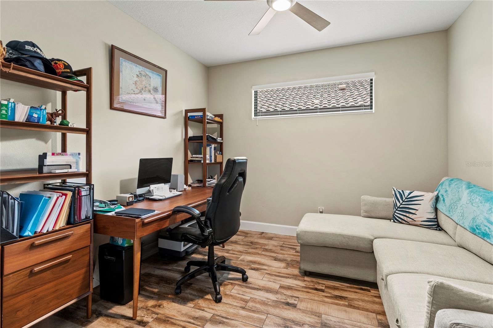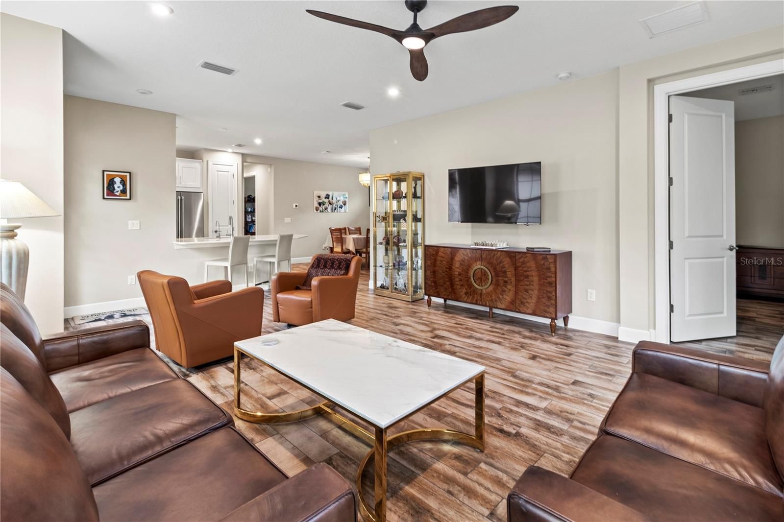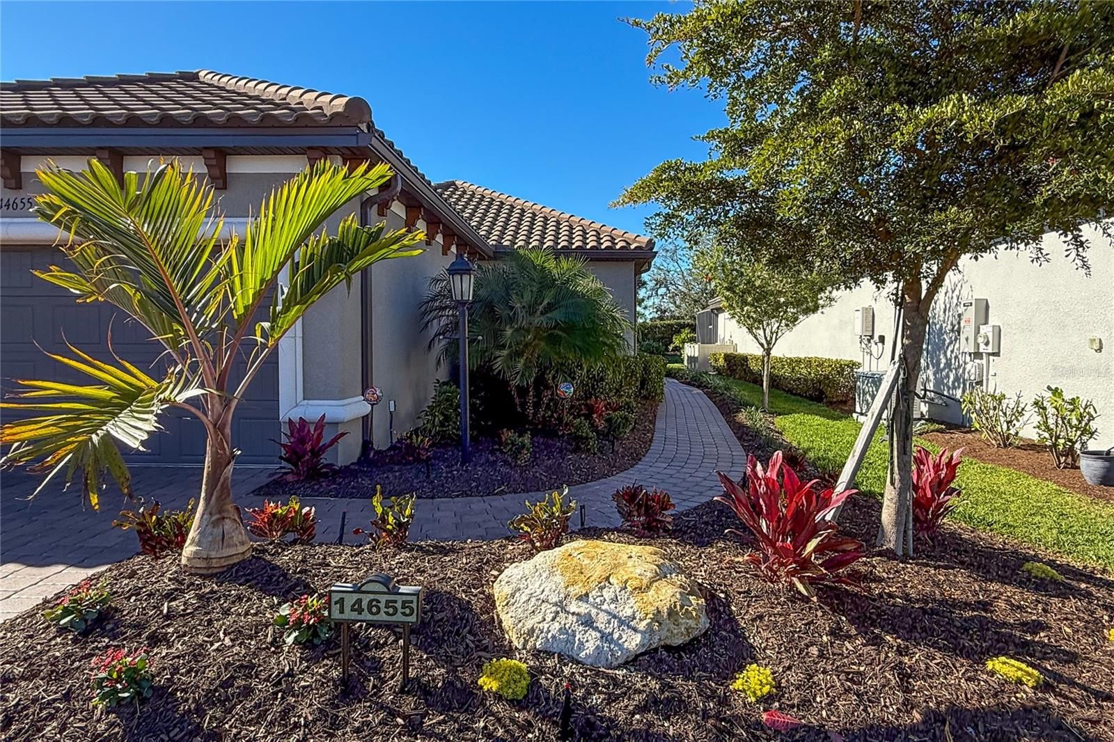 Welcome to 14655 Derna Terrace, a thoughtfully designed Roma floor plan residence offering refined upgrades, privacy, and effortless indoor-outdoor living. This two-bedroom home with a dedicated study, two baths, and an extended two-car garage is set on a desirable western-exposure lot, capturing beautiful Florida sunsets. A private side entry opens to a bright, open layout where the designer kitchen anchors the home. The kitchen features upgraded Café appliances, an expanded flat island for additional prep and gathering space, soft-close cabinetry, an Italian marble backsplash, and a motion-sense kitchen faucet. It flows seamlessly into the great room and out through sliding glass doors to a covered and extended screened lanai, equipped with a natural gas line for grilling, creating an inviting indoor-outdoor living experience. The primary bedroom is privately positioned off the great room and includes a two-sided walk-in closet with custom, solid storage by Closets by Design. The primary bathroom is a spacious retreat with a walk-in shower and dual sinks. The second bathroom features dual access from both the secondary bedroom and the main hall, providing flexibility and convenience. A dedicated study offers the ideal space for a home office or quiet retreat. This home is enhanced by a long list of upgrades, including hurricane-impact windows with a transferable lifetime warranty, custom window treatments with 2" faux wood blinds and powered sun shades, anti-mold grout treatment in both bathrooms, remote-controlled ceiling fans throughout, a custom dining room light fixture, and new professionally designed landscaping by Bella Scapes. The garage is four feet deeper than standard and includes custom storage, while a five-filter reverse osmosis water system and softener adds everyday comfort and quality. Located within Esplanade at Azario, a 600-acre bundled golf community by Taylor Morrison, residents enjoy deeded golf with no equity buy-in, an 18-hole championship course, and an exceptional collection of resort-style amenities. From dining, fitness, and wellness to social events guided by an on-site Lifestyle Director, Esplanade delivers a true year-round vacation lifestyle. Set in the heart of Lakewood Ranch, one of Florida’s most sought-after master-planned communities, this location offers quick access to I-75, Tampa and Sarasota, world-class beaches, University Town Center shopping, major employment hubs, cultural attractions, professional sports, and multiple airports. Convenience, connection, and quality of life come together here.