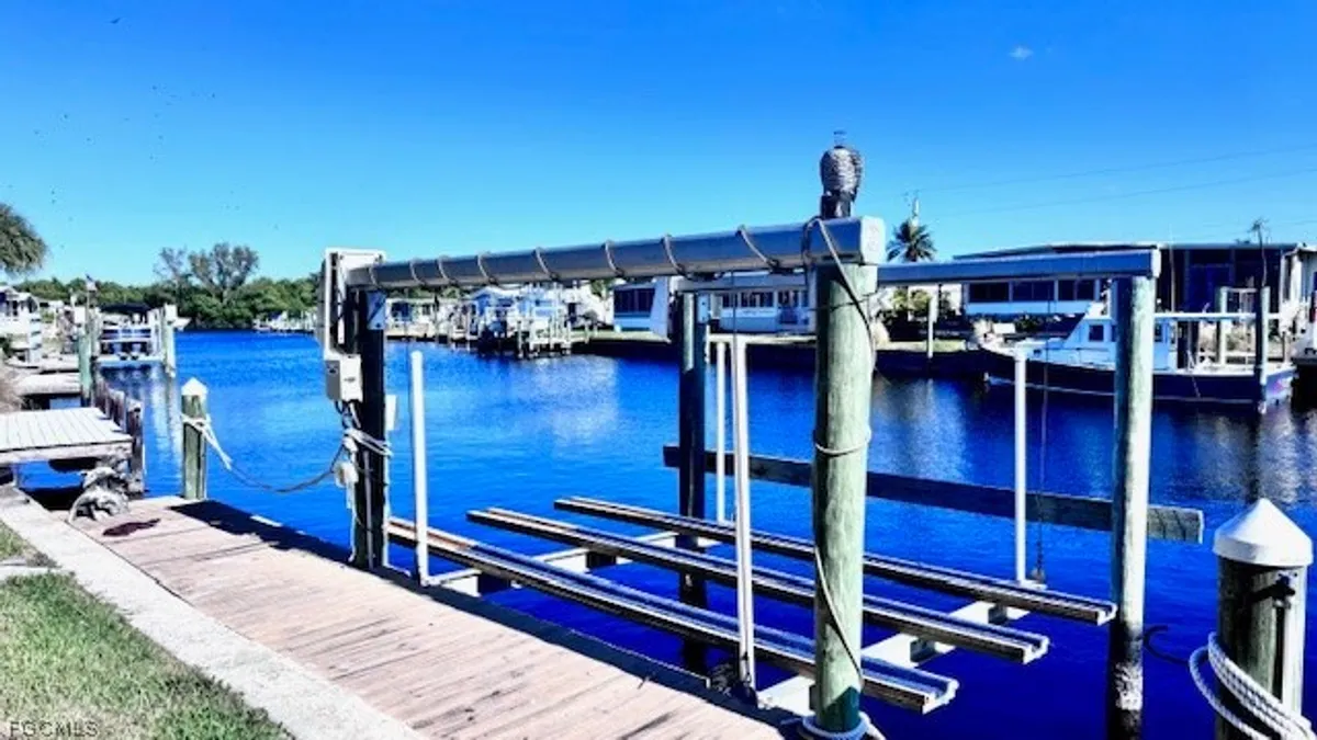 WATERFRONT HOME WITH BOAT DOCK/LIFT. Welcome to your dream home in Old Bridge Village Co-op! This stunning manufactured home boasts 2 bedrooms and 2 bathrooms, granite counters, white appliances, and vinyl flooring throughout. Enjoy the luxury of waterfront living with your very own boat dock and lift, perfect for those who love to spend their days out on the water. Take a dip in the brand new heated-saltwater community pool or explore the neighborhood with the included golf cart. The large lanai is equipped with heavy-duty windows for hurricane and storm protection, ensuring your safety and peace of mind. This home has been beautifully remodeled in 2023, with new windows installed in 2025. The convenience of a new washer and dryer makes laundry a breeze. This turnkey property is perfect for those looking for a move-in ready home with an open concept layout, ideal for entertaining guests or simply relaxing in style. Don't miss out on the opportunity to make this exquisite home yours and start living the Florida lifestyle you've always dreamed of. Old Bridge Village, is a friendly, 55+ resident owned community right off the Caloosahatchee River and Gulf Access with lots of amenities, activities all year, clubs and entertainment. There is a resort style brand new Salt-water heated pool and hot tub, fitness center, recreation center, bocce ball, pickleball, shuffleboard, tennis, basketball, putting green, horseshoe pits, community clubhouse, fishing pier, kayak and boat launch and an 81 slip marina. Drive your golf cart around the community, to and from your activities or to Palm Point where you can fish, have a picnic, watch the boats or just enjoy the sunset. This community is a hidden gem with just minutes by boat or car to downtown Ft. Myers and right between 2 airports with approximately 30 minutes to both Southwest Florida International Airport and Punta Gorda Airport.