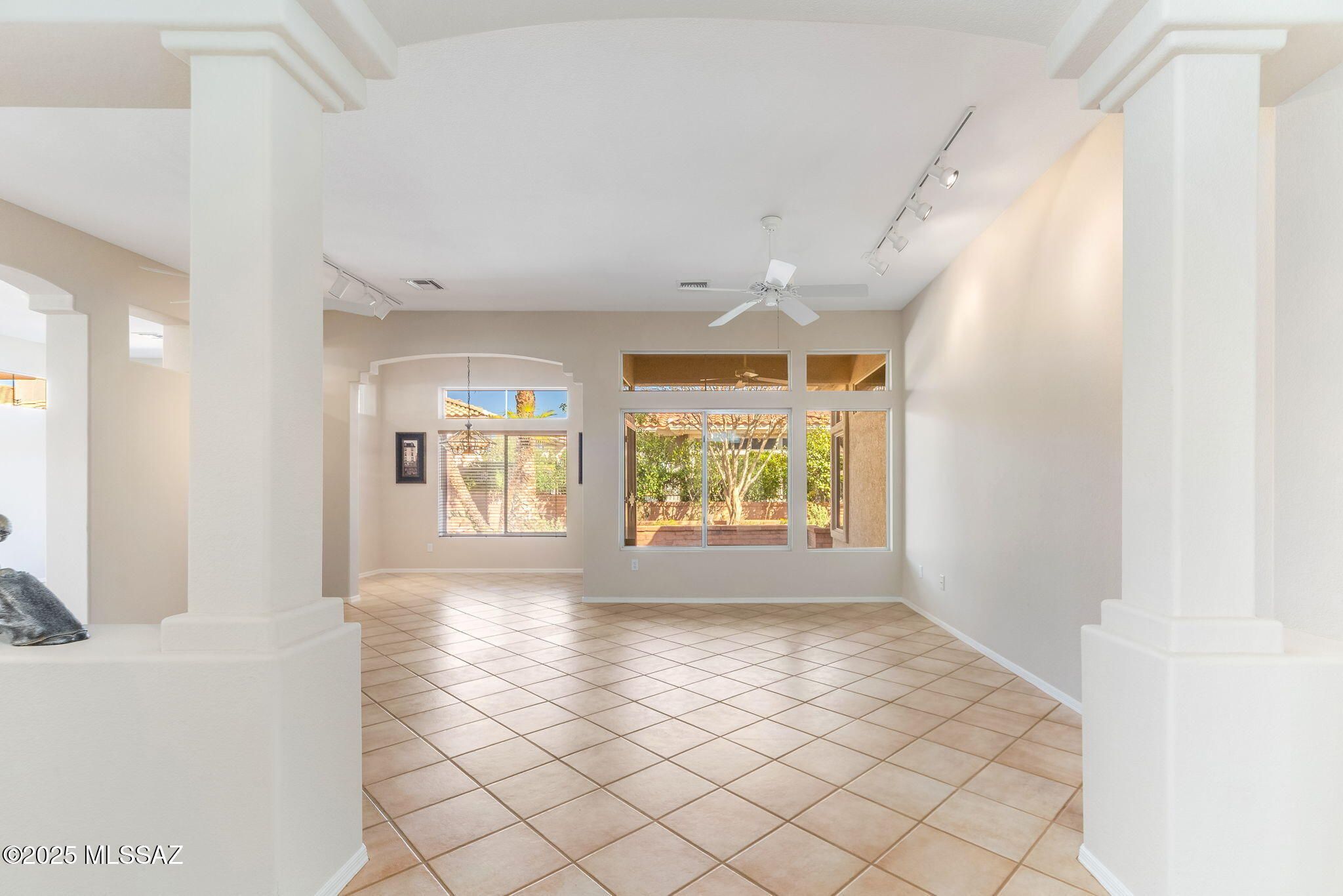 Gorgeous 1,964 SqFt, 2 Bedroom, 2 Bath home with a bonus office area is located in the Premier Active Adult Community, Sun City Vistoso in Oro Valley. From the moment you set eyes on this Impeccably Maintained property you will be delighted by how Spacious, Bright and Beautiful this home is. The flagstone walkway will guide you through the courtyard with mature landscaping, to a glass double door entry with wrought iron security door allowing the fresh air in. Once inside, the foyer welcomes you to an open floor plan that is complimented by soft neutral tones, ceramic tile flooring, high ceilings, and window walls that let in an abundance of natural light and boast gorgeous garden views with an easy flow throughout the home for comfortable living and entertaining guests. The spacious