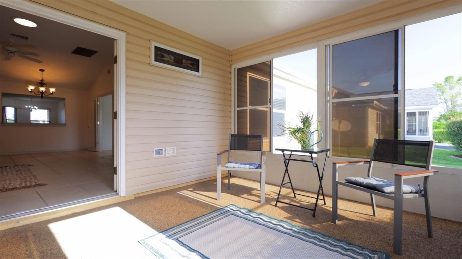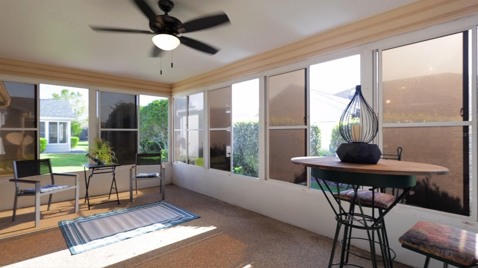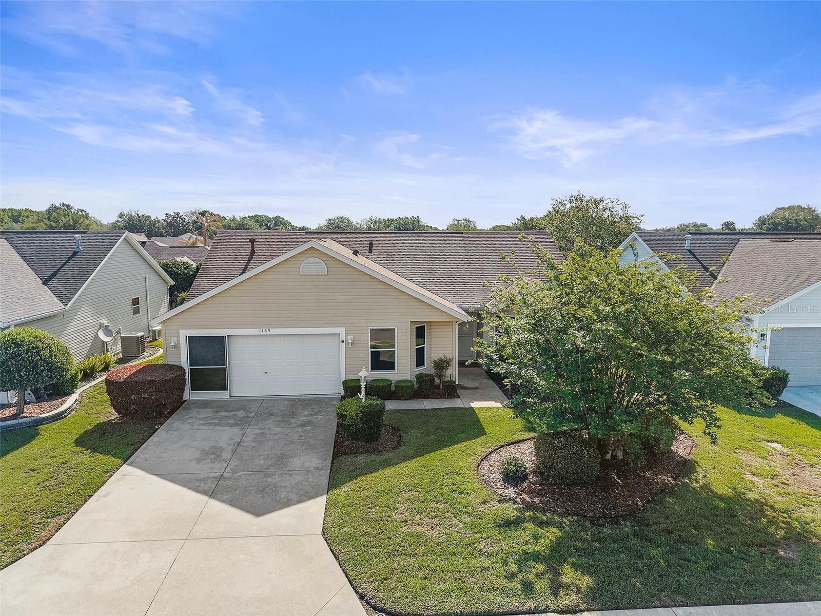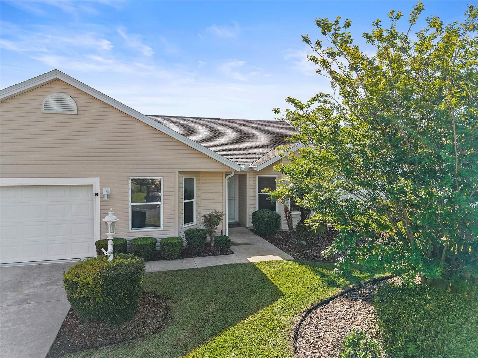 **NO BOND • ROOF 2019 • 3/2 Wisteria (Ashland III) • GAS COOKING • TILE FLOORS • PARTIALLY FURNISHED • GOLF CART AVAILABLE (2021 GAS)**Watch the Video Tour by clicking on the TOUR link above. Welcome Home to this beautifully maintained Wisteria (Ashland III) model, ideally located in the Village of Glenbrook with convenient access to Spanish Springs Town Square, Lake Sumter Landing Market Square, and the popular State Road 466 corridor. From the moment you arrive, you’ll appreciate the inviting curb appeal and the peace of mind that comes with a newer roof (2019) and NO BOND. Step inside to discover an open, split floor plan with vaulted ceilings and tile flooring throughout, creating a bright and spacious feel. The kitchen is well-appointed with stainless steel appliances, abundant cabinetry, generous counter space, and a cozy eat-in nook—perfect for casual dining. Gas cooking adds an extra level of functionality for those who love to cook, while the open pass-through design seamlessly connects the kitchen to the dining and living areas, making entertaining effortless. The living and dining spaces flow comfortably together, offering flexibility for both everyday living and hosting guests. The primary suite is generously sized, easily accommodating a seating area, and features a large walk-in closet along with an ensuite bathroom complete with a linen closet for added storage. On the opposite side of the home, two guest bedrooms provide privacy and comfort, each with built-in closets and easy access to the guest bathroom—ideal for visitors or flexible use as a home office or hobby space. An added pocket-door closure gives your guests their privacy while visiting. Additional highlights include newer toilets, washer and dryer (2023), a two-car garage, and the option to purchase a 2021 gas golf cart separately. Being sold partially furnished, this home is move-in ready and perfect for seasonal or full-time living. The enclosed rear lanai offers a spacious extension of the living area, ideal for relaxing or entertaining year-round. Surrounded by mature landscaping, this outdoor space provides a private and peaceful setting—perfect for enjoying your morning coffee or unwinding in the evenings. Enjoy the best of The Villages lifestyle with close proximity to shopping, dining, entertainment, golf, and recreation—all just minutes from your front door.