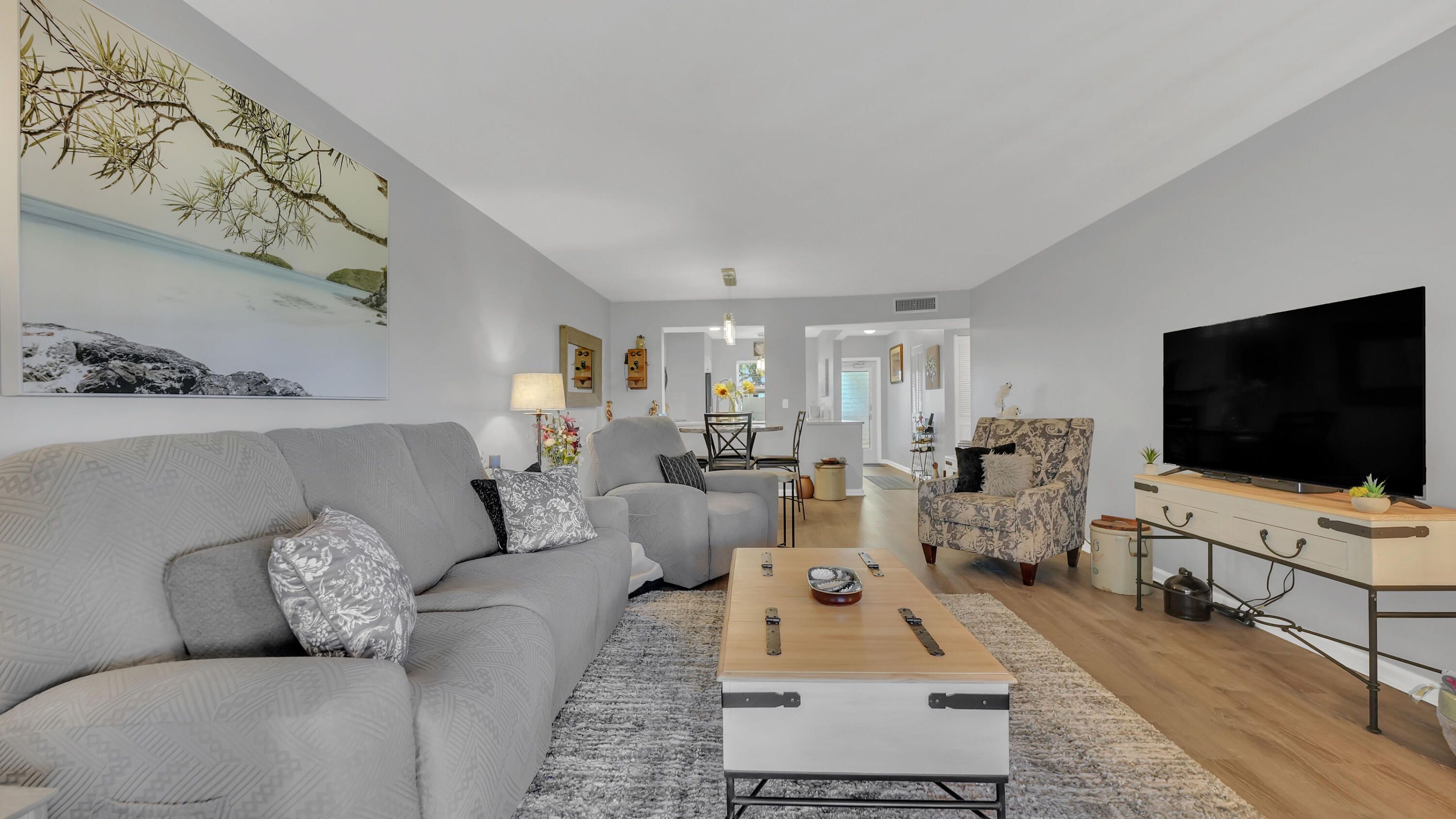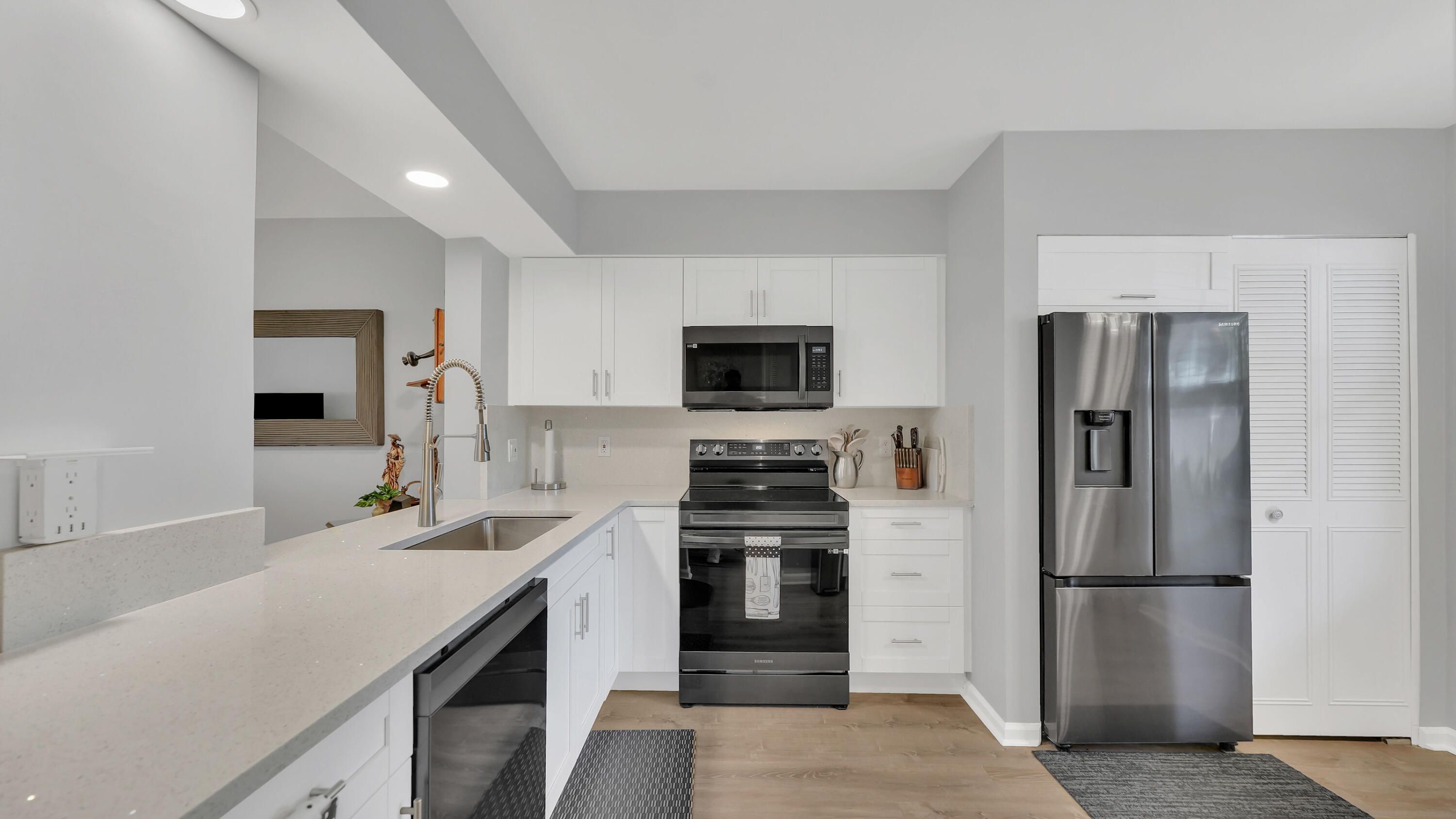 Beautifully renovated 2 bedroom, 2 bath first floor condo located in an active 55+ community! This move-in ready home features all new electrical, a brand new kitchen with stainless steel appliances, a tankless water heater, newer AC and a washer/dryer in unit! Stylish waterproof laminate flooring throughout. Enjoy the best of Florida living with two private patios; a welcoming front patio surrounded by lush greenery and a spacious screened-in rear patio with additional storage. Impact glass throughout providing peace of mind and energy savings. Assigned parking just steps from your front door! Walk to the brand new clubhouse, community pool, hot tub, fitness center, billiards and more! Close proximity to shopping and dining.