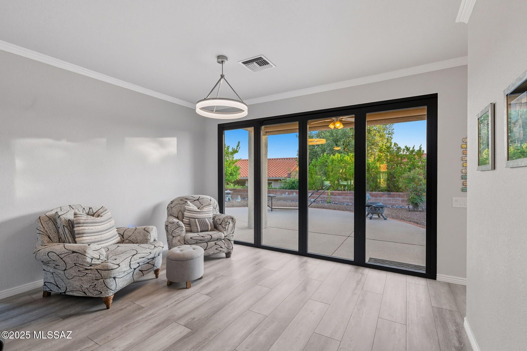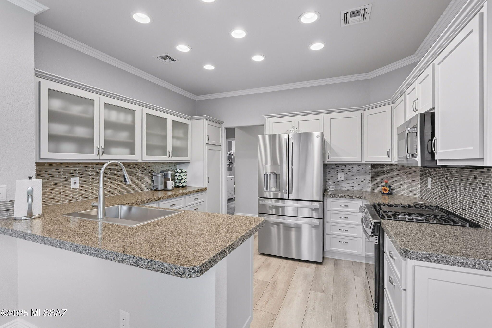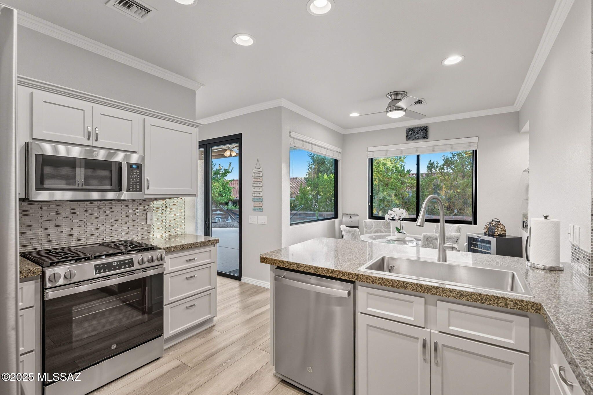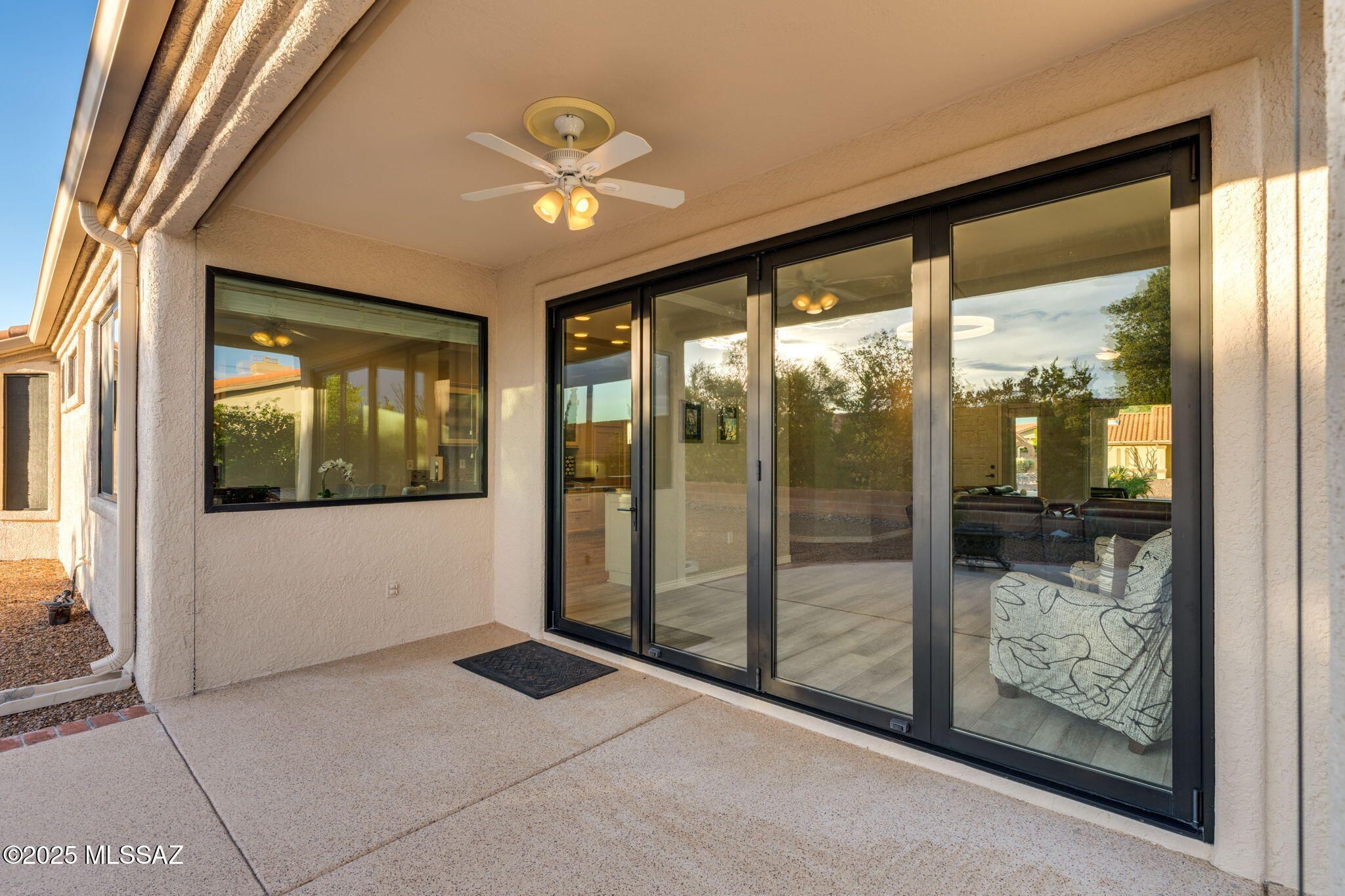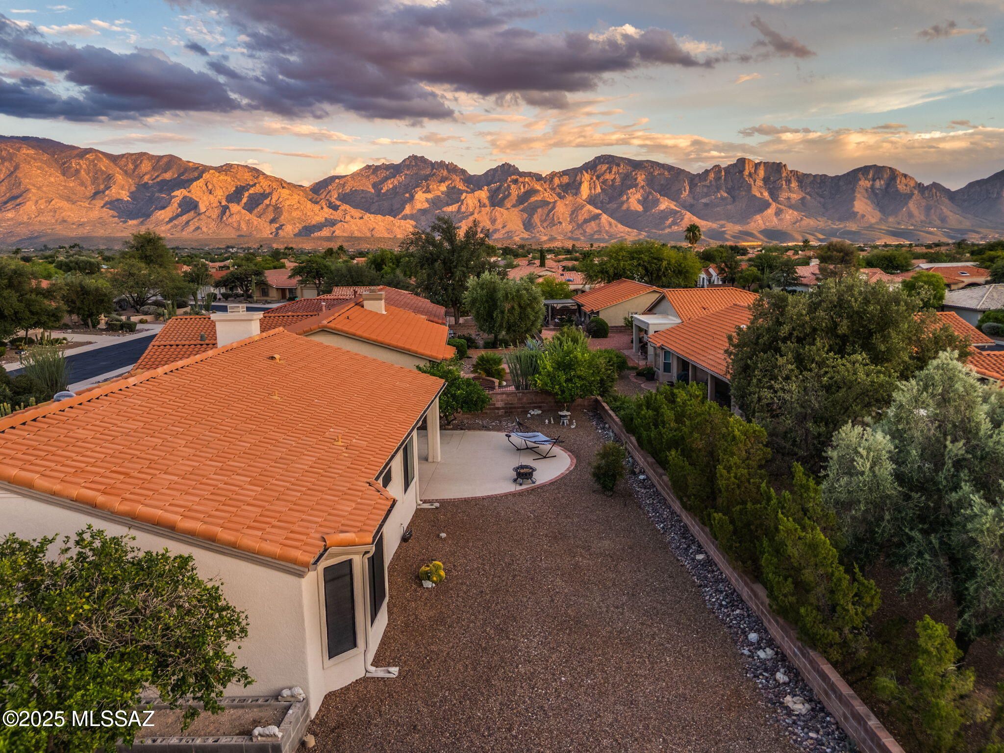 Nearly every detail of this Sun City Vistoso residence has been thoughtfully upgraded, creating a turnkey home that is both refined and inviting. From the moment you step inside, the level of care and quality is unmistakable, offering peace of mind for the next owner.The living room is a true centerpiece of the home - expansive in size, anchored by an elegant electric fireplace, and enhanced by a large picture window that perfectly frames sweeping mountain views. A mounted television and Vizio home theater system convey, making it an ideal setting for both relaxing evenings and entertaining guests.The kitchen has been beautifully reimagined with refinished cabinetry, a new tile backsplash, and brand new stainless steel appliances. The LaCantina four-panel bi-folding door