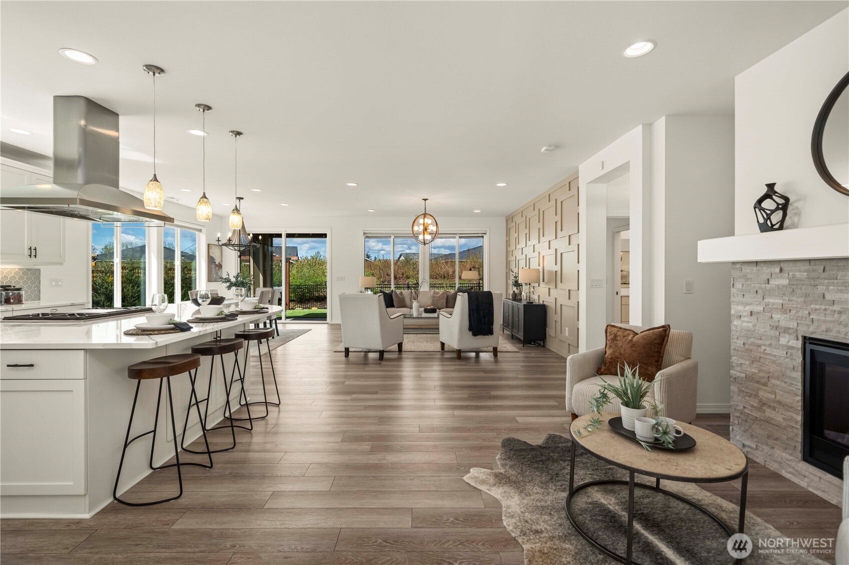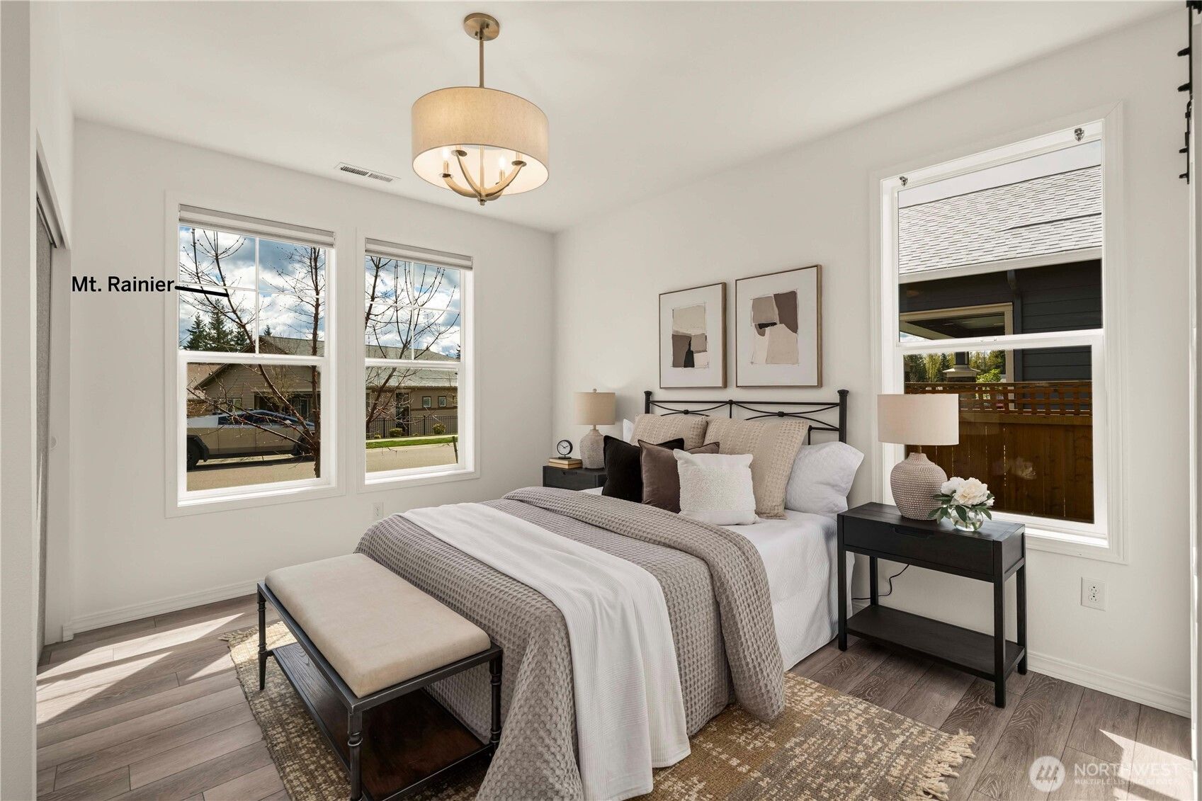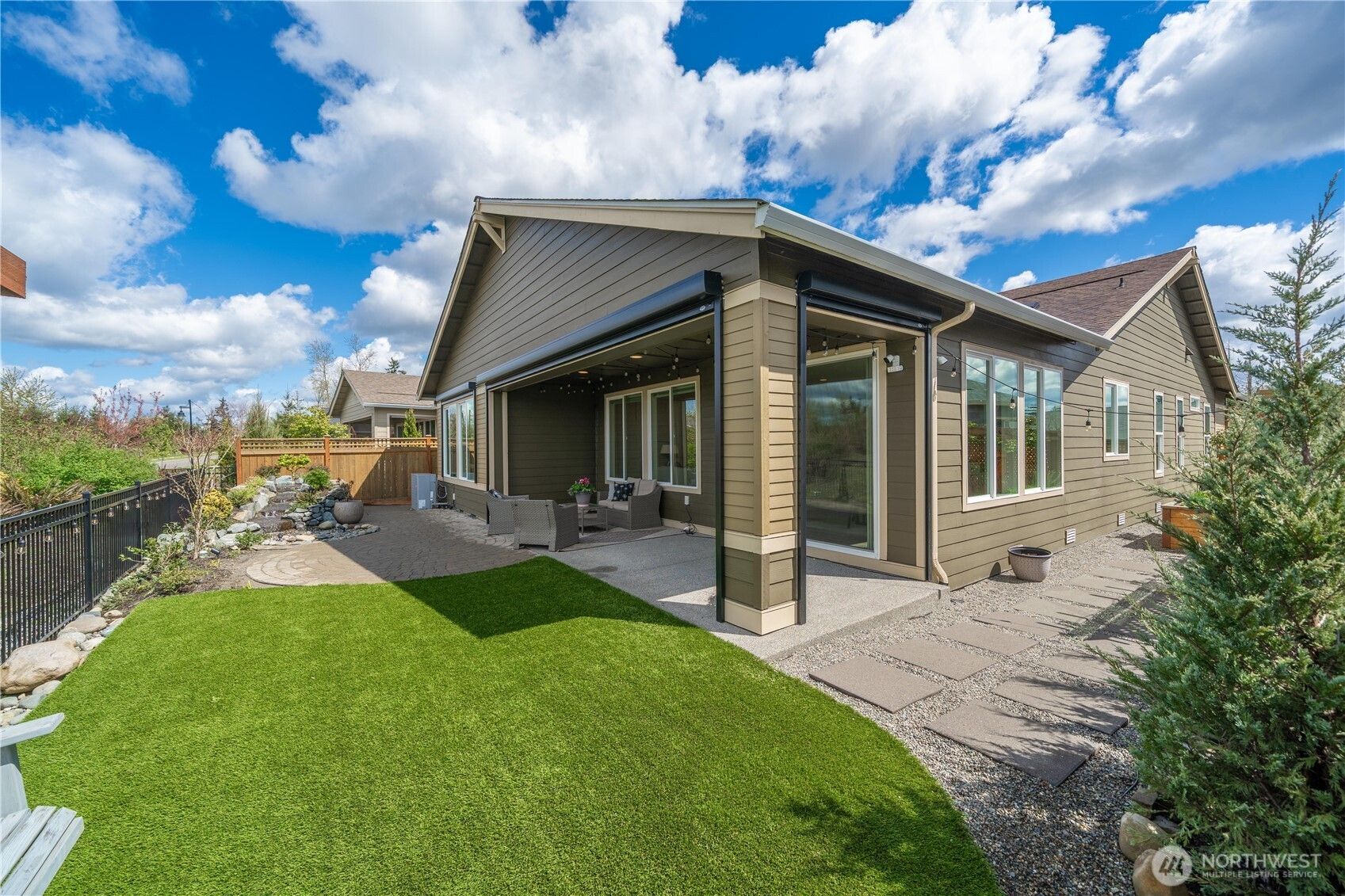 Discover this impeccably upgraded Elate w/ Mt. Rainier views in the acclaimed 55+ Trilogy at Tehaleh resort community. Perfectly positioned against a permanent green space w/ exceptional privacy, expansive western exposure & breathtaking sunsets. This home offers an exceptional sense of privacy alongside a professionally curated outdoor retreat featuring a stunning illuminated water feature, raised patios, top grade turf, trellises, mature rose vines & lush landscaping. Inside, the home showcases a refined, modern aesthetic w/ hard surface flooring throughout, stacked stone fireplace & a striking decorative feature wall, complemented by stunning designer lighting throughout. The chef’s kitchen is a true centerpiece—highly upgraded w/ premium GE Monogram appliances, elevated finishes, Quartz counters & glass backsplash = timeless style. The primary suite offers a luxurious escape, complete w/ a spa-inspired bath featuring an oversized glass shower w/ dual shower heads, & a Toto automatic heated-seat toilet. Additional highlights include motorized sunshades in the great room & primary suite, blackout shades, Smart home innovation, storm doors w/ screens at both the front entry & garage service door, fully fenced & irrigated grounds & Shelf Genie storage systems in kitchen. Insulated interior walls & garage, heat pump. Experience the amazing Lodge/pool/fitness/restaurant & bar/Pickleball/retail/Post & Pour bistro/trails.