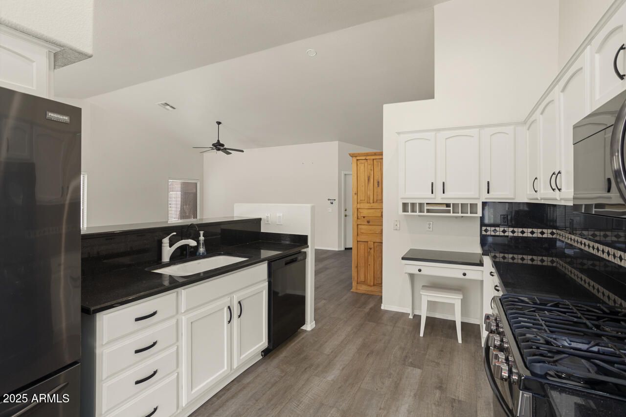 Major items replaced! HVAC 2024, Roof, water heater, finish on the driveway 2023 totaling $26,000! Other improvements include remodeled bathrooms and flooring! Move in and ENJOY! Vaulted ceilings and open floor plan! Great entertaining home! Kitchen offering a ''contemporary flair'' with white cabinets, black Quartz counter tops and backsplash and black stainless appliances. Nook area with access to the outdoor living spaces. Primary bedroom w/ vaulted ceilings, remodeled bathroom with dual sinks and walk-in closet. Guest bedroom and updated bath next to it. Bedrooms separated by a den area. Laundry room conveniently located near bedrooms, washer/dryer included. Private backyard with lush landscaping, water feature, BBQ and pergola. 2 car extended garage, epoxy flooring, sink & cabinet