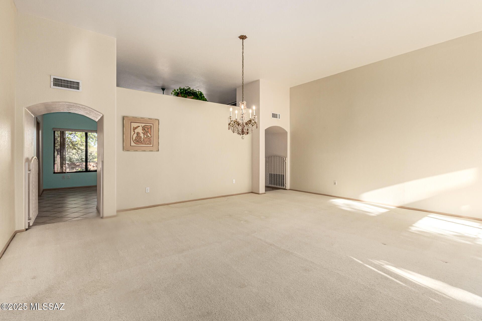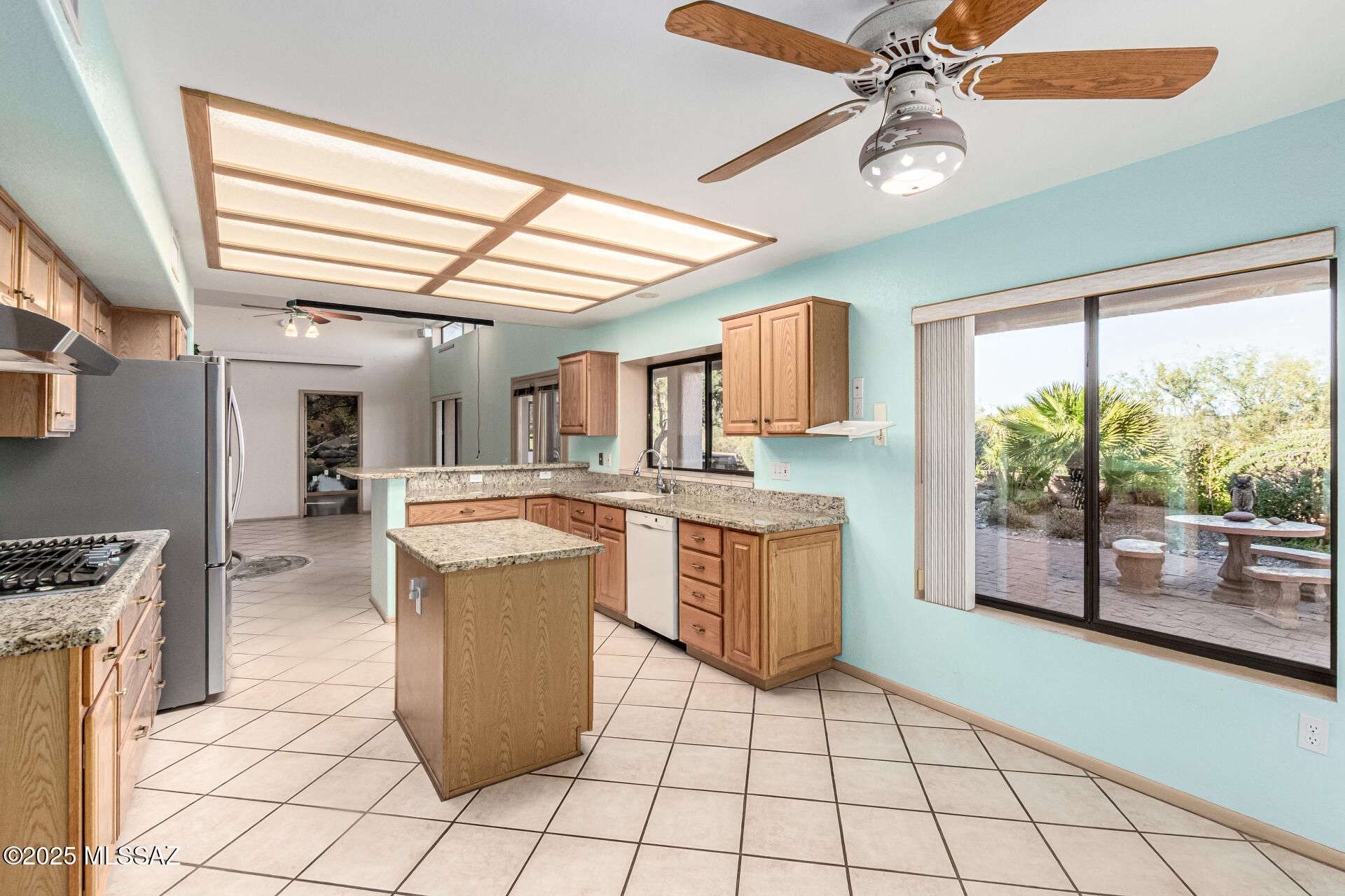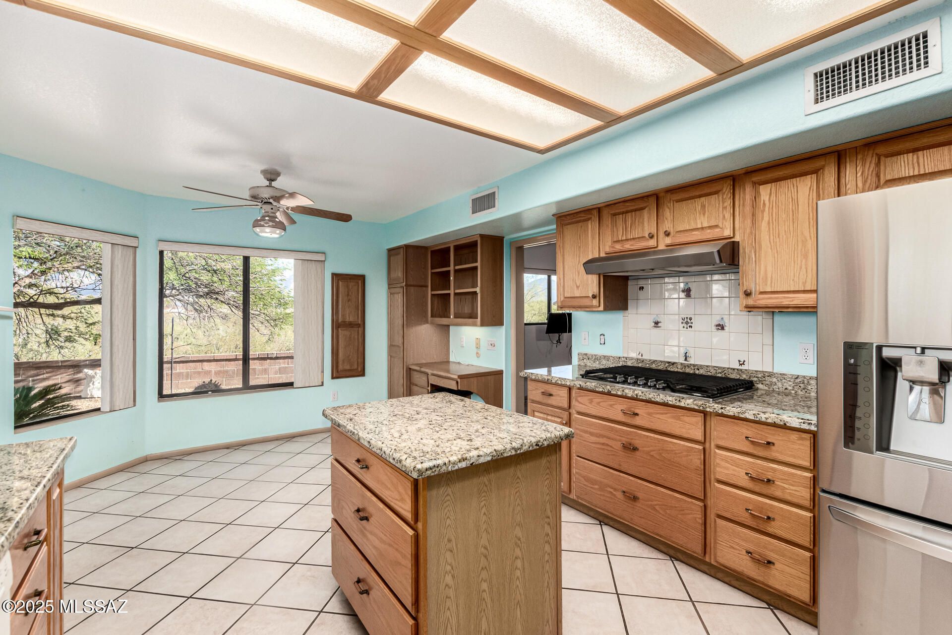 Welcome to your new home in Sun City Vistoso with Spectacular Mountain Views! This lovely cul-de-sac home boasts a new roof, new HVAC, mature landscape, & a 2-car garage. Inside, you'll find bright and airy living spaces with tile flooring, carpet in all the right places, classic light fixtures, arched passageways, an earthy palette that creates a cozy ambiance, and abundant natural light. The impeccable kitchen is equipped with oak cabinetry, granite countertops, built-in appliances, and an island. The spacious den has attached cabinets/desk, making it perfect for an office. The tranquil main suite features a stunning mural, a bay window, an extra sized walk-in closet, & a bthrm w/ an oversized dual-sink vanity and a separate shower & tub. Out back, your expansive covered