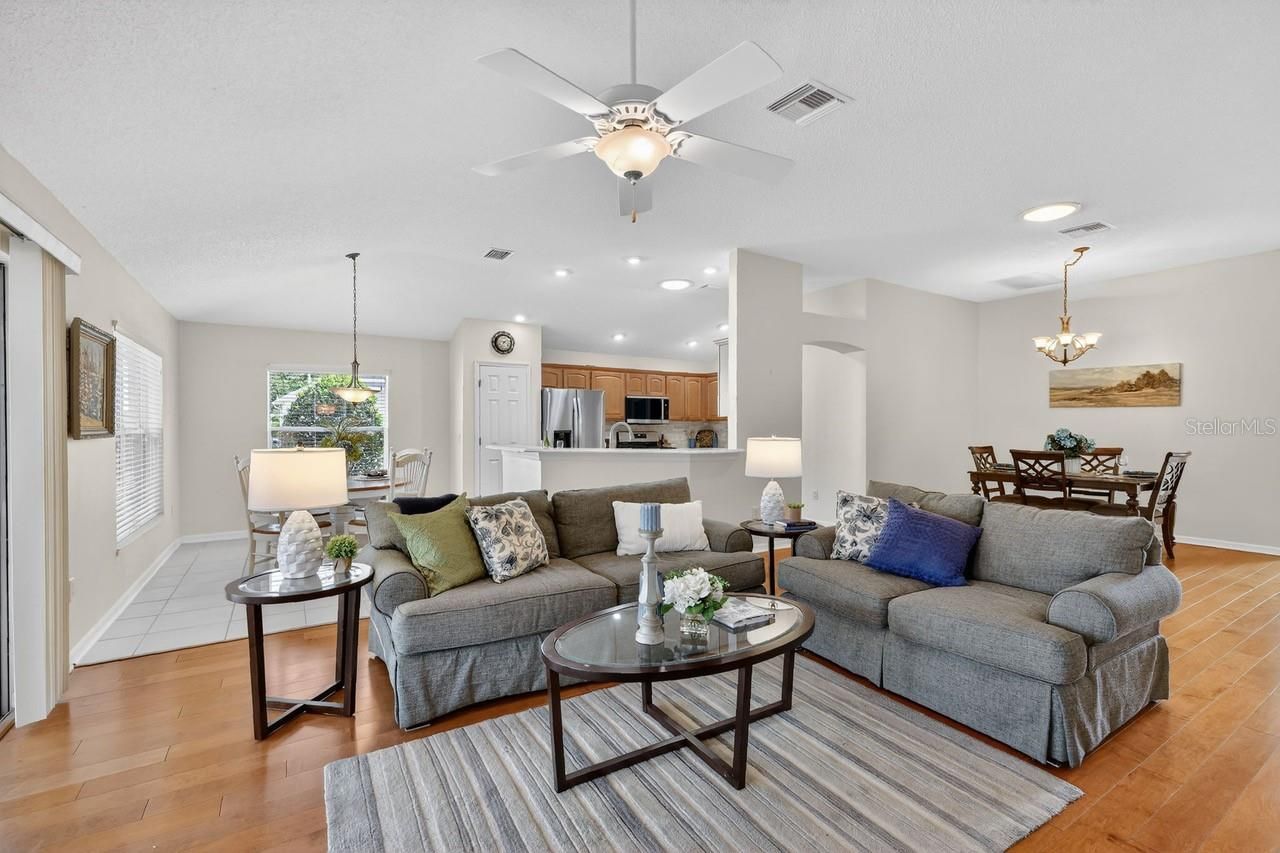 Perfectly positioned in the heart of The Villages in the Village of Sunset Pointe, this exceptional home offers the rare combination of central location, golf-cart convenience, PRIVACY, and PREMIUM VIEWS. Located just minutes by golf cart from Lake Sumter Landing, residents enjoy easy access to nightly entertainment, waterfront dining, shopping, and everyday conveniences—including ALDI—all without the need to drive. Set on an oversized 0.26-acre lot, this property stands apart from surrounding homes with no rear neighbors. The expansive setting provides exceptional privacy along with breathtaking panoramic views of the Pelican Golf Course and preserve, creating a peaceful backdrop rarely found in such a central Villages location. The thoughtfully designed home offers 3 bedrooms, 2 bathrooms, and 2,044 square feet of living space, complemented by a 3-car garage with dedicated golf cart space—a must-have for Villages living. Built in 2005 and offered with NO BOND, this home delivers both comfort and long-term value. Outdoor living is enhanced by a custom hot tub under a 36x22 foot birdcage, allowing you to relax and unwind year-round while enjoying the open views and privacy of the oversized lot—without the expense, maintenance, or insurance considerations of a full-size pool. Homes offering this combination of central location, oversized private lot, golf course and preserve views, custom hot tub, and golf-cart accessibility are increasingly rare. This is a standout opportunity to enjoy the very best of Villages living—convenient, connected, and quietly private. Many extra UPGRADES including: ROOF 2020, BRAND NEW STAINLESS STEEL APPLIANCES 2026, CUSTOM PAVERS, HARDWOOD FLOORS in main living area and master bedroom, custom cabinets and Murphy bed in guest bedroom. Inquire for a complete FEATURES list. Please view the 3D walkthrough of this exceptional home. Call today to schedule your private showing.