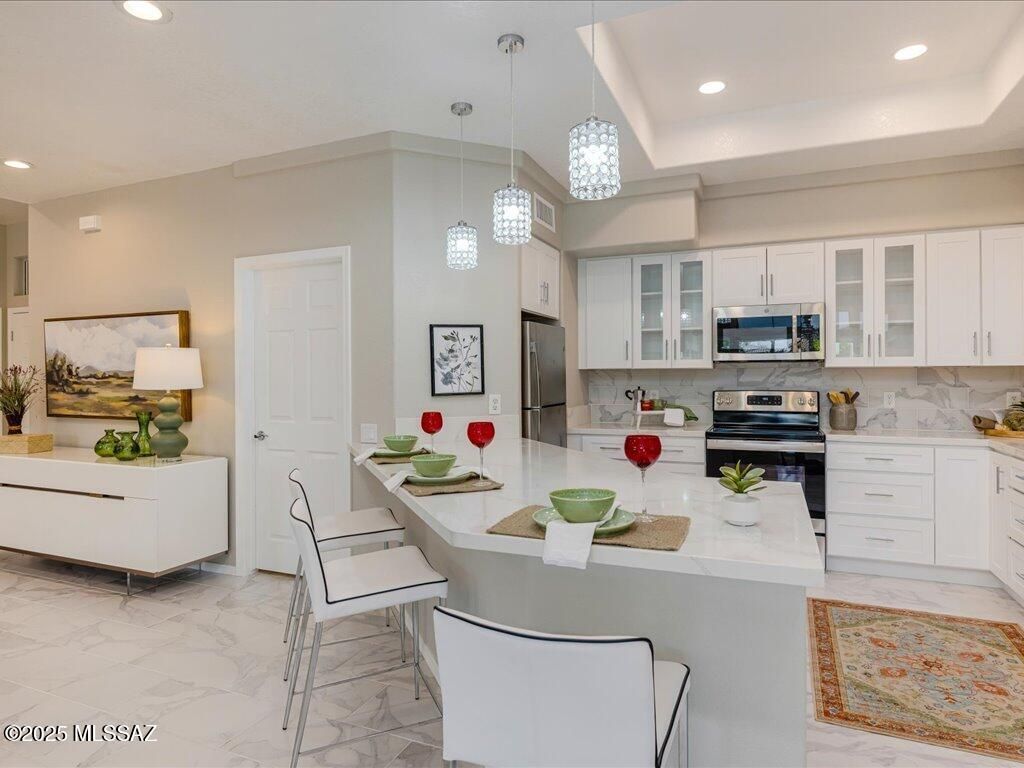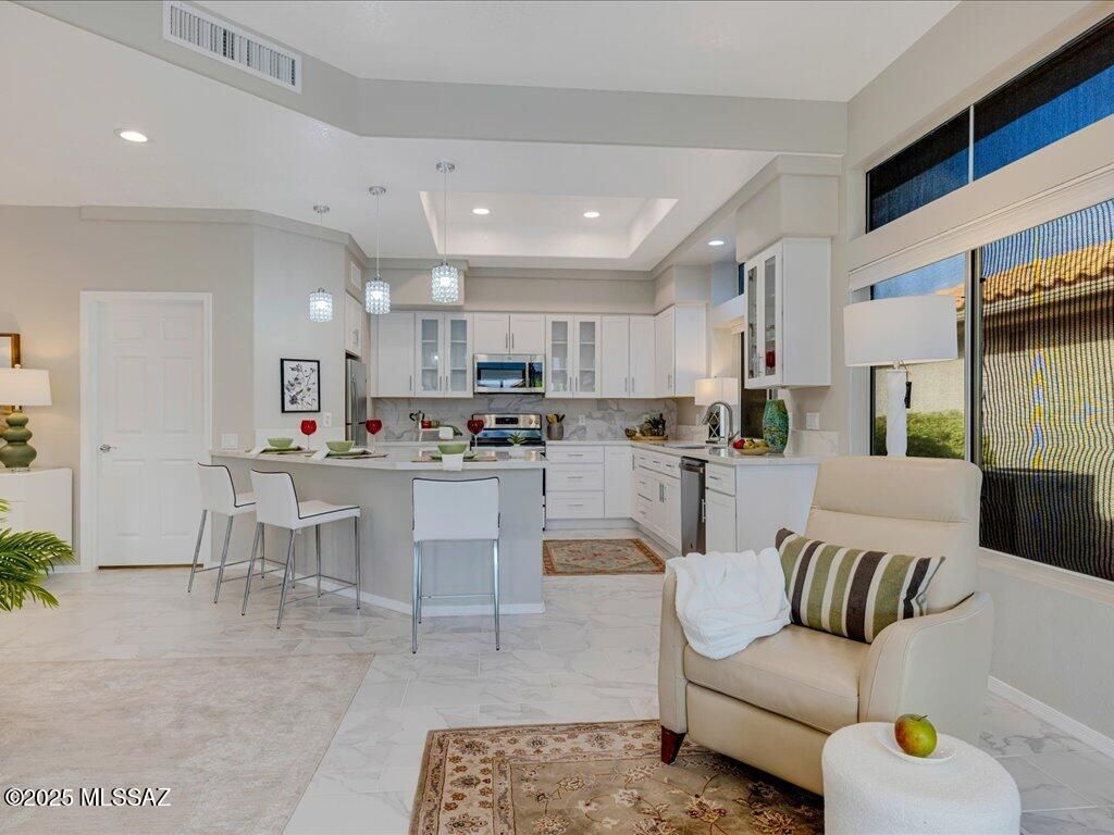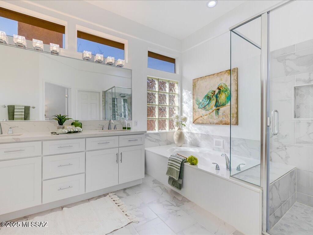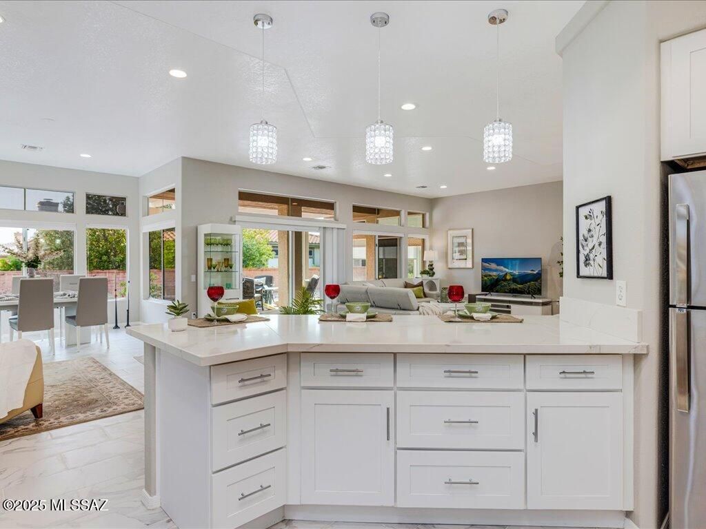 Magnificent remodeled dream home! Super light and bright and move-in ready with fresh interior paint, new cabinets and countertops through out. Tile floors, gas fireplace, separate laundry room with sink and huge pantry. Walk-in closet-in primary which also has a double vanity and beautiful view. Inviting front patio with a great Catalina mountain view. Extra wide double garage. This is a must see home!!!