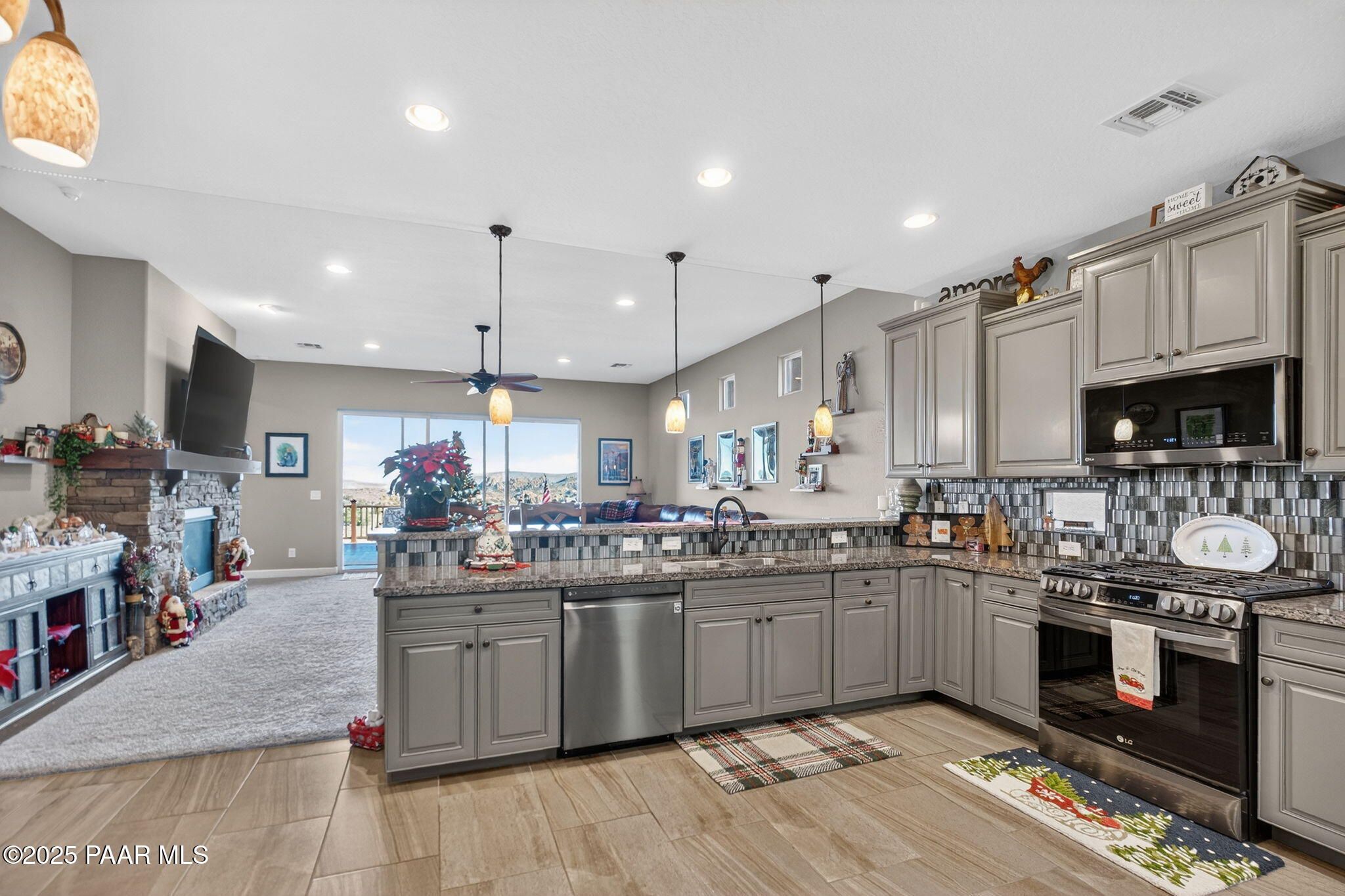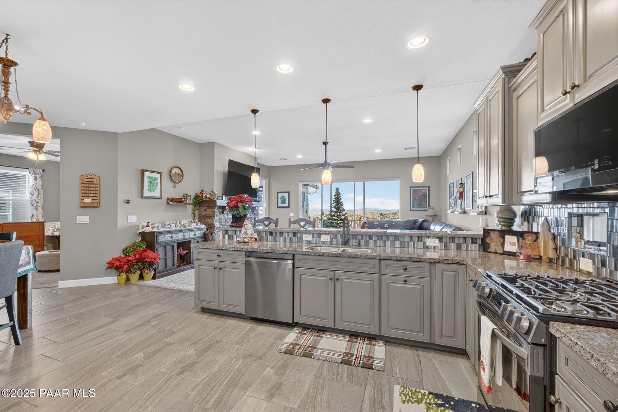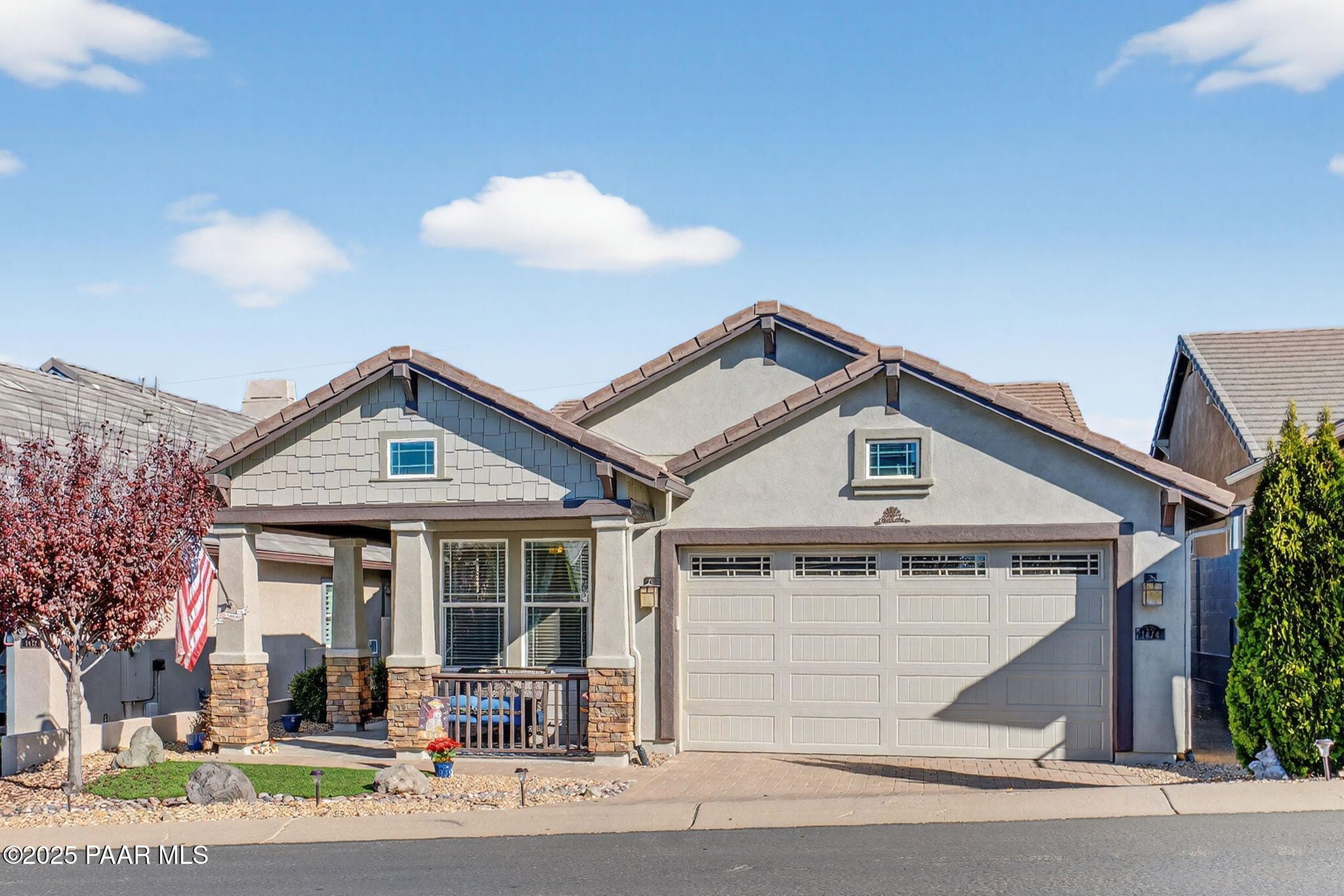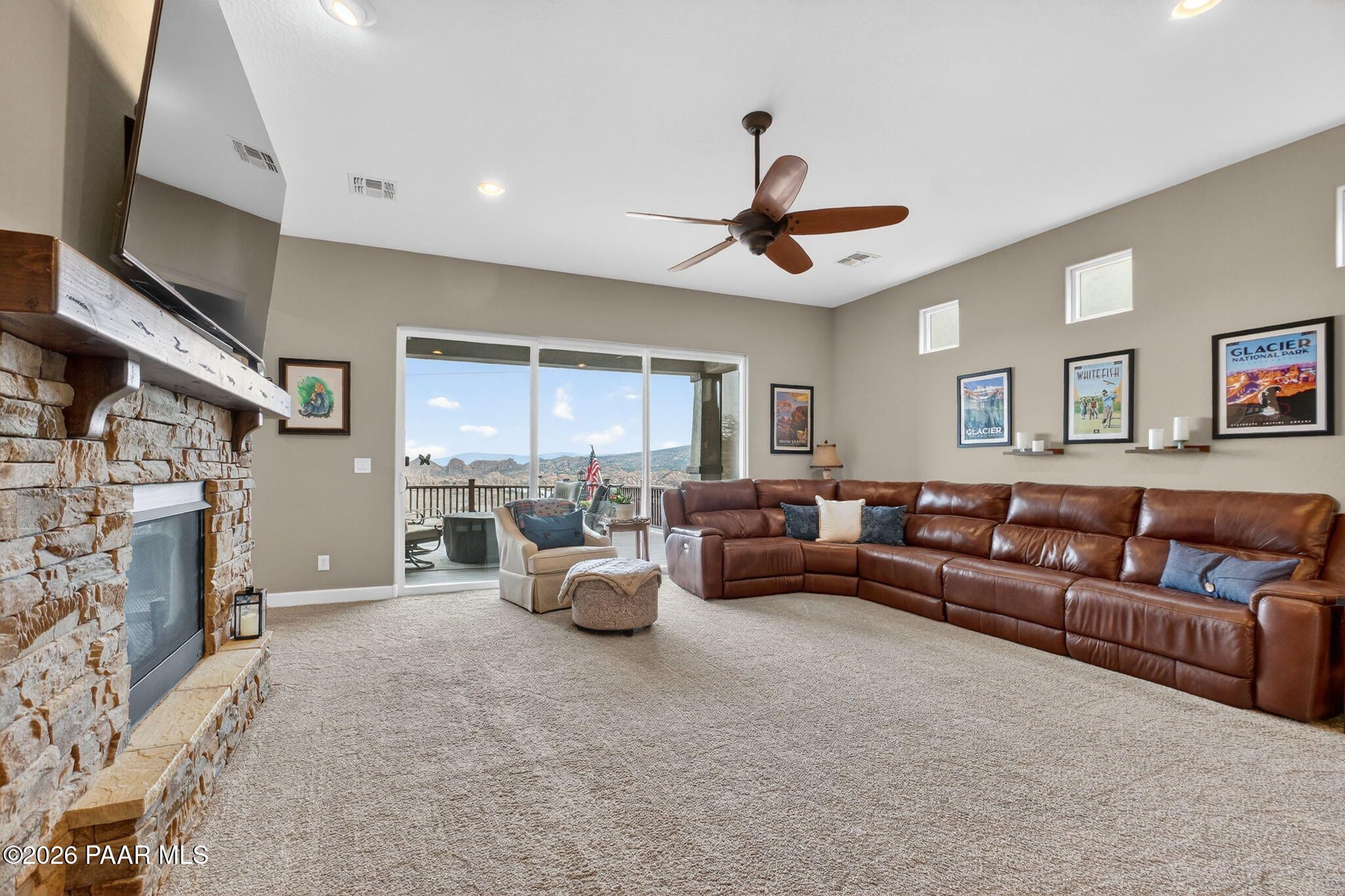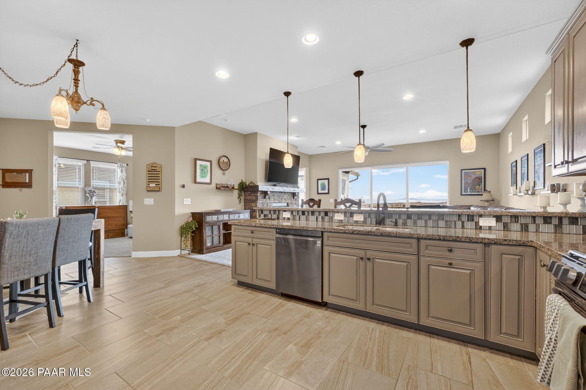 Enjoy stunning, up-close views of Prescott's iconic Granite Dells right from your kitchen sink and living room! This beautifully updated home in Astoria offers a single-level, open floor plan filled with modern finishes throughout. Upgrades include granite countertops, tiled kitchen and bathroom backsplashes, stainless steel appliances (all of which convey and were replaced in 2023), tile flooring, custom lighting, custom cabinetry, and a gorgeous stack-stone fireplace that anchors the living space.The home features 2 bedrooms PLUS a den that can easily serve as a potential 3rd bedroom. The spacious primary suite includes plantation shutters, private deck access, a luxurious bath, and a large walk-in closet. A new awning enhances the outdoor living experience, adding shade and comfort to the expanded deck.The 2021 deck expansion added stairs to the backyard, electrical wiring, TV hookup, and a ceiling fan--perfect for enjoying Prescott's four-season climate. A whole-home water filtration system was also installed in 2024. The exterior was professionally painted in 2025, giving the home a fresh, modern look. The oversized crawlspace offers excellent storage with potential to be converted into additional living space.Located in a friendly, gated neighborhood within one of Prescott's premier subdivisions, this home is truly move-in ready and designed for comfortable, modern living!