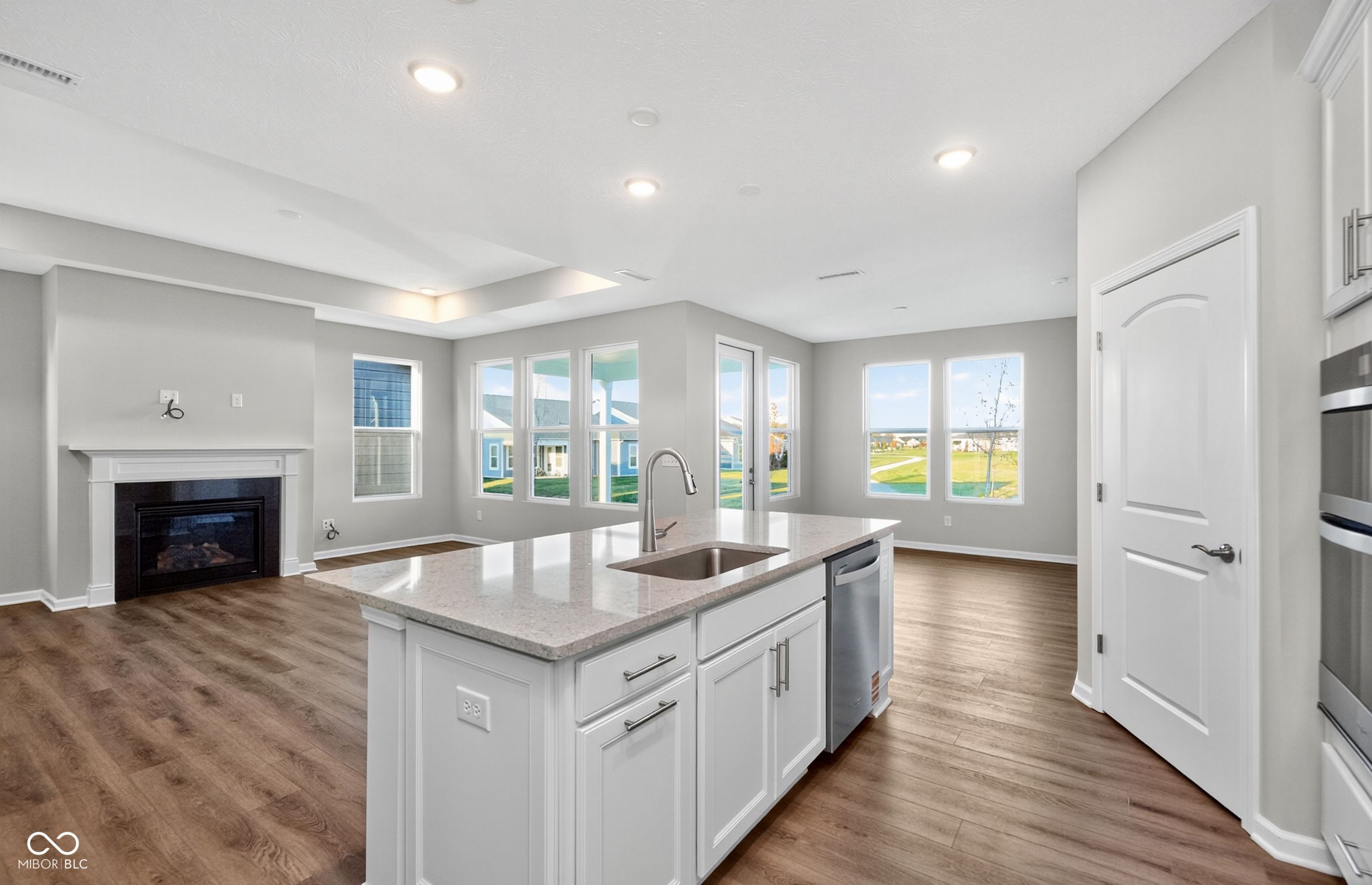 Discover the charm of the Mystique floorplan by Pulte Homes, available in the sought-after Kimblewick by Del Webb, a distinguished age-restricted community. This thoughtfully designed home offers a modern kitchen featuring white cabinetry, Calacatta Elysio 3cm Quartz countertops, built-in gas appliances, and a spacious island perfect for cooking and gathering. The kitchen flows effortlessly into the gathering room with tray ceiling and fireplace and cafe dining area, creating an open and inviting space for daily living and entertaining. Step outside to the covered patio, ideal for outdoor relaxation or hosting guests. The luxurious owner's suite is a private retreat, complete with a tiled shower, double-sink vanity, and a generous walk-in closet. Versatility is key with the flex room with doors situated just off the foyer, this space can easily be transformed into an extra bedroom, a quiet study, or a home office, catering to your specific needs. Additional bedroom with convenient full bath is located in the front home to provide separation from the Owner's Suite. Luxury vinyl plank flooring spans the home, combining durability with timeless beauty. The HOA includes full cable and high-speed internet in the monthly dues, offering exceptional value and added convenience for residents in this community. The 13,000 sq. ft. clubhouse serves as the community's social and recreational hub, featuring both indoor and outdoor pools, patio lounge areas, and a range of fitness options including a state-of-the-art gym, tennis and pickleball courts, and a golf simulator. Outdoor enthusiasts will appreciate the trails, parks, and activity spaces that promote community connection and exploration. Conveniently located south of 151st Street, Kimblewick offers luxury living, nature's tranquility, and easy access to the neighborhood's amenities. Photos of similar model.