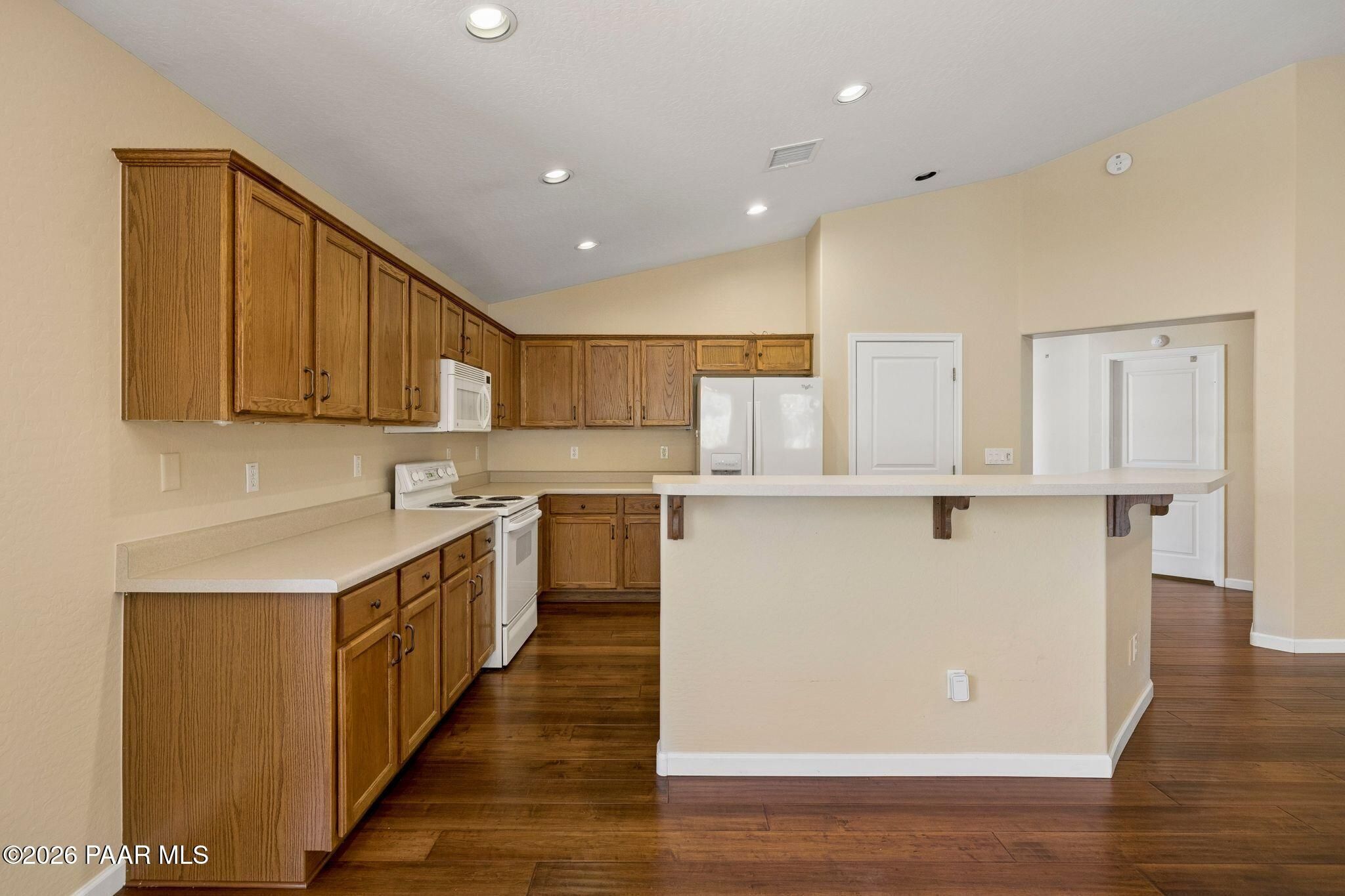 - Ceiling Fan(s), Kitchen/Dining Combo, Laminate Counters, Living/Dining Room, Single Living Level, Primary Downstairs, Pantry, High Ceilings, Wired for Sound, Vaulted Ceiling(s), Walk-In Closet(s), Washer/Dryer Hookup