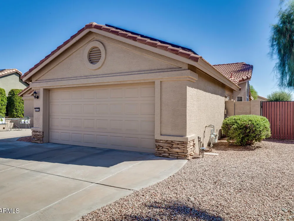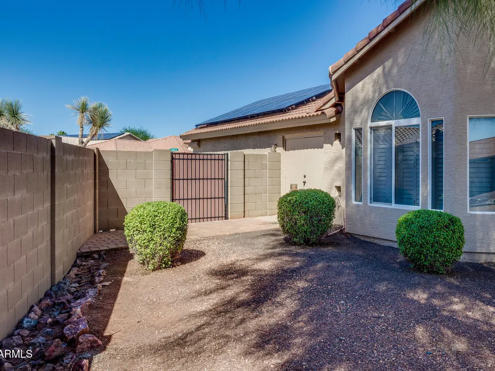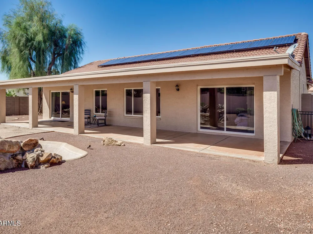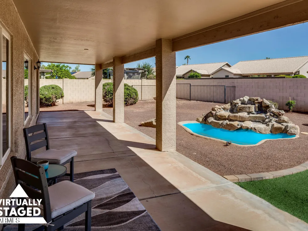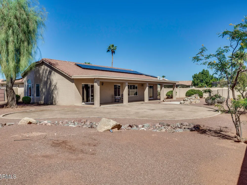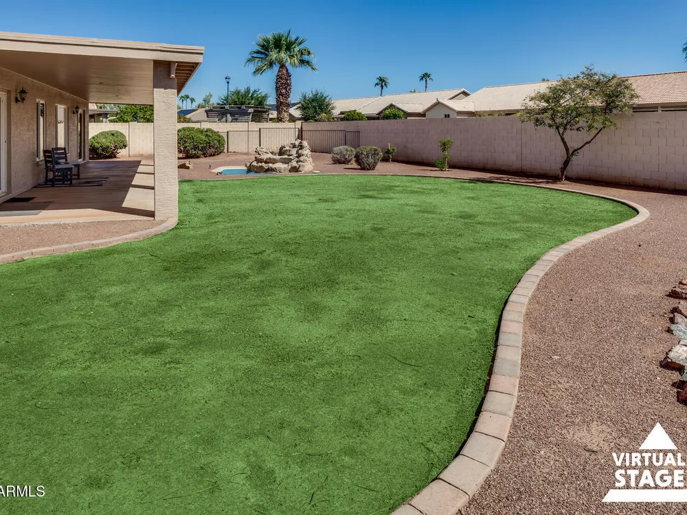 Enjoy luxurious resort-style living in PebbleCreek's active retirement community either year-round or as a second home in the sun. Ideal location close to shopping, dining, and only 25 miles to Sky Harbor Phoenix Airport, this highly sought-after location welcomes you with stately palms at the guarded gate entrance. Welcome friends upon arrival at the front courtyard of the newly painted exterior, and enter into the soaring great room perfect for a seating area, library, and formal dining entertainment. Show off brand-new stainless steel appliances in the kitchen and newly remodeled bathrooms, or immerse yourself with surround sound while watching a movie in the family room. Have a hobby that requires a workshop? Create to your heart's desire in the temperature-controlled hobby room, just inside the garage, with a newer HVAC in 2024. With OWNED solar, your energy costs are significantly reduced! Out back, relax in the shade under the extended patio and listen to the soothing sounds of the water feature. Turn this backyard into a grill master's dream with plenty of space to design your outdoor kitchen or add a pool for private swimming. On a pie-shaped, large lot, there's plenty of room to make the space fit your outdoor needs. The side gate is designed to drive a golf cart through and park behind for easy access. Ride the golf cart to the Clubhouse amenities of golf, pickleball, tennis, swimming, and so much more! Or walk to the neighborhood park, adjacent to the home, with room for the dog to enjoy the grassy lawn, or for you to play horseshoes or bocce ball with friends. With a club for every interest, you'll easily meet your new friends in PebbleCreek.