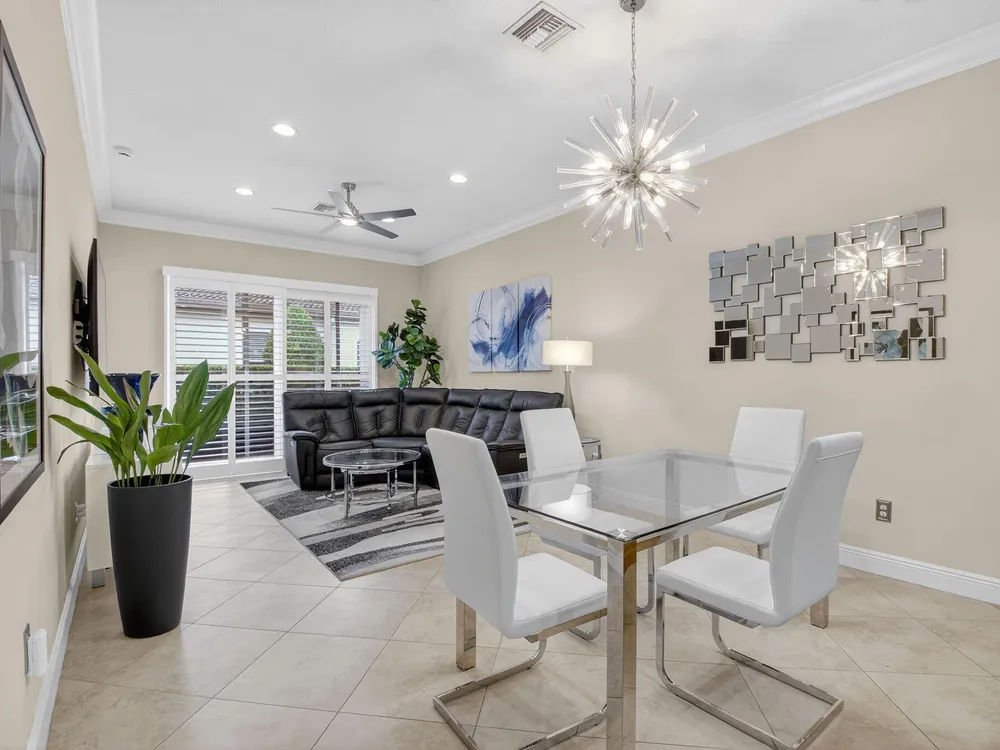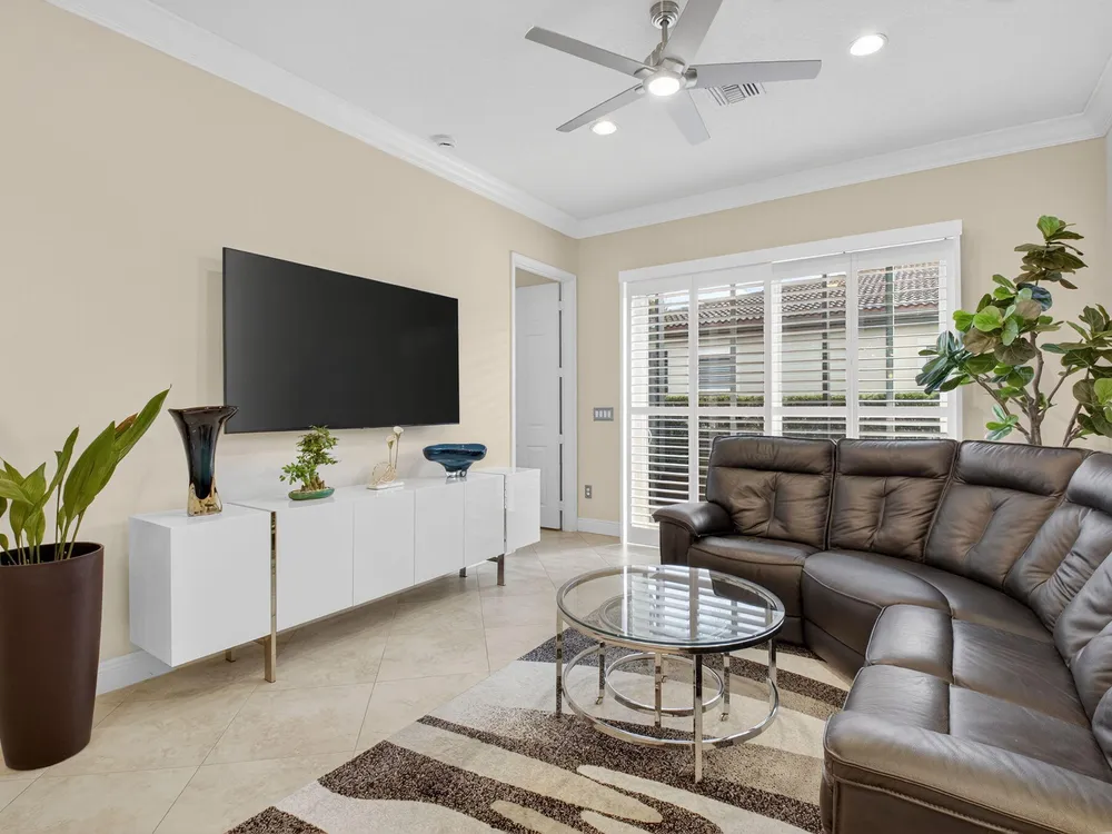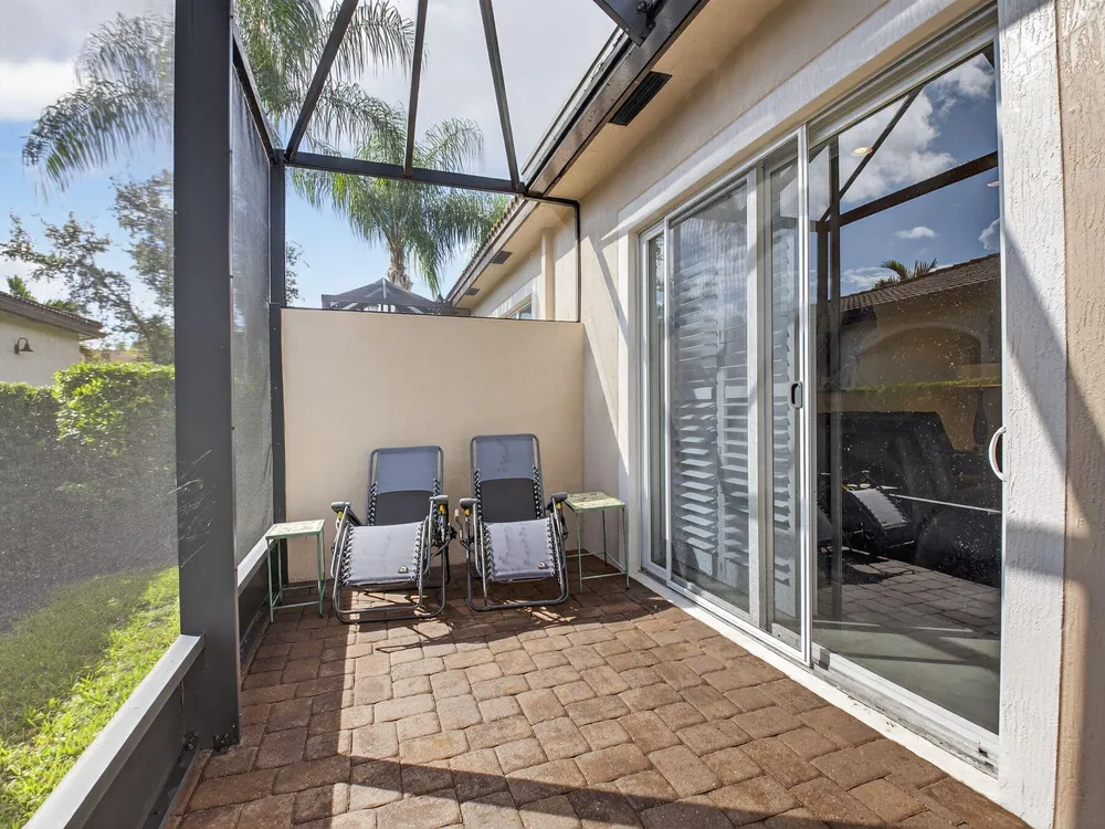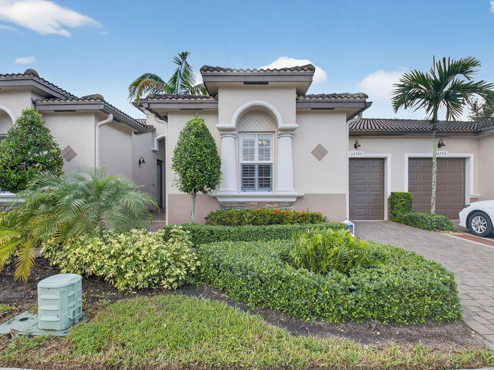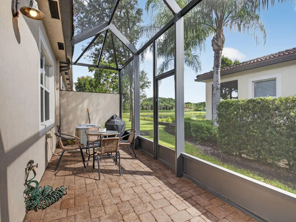 Move-in ready 2 bedroom/2 bath and den and 1 car garage ''Sortino'' villa.Den has closets so can be used as 3rd bedroom. This upgraded beauty shows like new. Wood kitchen cabinetry, granite counters and backsplash, new French 4-door refrigerator, new dishwasher, neutral tile flooring throughout, crown molding, plantation shutters, designer fans and fixtures, frameless showers, new smoke detectors, closet built-ins, garage shelving, upgraded gutters,extended lanai with beautiful water views to enjoy your S. Florida lifestyle.Villaggio Reserve is an active 55+ community with a 38,000 s1 ft clubhouse, resort style pool, lap pool, kiddie pool, jacuzzi, cafe, exercise room, clubs, 6 pickleball courts, 5 tennis courts and 2 bocce ball courts.Come and live your best life!