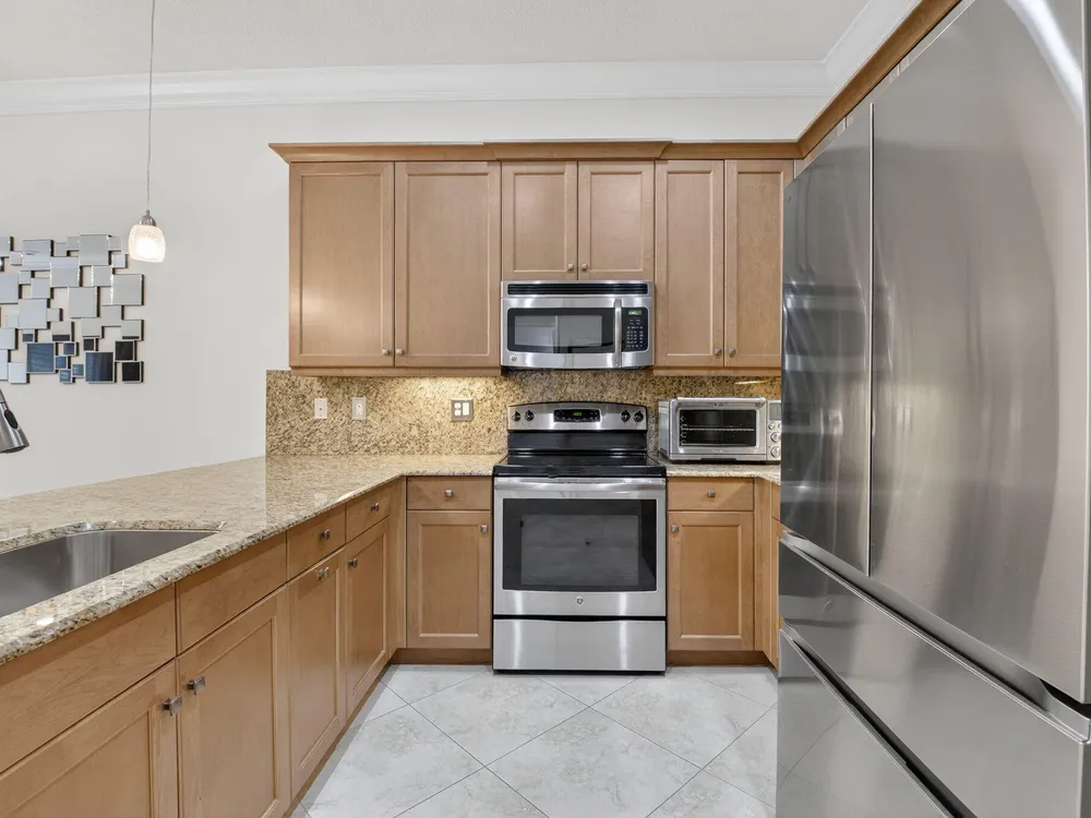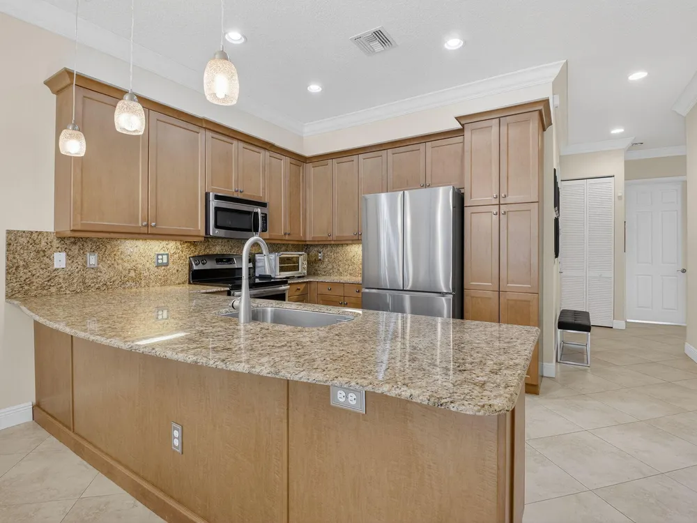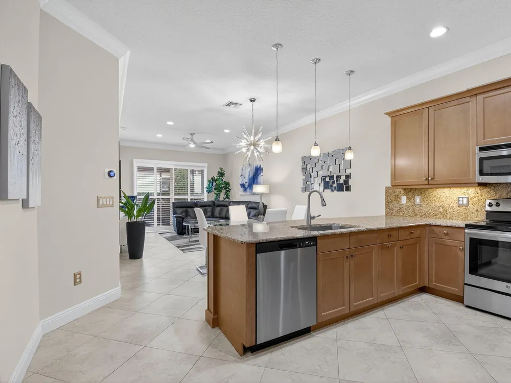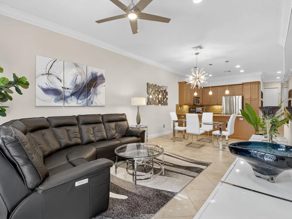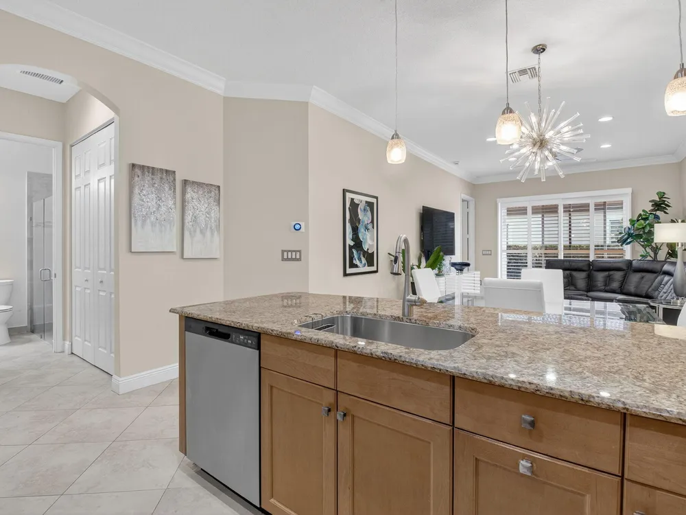 Move-in ready 2 bedroom/2 bath and den and 1 car garage ''Sortino'' villa.Den has closets so can be used as 3rd bedroom. This upgraded beauty shows like new. Wood kitchen cabinetry, granite counters and backsplash, new French 4-door refrigerator, new dishwasher, neutral tile flooring throughout, crown molding, plantation shutters, designer fans and fixtures, frameless showers, new smoke detectors, closet built-ins, garage shelving, upgraded gutters,extended lanai with beautiful water views to enjoy your S. Florida lifestyle.Villaggio Reserve is an active 55+ community with a 38,000 s1 ft clubhouse, resort style pool, lap pool, kiddie pool, jacuzzi, cafe, exercise room, clubs, 6 pickleball courts, 5 tennis courts and 2 bocce ball courts.Come and live your best life!