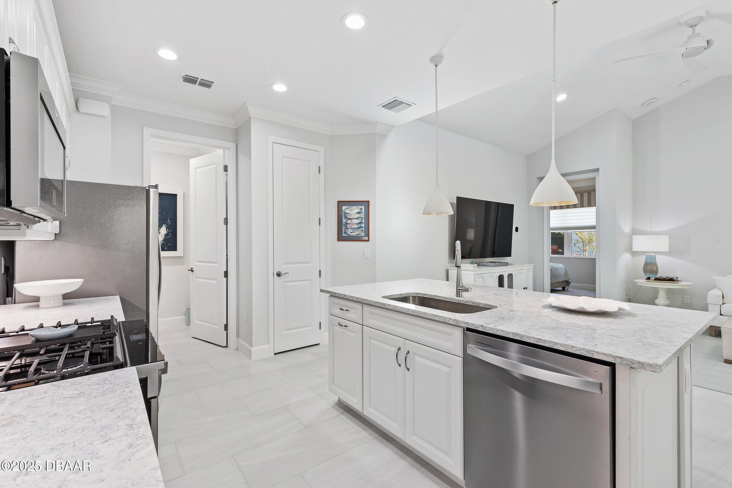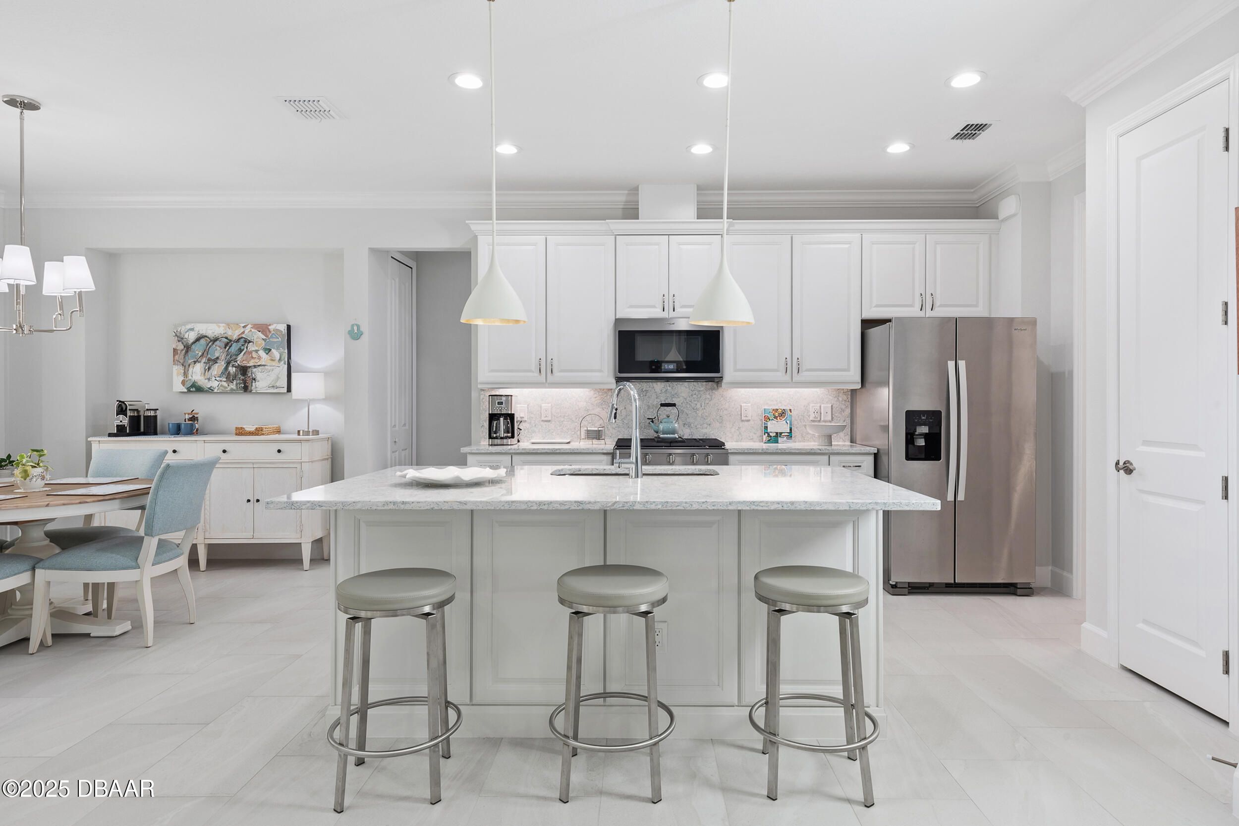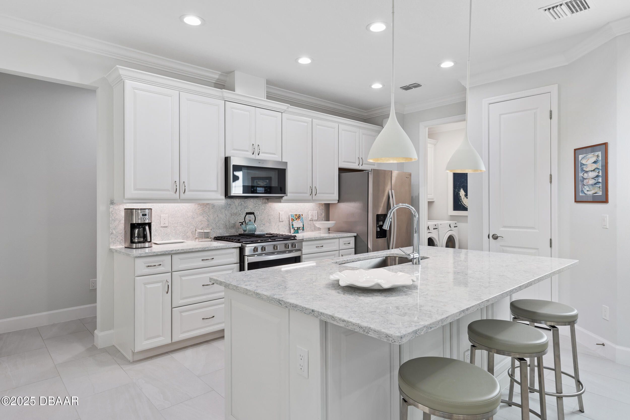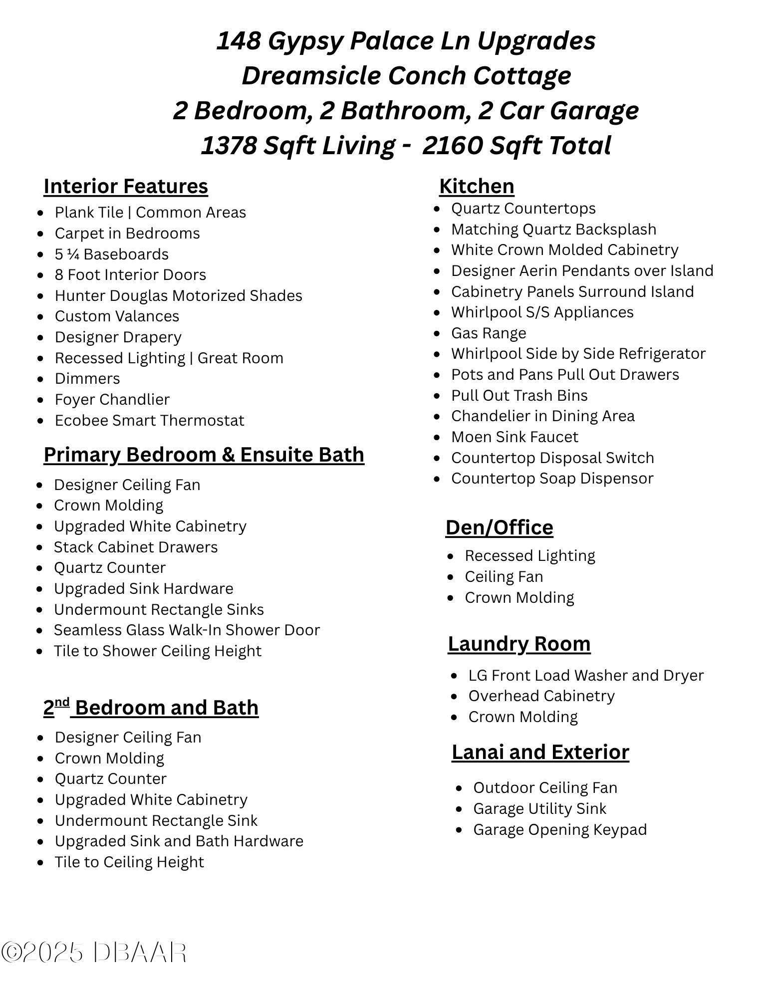 Welcome to this gorgeous Dreamsicle cottage, professionally designed with elegance, charm and coziness in mind. Adorned with Ethan Allen, Serena & Lily, Aerin pendants. Almost every aspect upgraded to highest level including plank tile flooring, upgraded carpet, hardware, fixtures, dimmers, fans in every room and porch. Ecobee Smart Thermostat, Recessed lighting, Hunter Douglas motorized shades and custom valances on every window. The vaulted living room ceiling inside this very well appointed cottage, chefs delight kitchen, 42'' white cabinets with quartz backsplash & matching quartz countertops might just make you pinch yourself. Luxury expands to the Laundry Room as well with brand new front load washer/dryer, upgraded upper cabinets and Ethan Allen coastal artwork in place. If that's not enough you'll love the primary bedroom & ensuite spa bath, tile to ceiling, seamless glass shower door. Your 55+ life will be social and beyond fun, in Latitude Margaritaville everyday.