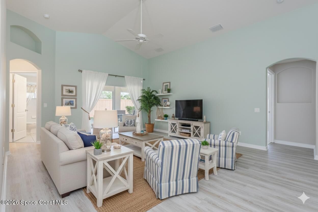 Nestled on a premier lot in Grand Isle 55+ gated community, offers a heated pool & spa, fitness center, pickleball & bocce/tennis courts, plus a full calendar of social events like movies, trivia nights, concerts! From the neatly edged planting beds, every detail has been curated for a lasting first impression. This home is fully equipped with accordion hurricane shutters.Step inside to an expansive, modern floor plan with vaulted ceilings for effortless living and entertaining, the heart of the home features:Gourmet Kitchen has solid wood cabinetry overlooking the living areas, ensuring the chef is always part of the conversation.The owner's suite serves as a private sanctuary. A double vanity with ample storage and walk-in shower and expansive walk-in closet. A dedicated hallway leads to a spacious guest bedroom and a beautifully appointed full bath. Transition effortlessly to the tiled sun room, perfect for entertaining. The garage is oversized to fit large vehicles.