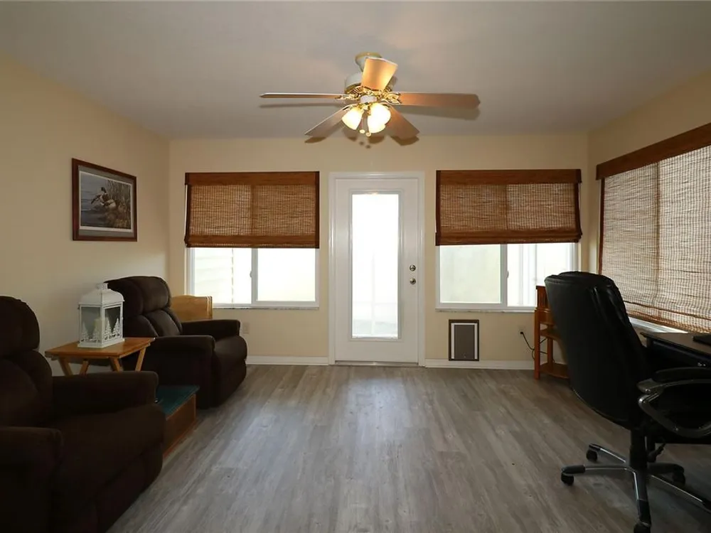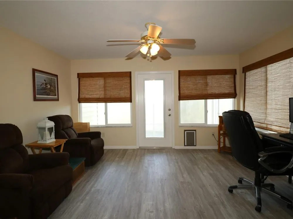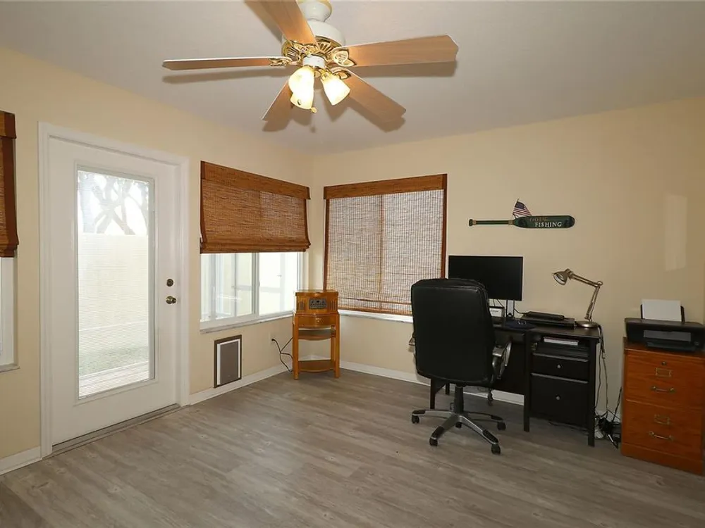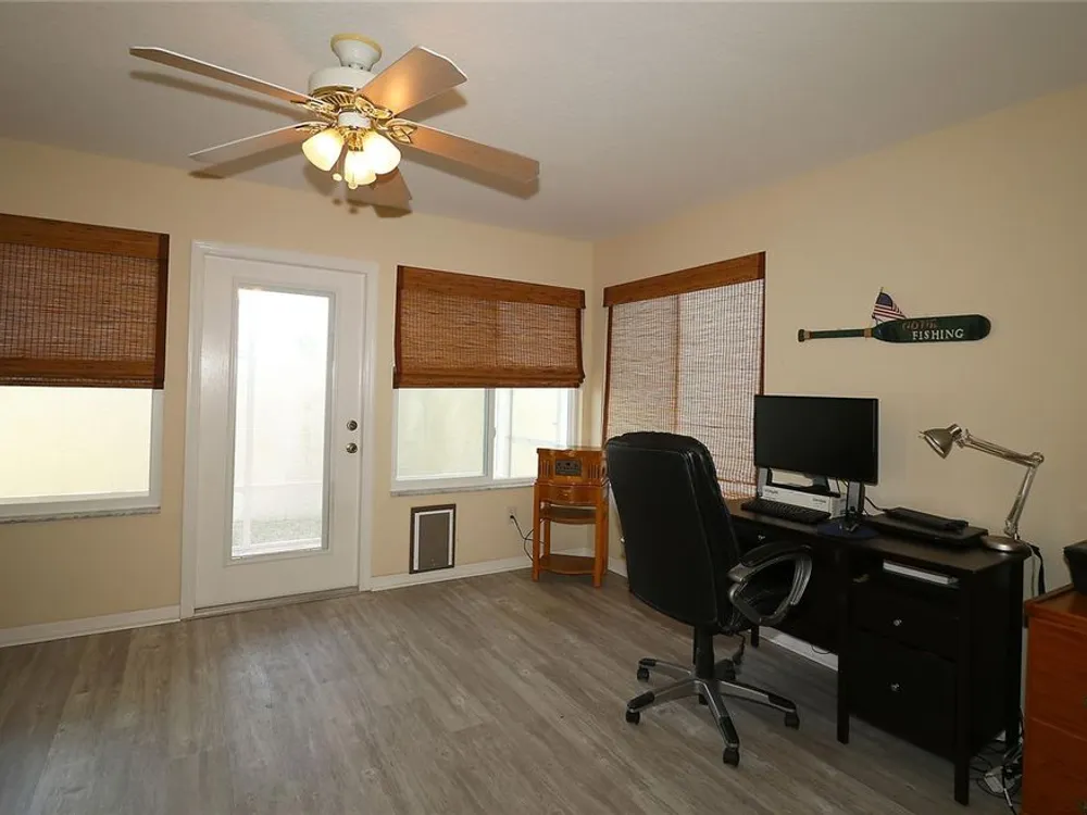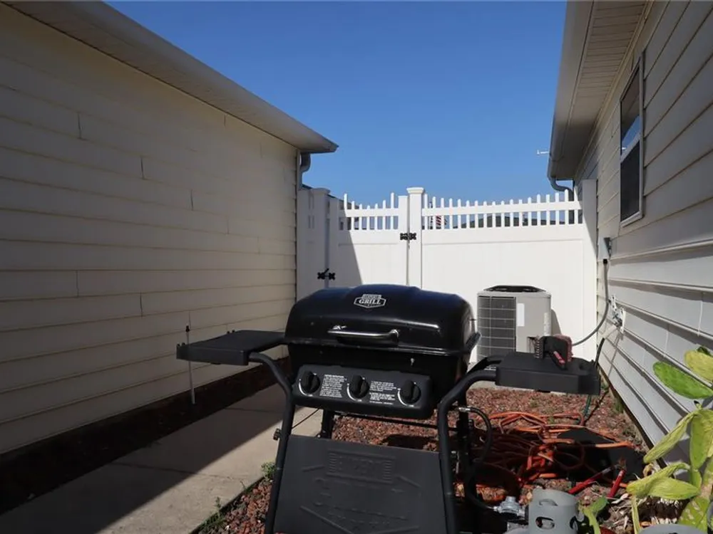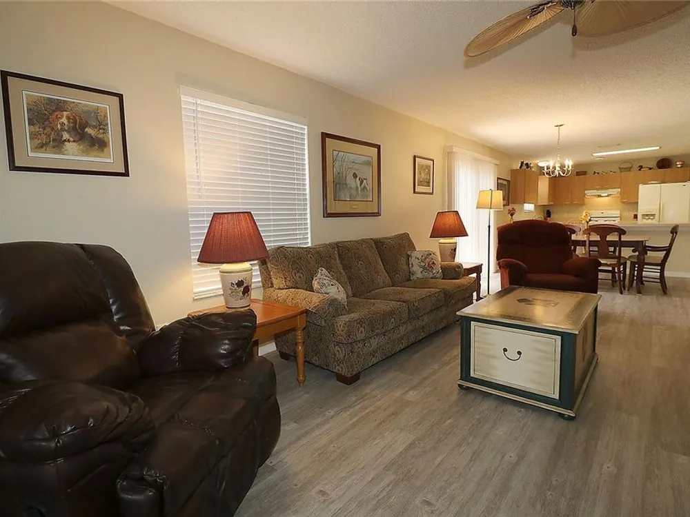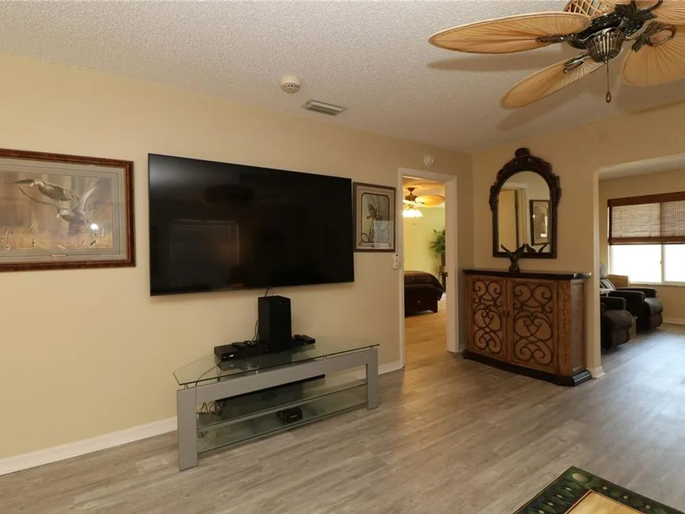 Welcome to this charming 2/2 Marathon Courtyard Villa in the desirable Villas Escondido, perfectly situated near everything The Villages has to offer! You’re just minutes from the Savannah Center, Glenview Country Club, Nancy Lopez Golf Course, and both Spanish Springs and Lake Sumter Landing town squares. Medical offices and The Villages Hospital are also close by for added convenience. Inside, you’ll immediately notice the spacious feel thanks to a thoughtful stretch that added a 12x15 office/den — perfect for working from home, hobbies, or an extra sitting area. The home features beautiful new luxury vinyl plank flooring throughout, with tile in the bathrooms. The primary suite has also been expanded and now boasts two walk-in closets and a gorgeous custom shower. (Primary bedroom furniture does not convey.) The guest bedroom comes complete with a queen bed, dresser, and end tables, and is conveniently located near the second bath with a tub/shower combo. This home comes mostly furnished, including a 75” TV, sofa, recliner, dining set, and more — just bring your personal touches. The kitchen features a gas range and plenty of counter space, and the laundry is tucked into the oversized 1.5-car garage. Enjoy mornings or evenings on the screened lanai overlooking your private, walled courtyard — perfect for pets or gardening. Major updates include: Roof (2015), HVAC (2015), and Hot Water Heater (2022). Best of all, the BOND IS PAID! Maint $208.89, Fire $320.71, Taxes $1563.64.