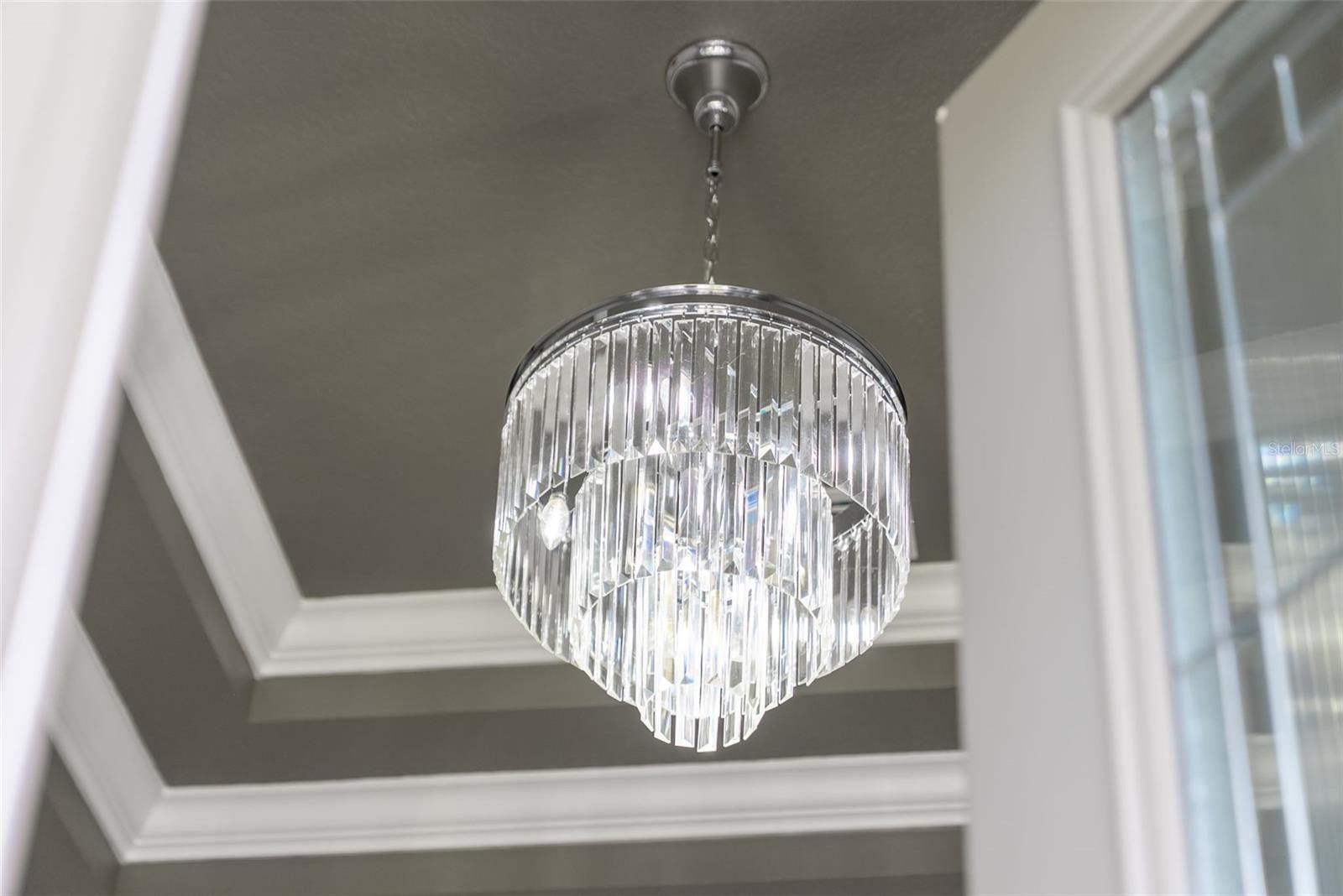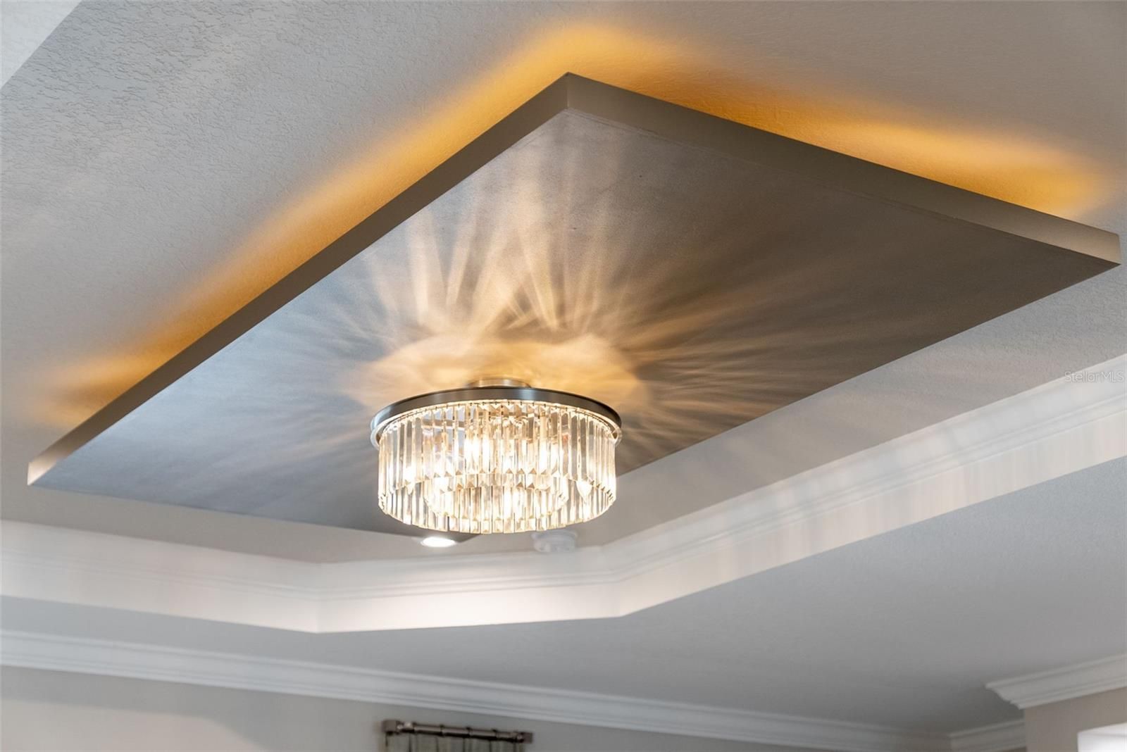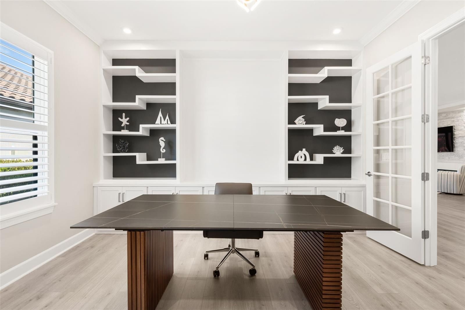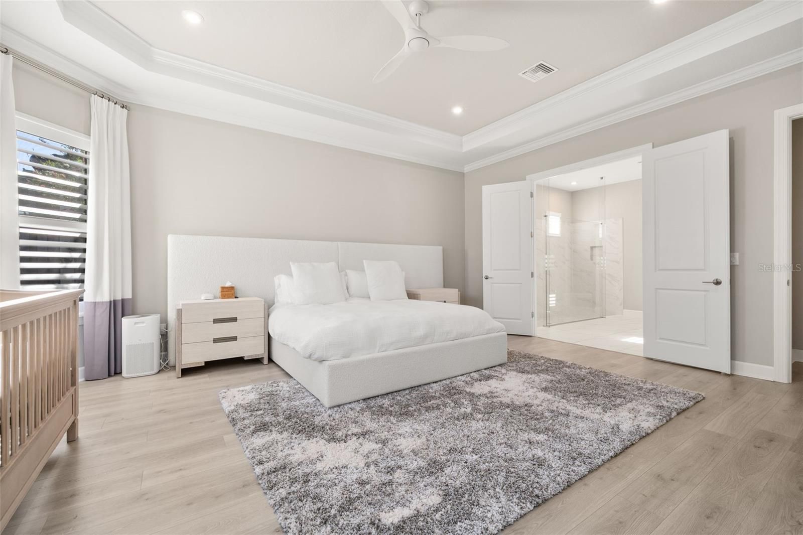 - Built-in Features, Ceiling Fan(s), Crown Molding, Eat-in Kitchen, High Ceilings, Living/Dining Room, Open Floorplan, Main Level Primary, Solid Surface Counters, Solid-Wood Cabinets, Thermostat, Tray Ceiling(s), Walk-In Closet(s)