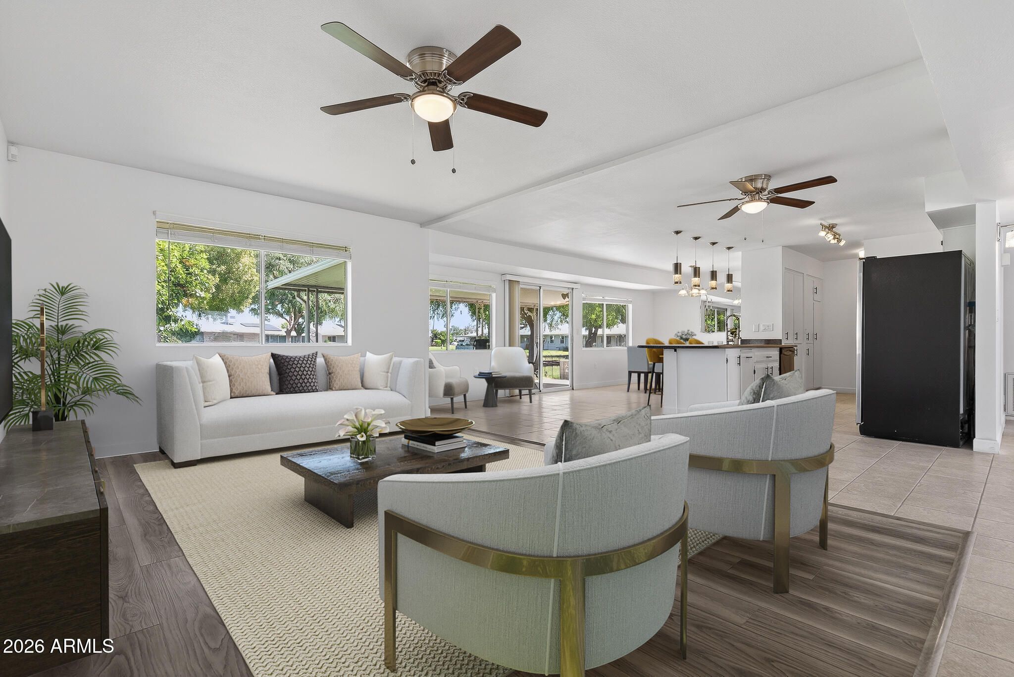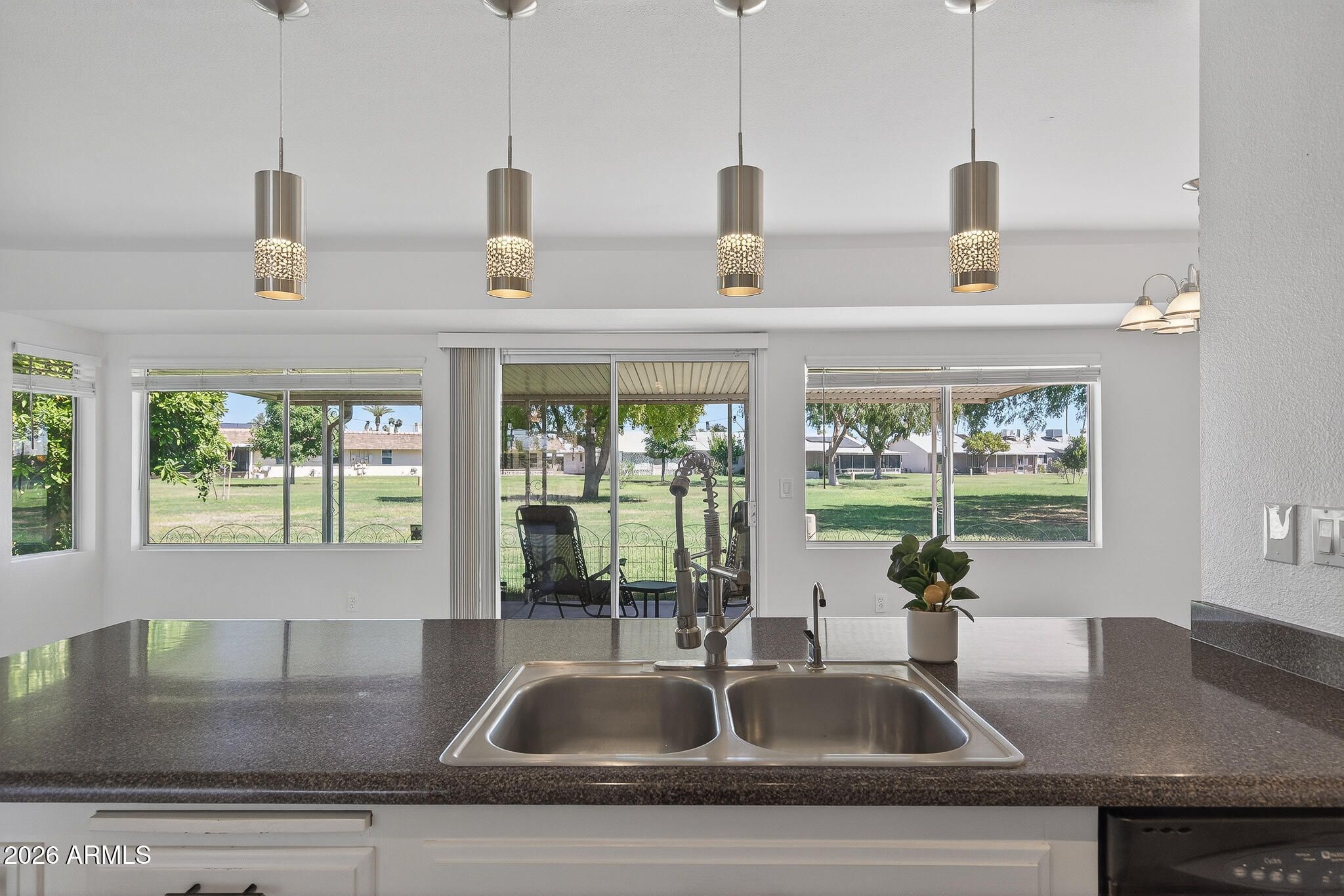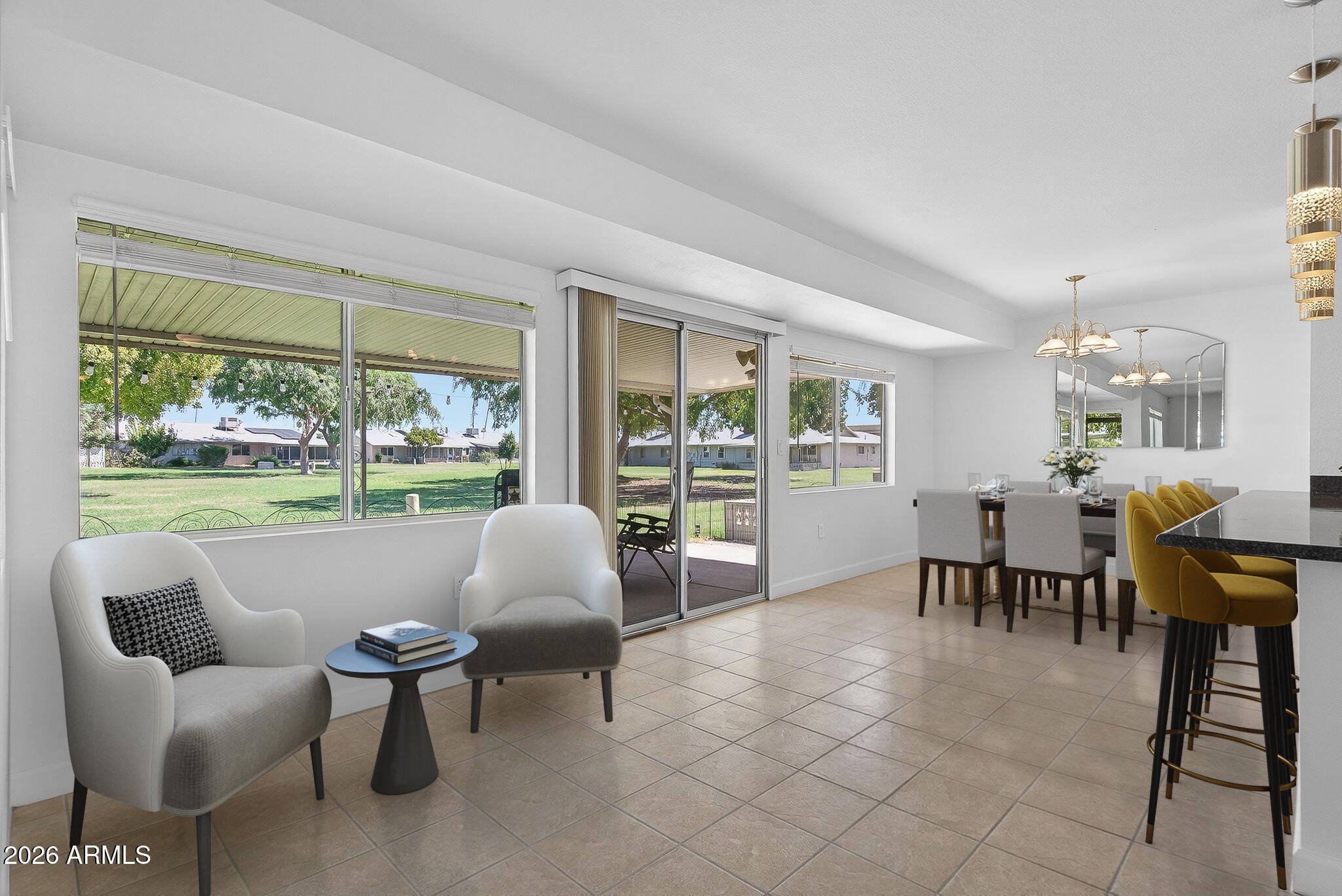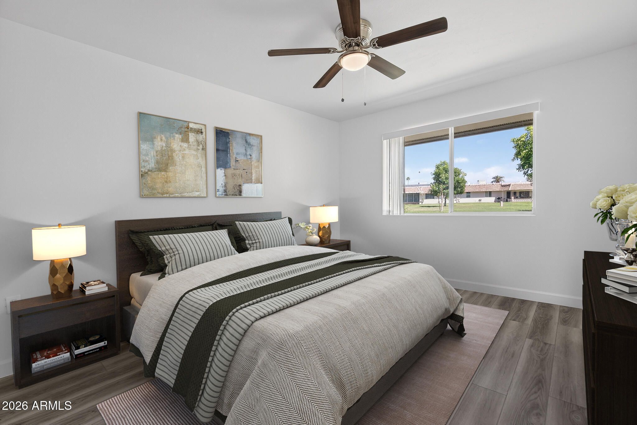 Located in Sun City, a vibrant active adult community, this amenity-rich neighborhood offers endless activities, multiple golf courses, resort-style pools, social clubs, and a variety of sports. This inviting home features 2 bedrooms, 2 bathrooms, and a 2-car garage, with bright, neutral tones throughout. The kitchen includes a breakfast bar accented by pendant lighting, perfect for casual dining. The spacious primary suite offers a walk-in closet and a private ensuite bath. Bedroom 2 provides direct access to the front patio, creating a welcoming space for guests or relaxation.