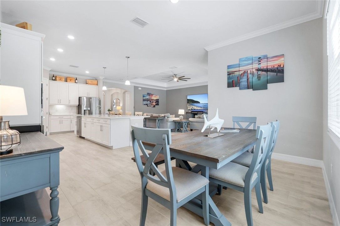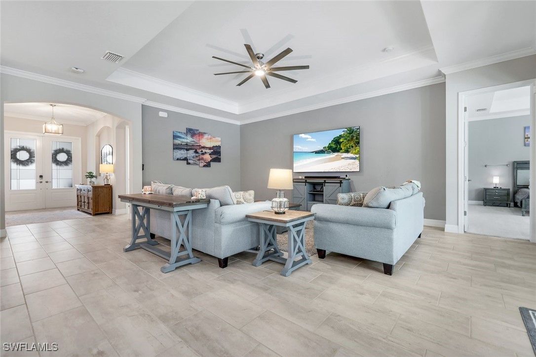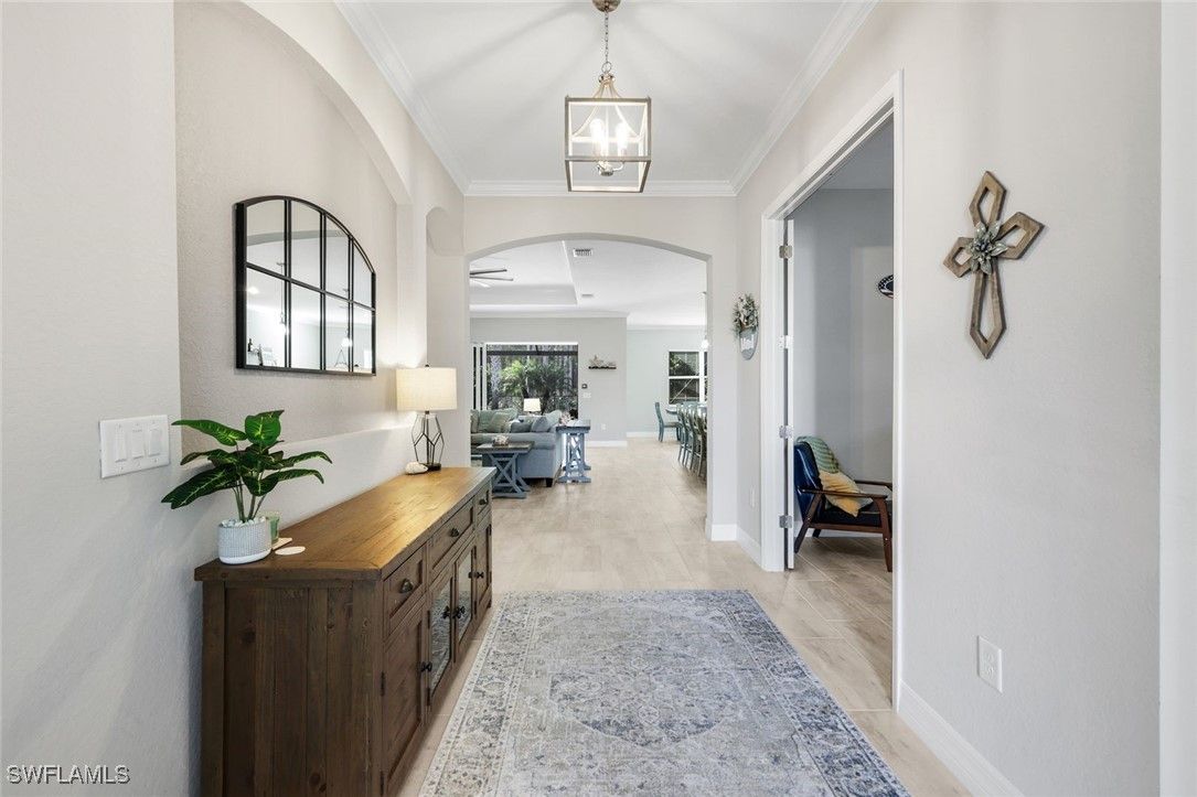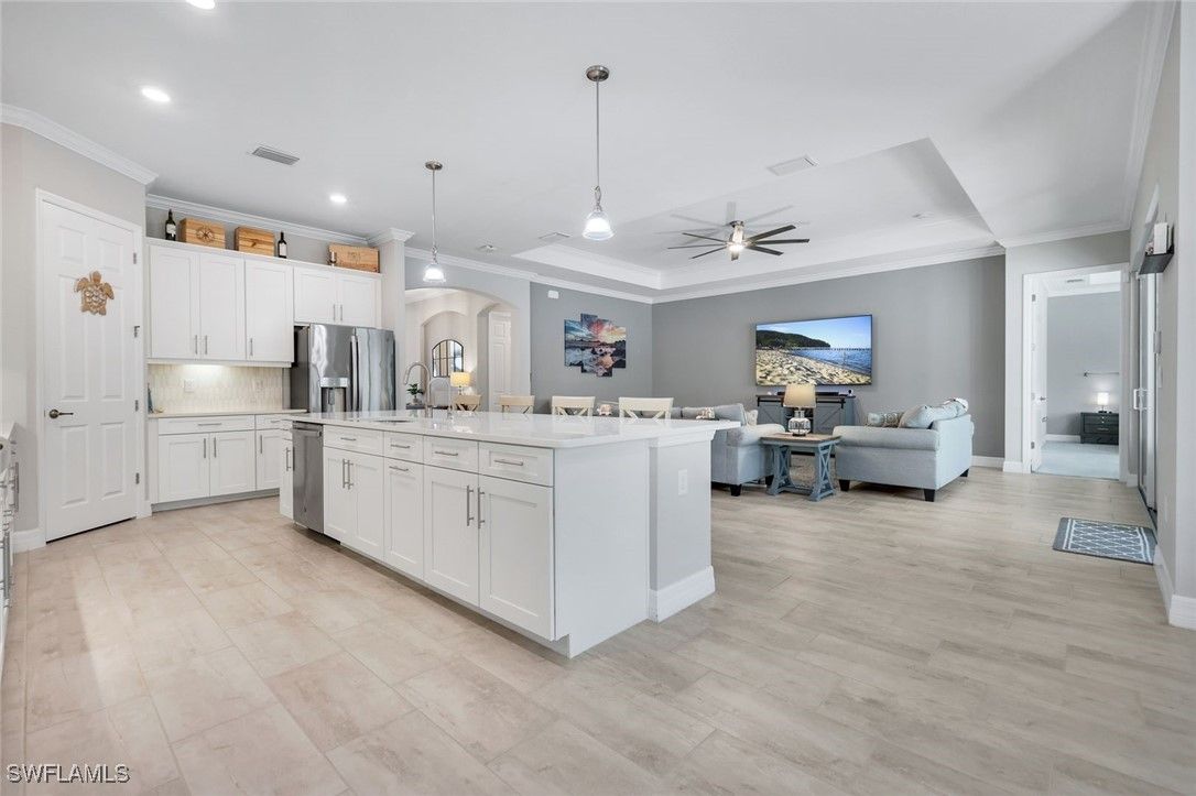 Welcome to 14841 Blue Bay Circle, an EXCEPTIONAL 3 Bedroom + Den, 3 Bath, 3 Car Garage residence located in the amenitie rich community WildBlue. Situated on a desirable Pie-shaped lot offering enhanced privacy and outdoor space, this FURNISHED Summerville floorplan showcases MODERN design, thoughtful upgrades, and seamless INDOOR-OUTDOOR living. The open-concept layout features a CHEF’S KITCHEN with an oversized QUARTZ island, Natural gas cooktop, and Stainless steel appliances, ideal for both daily living and Entertaining. The SPACIOUS living area flows effortlessly to the lanai, where a Heated Pool and Spa overlook beautifully maintained landscaping. The primary suite offers a tranquil retreat with grand master bath and generous walk-in closet. The home features AIR CONDITIONED 3 car GARAGE with epoxy flooring, insulated garage doors, and additional BUILD-IN STORAGE for optimal functionality. A whole-home WATER FILTRATION SYSTEM along with reverse osmosis ensures exceptional water quality throughout the residence. The home is equipped with hurricane-Impact Windows and slider doors, providing peace of mind and storm protection. The upgraded landscaping, complemented by a CUSTOM low-voltage Lighting system, enhances curb appeal and creates a Beautifully illuminated exterior setting. Residents of WildBlue enjoy access to 800 acres of freshwater lakes, private white-sand beache, spectacular lakeside pool and lap pool, dining, spa, fitness, tennis, pickle-ball and an array of boating and recreational activities, creating a lifestyle that is both luxurious and effortless.
