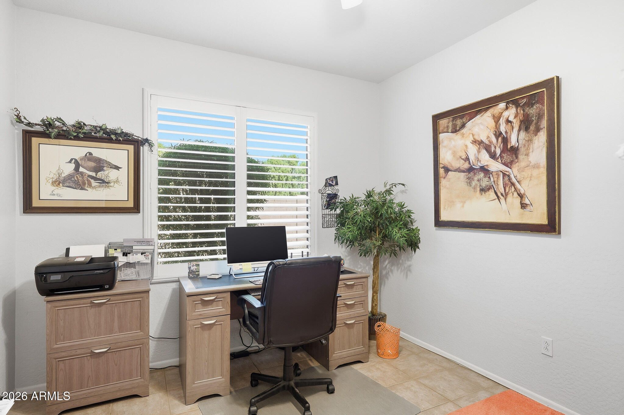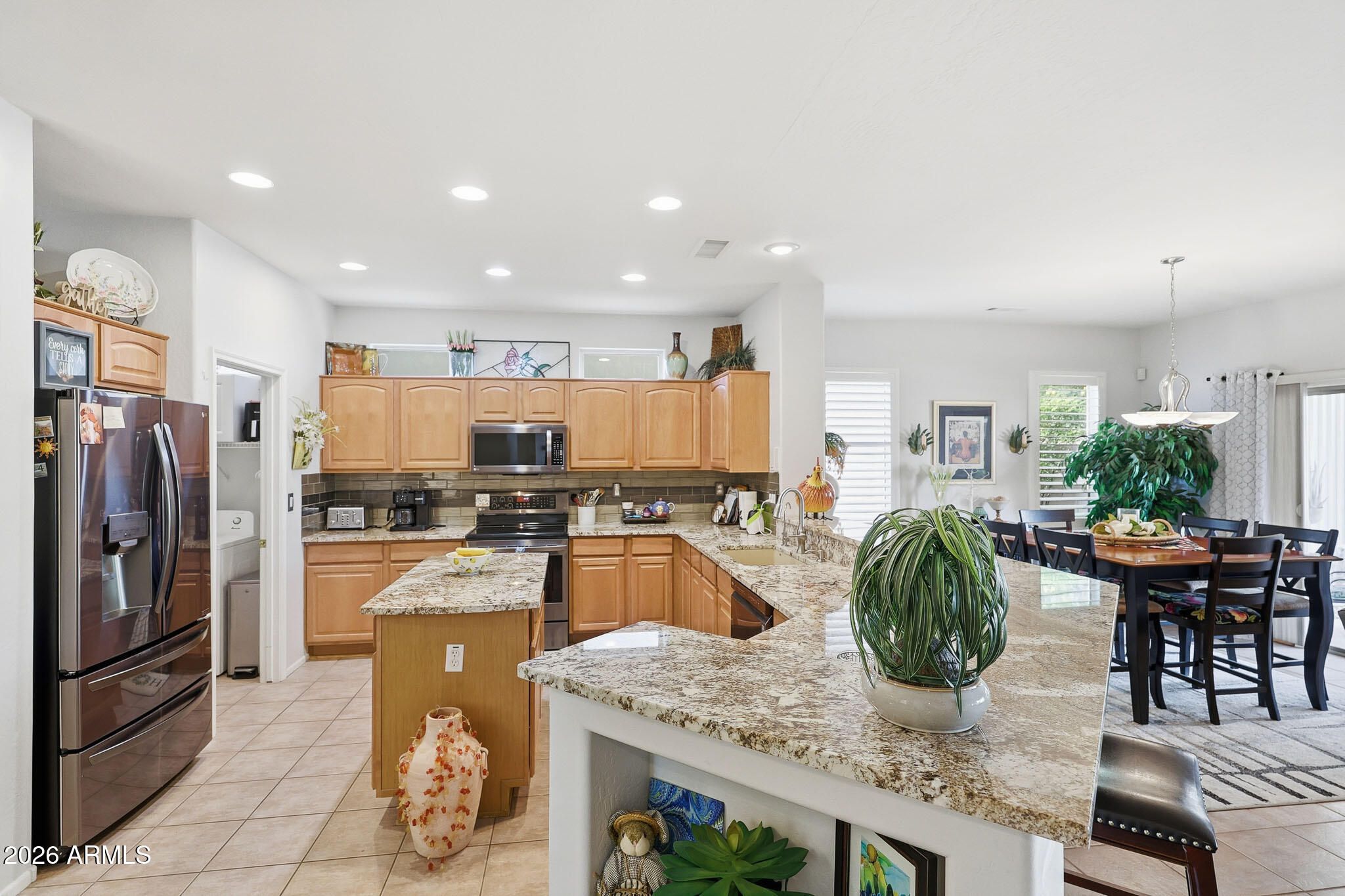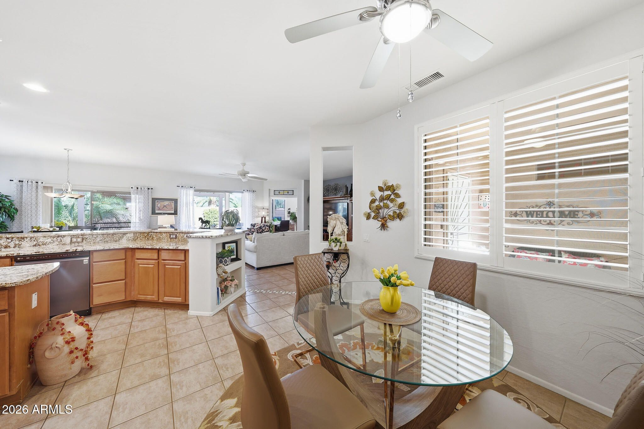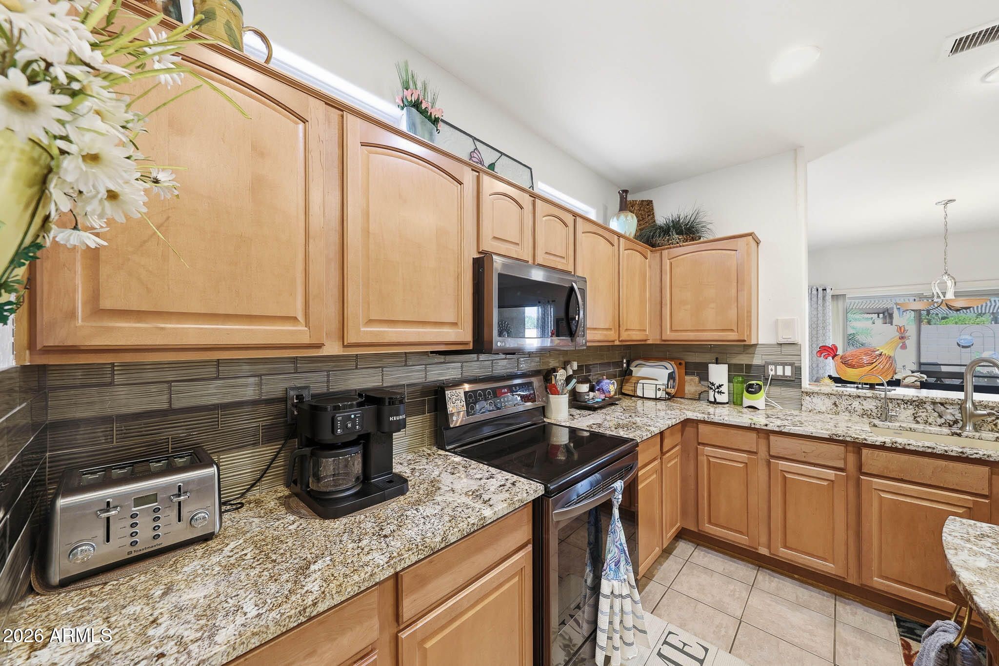 Welcome to this beautifully maintained Desert Rose floor plan located in the active adult community of The Grand. This move-in-ready home offers a bright and inviting layout with updated granite countertops in the kitchen and bathrooms, newer stainless steel appliances, and all-tile flooring throughout. The interior features plantation shutters and a water softener, with plenty of storage space in the garage plus newly applied cool decking on both the back patio and garage floors. Step outside to a private backyard surrounded by a full block wall and enhanced with newer landscaping and turf, creating a low-maintenance retreat perfect for enjoying Arizona living. Additional updates include PVC irrigation for peace of mind. This home is truly turnkey and comes fully furnished, making you Welcome to this beautifully maintained Desert Rose floor plan located in the active adult community of The Grand. This move-in-ready home offers a bright and inviting layout with updated granite countertops in the kitchen and bathrooms, newer stainless steel appliances, and all-tile flooring throughout. The interior features plantation shutters and a water softener, with plenty of storage space in the garage plus newly applied cool decking on both the back patio and garage floors. Step outside to a private backyard surrounded by a full block wall and enhanced with newer landscaping and turf, creating a low-maintenance retreat perfect for enjoying Arizona living. Additional updates include PVC irrigation for peace of mind. This home is truly turnkey and comes fully furnished, making your transition simple and seamless. Just bring your clothes and start enjoying all The Grand has to offer.