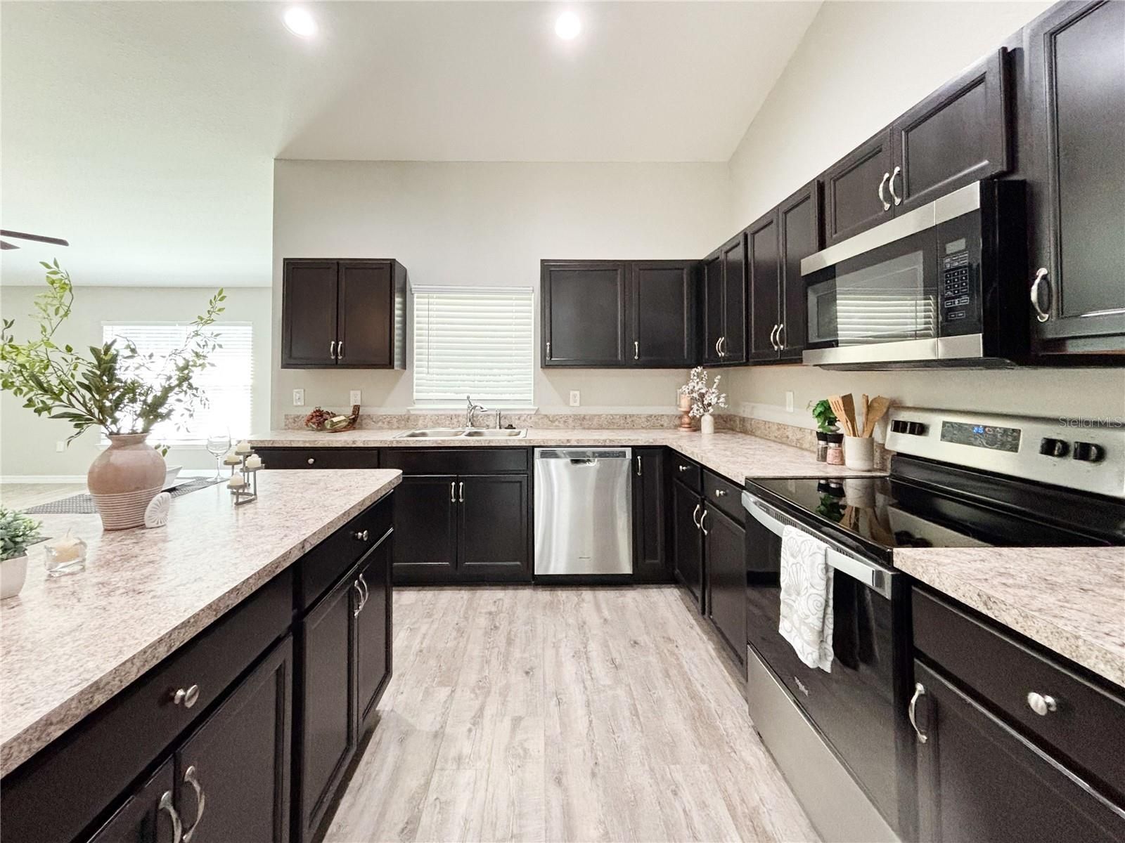 One or more photo(s) has been virtually staged. Welcome to your dream home! Backs open space, no rear neighbors, large yard! This stunning, newer 3-bedroom, 2-bathroom home, plus a versatile flex room perfect for a home office, playroom, exercise room or den, offers an exceptional opportunity for a first-time buyer. MOVE-IN READY and thoughtfully designed, this home is waiting for you to make it your own. As you step inside, you'll be captivated by the sleek, modern feel of the Luxury Vinyl Plank flooring that runs throughout the entire home. The spacious private office, featuring a vaulted ceiling, is bathed in natural light, creating an ideal space for work or study. The kitchen is truly a chef's dream, with elegant stone countertops and smart design features such as a lazy Susan in the cabinets, making organization a breeze. The primary suite serves as your personal retreat, featuring a luxurious en-suite bathroom with a walk-in shower boasting a frameless entry. The generous walk-in closet ensures plenty of room for all your belongings. Situated on a peaceful old golf course creating a Green Space in your backyard, the home provides ultimate privacy and scenic nature views from your backyard. With convenient access to I-75, you're just minutes away from everything Ocala has, including shopping, dining, and the world-renowned World Equestrian Center. Don't miss this fantastic opportunity to own this home! Schedule a showing today and make this beautiful property yours!